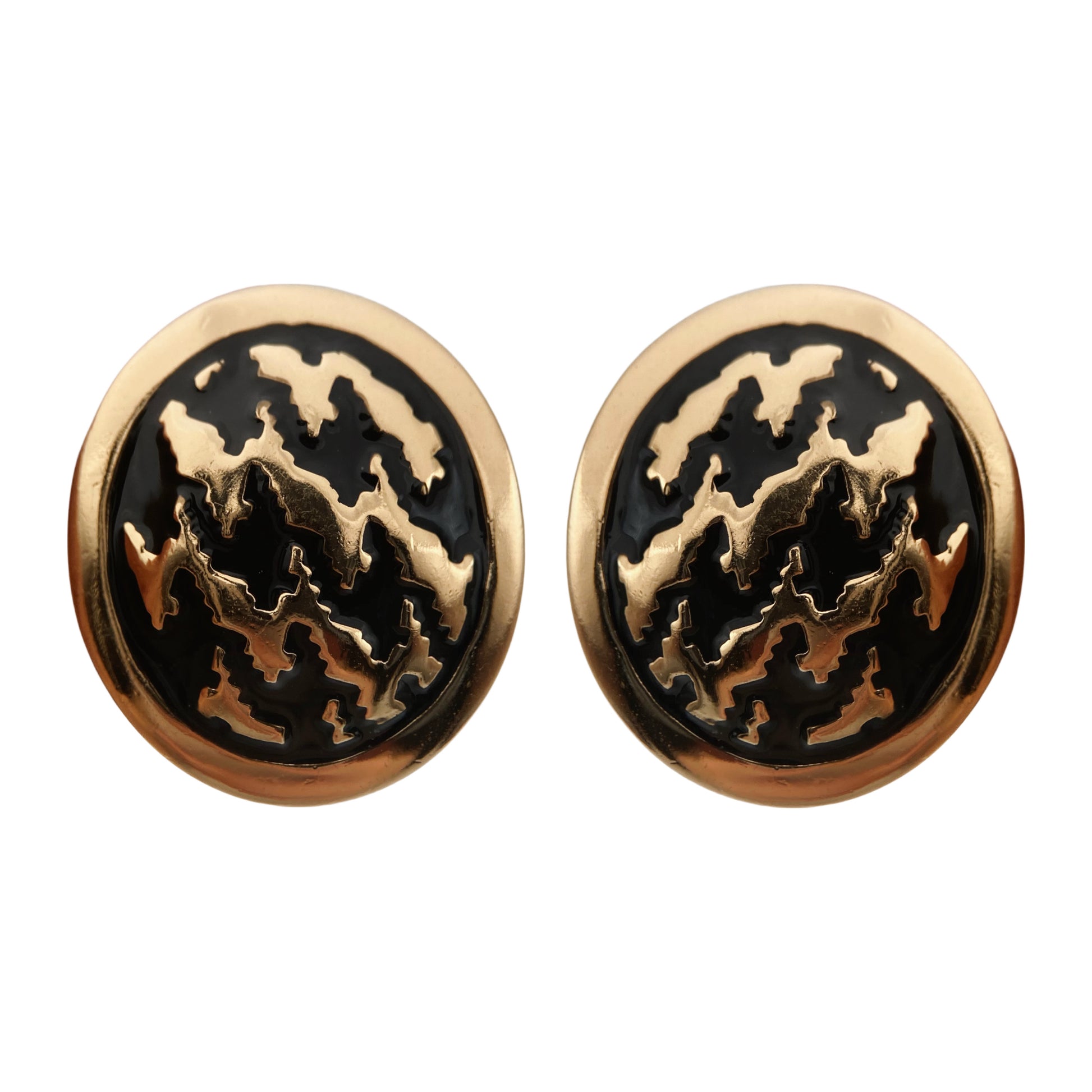The earrings are marked "Chr. Dior©" - a mark used from the late 1970s to the early 1990s, usually in collaboration with German manufacturers such as Grossé. These are round and massive earrings made of gold-plated metal with a black enamel insert, the pattern of which resembles abstract graphics.