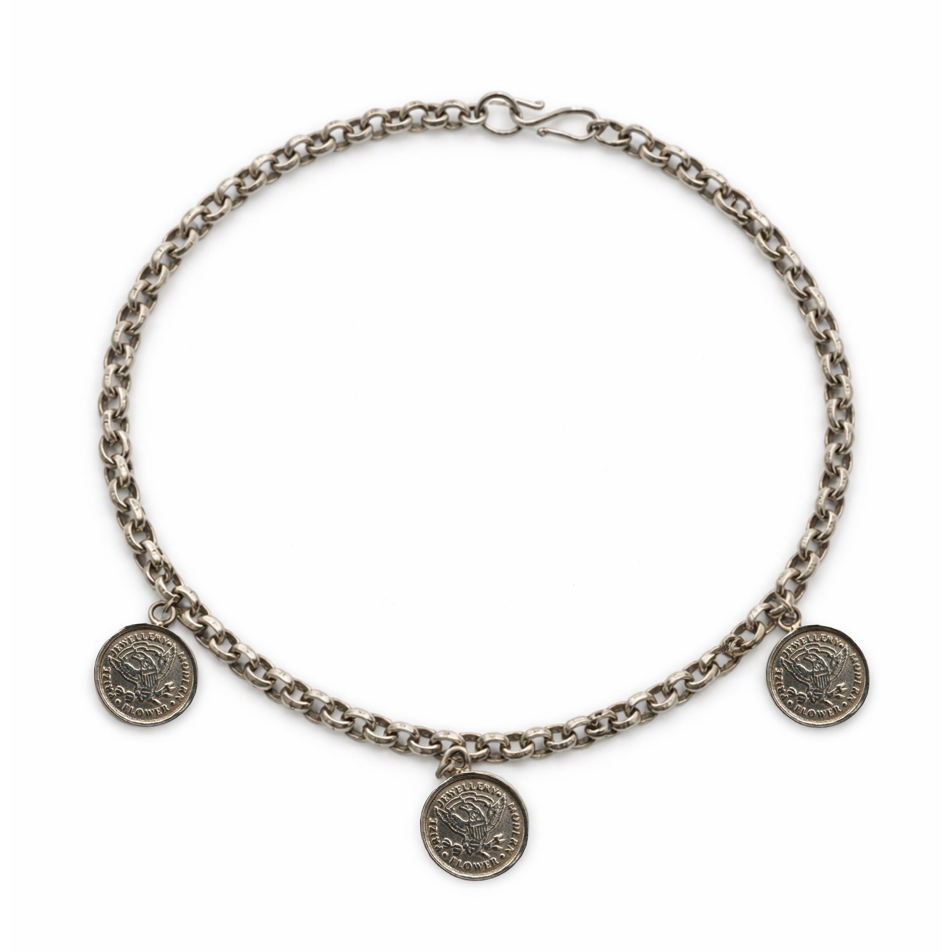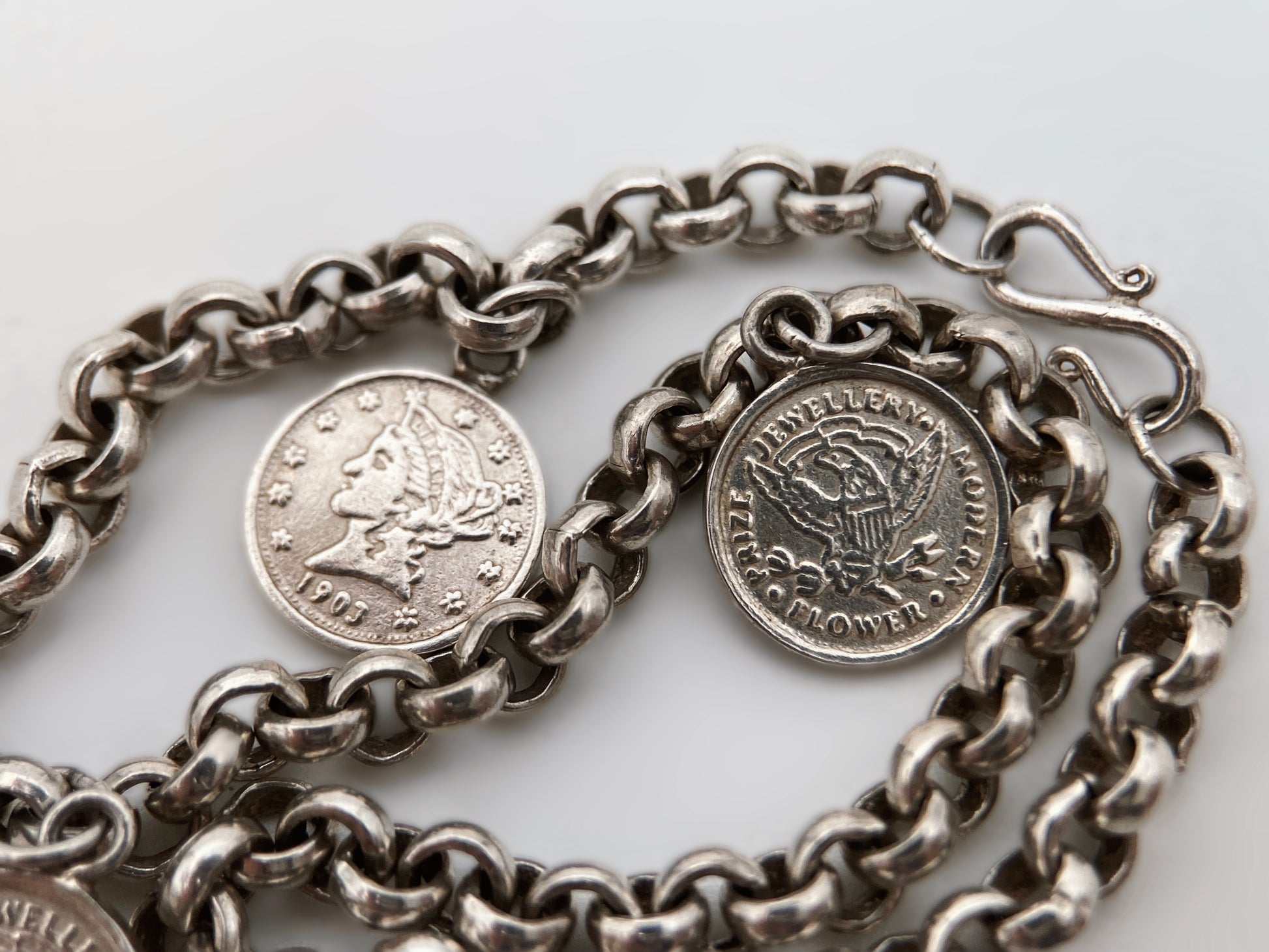 925 prabos sterlingo sidabro apyrankė, pagaminta JAV ir dekoruota trimis sidabriniais pakabukais su amerikietiškų monetų motyvais (Liberty Head ir Eagle). Tvirta rankų darbo grandinė ir klasikinis S formos kablio tipo užsegimas, įkvėptas istorinio dizaino, būdingas XX a. antros pusės amerikietiškiems papuošalams. Pakabukai – dekoratyviniai sidabriniai medaliai, sukurti pagal senųjų JAV monetų ikonografiją.
