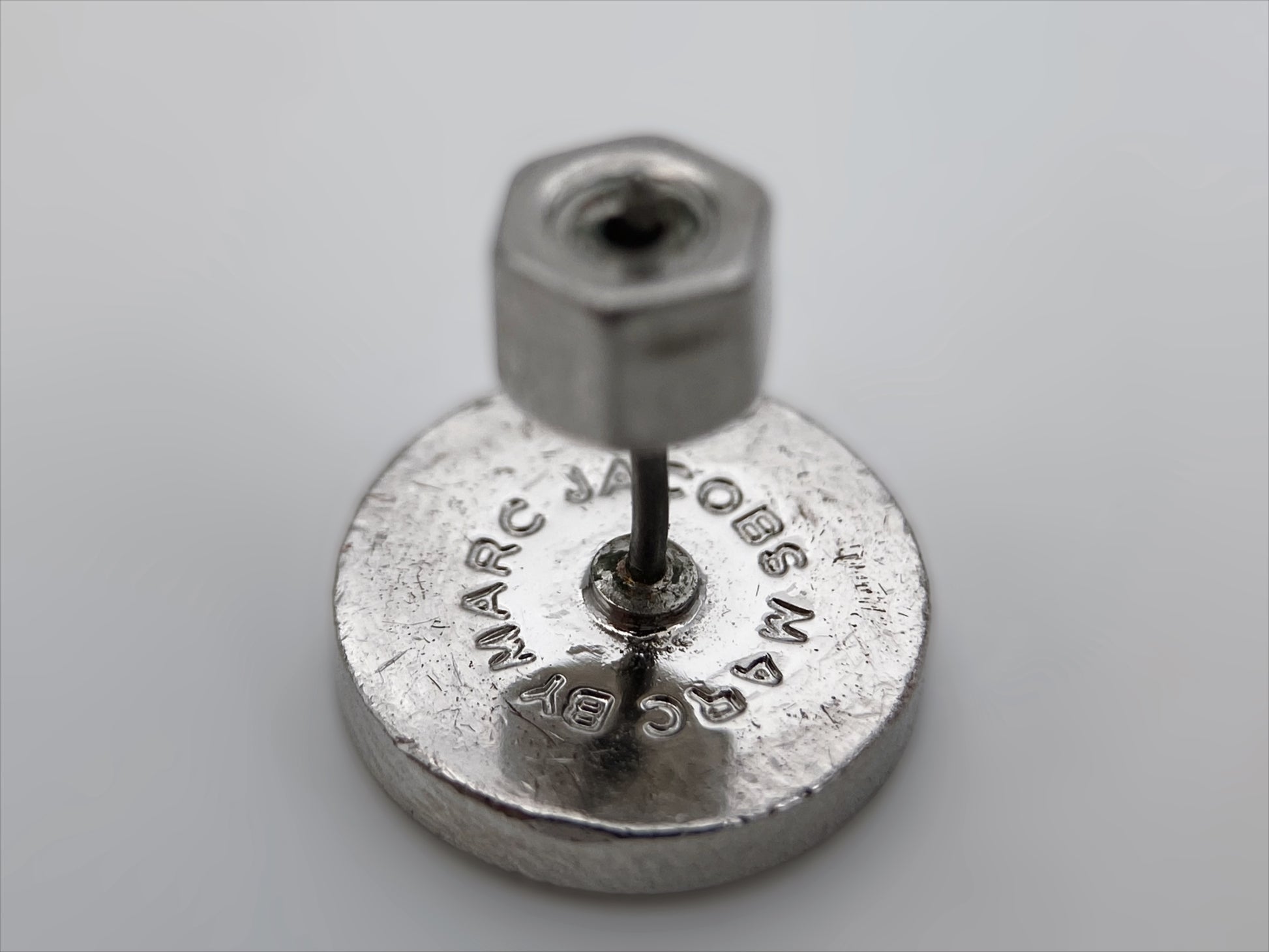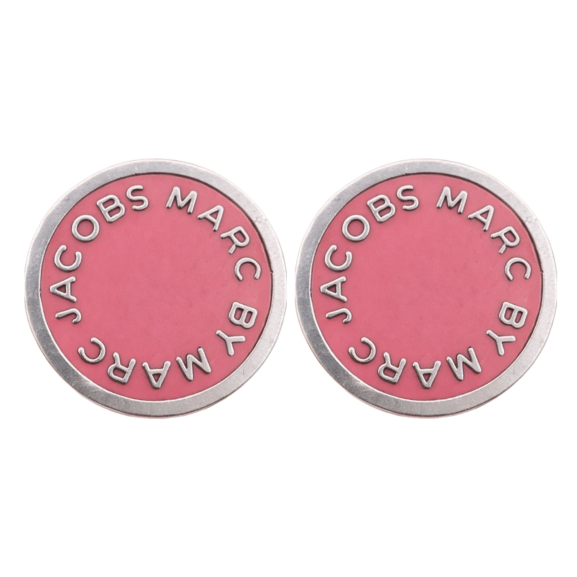 Stilingi “Marc Jacobs” auskarai–vinukai su ikoniniu prekės ženklo logotipu. Auskarai apvalios formos, dekoruoti rožiniu emaliu. Aplink kraštą reljefiškai iškeltas užrašas “MARC JACOBS”, suteikiantis minimalistinį, bet atpažįstamą dizainą. Nugarėlėje – aiškus “MARC BY MARC JACOBS” ženklinimas, patvirtinantis originalumą.