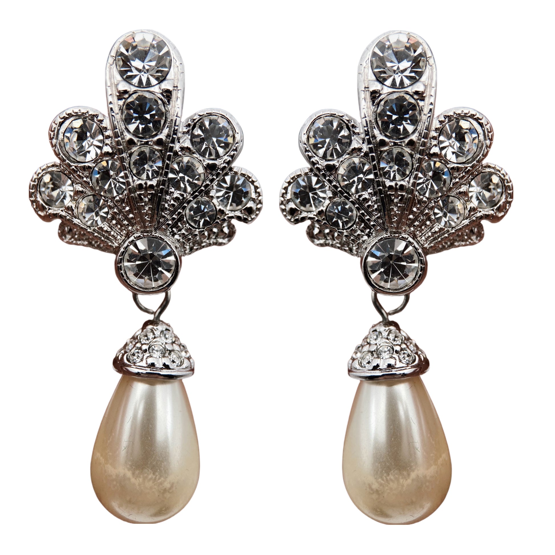 This is a striking pair of MVH (Michaela Von Habsburg) stud earrings with a touch of classic luxury. These earrings feature a shell-shaped top decorated with clear crystal stones that subtly shine and evoke a royal style. The pendants are drop-shaped imitation pearls, mounted on a silver-colored base with small crystals. The back of the earrings is marked with the MVH logo with a crown symbol - a design mark of Michaela von Habsburg-Castell, an Austrian princess. Michaela von Habsburg (b. 1954) was known as a jewelry designer and businesswoman. Her jewelry was mostly produced in limited editions in Europe (especially in Italy and Germany), often based on historical imperial motifs (crowns, crosses, heraldry).