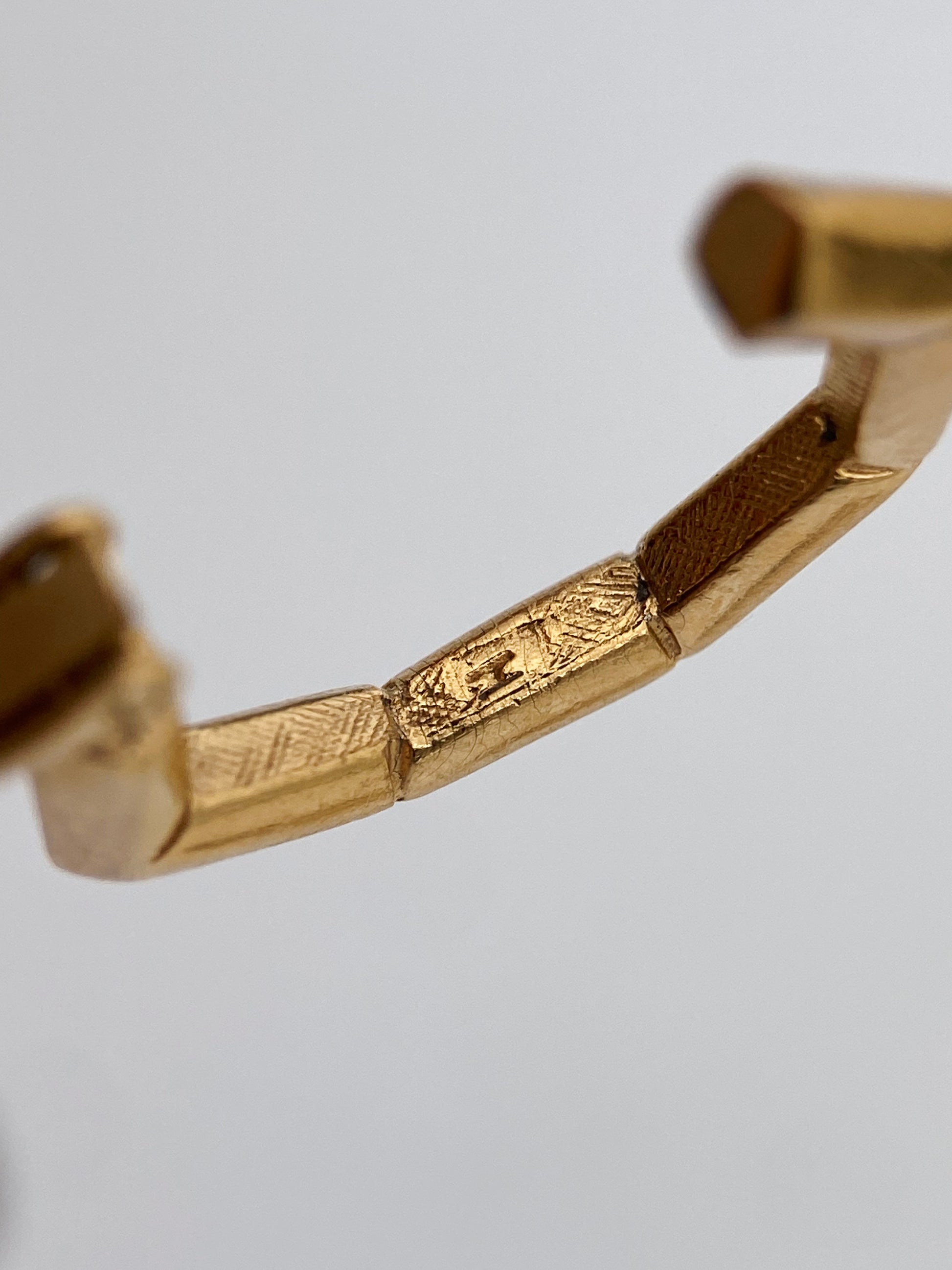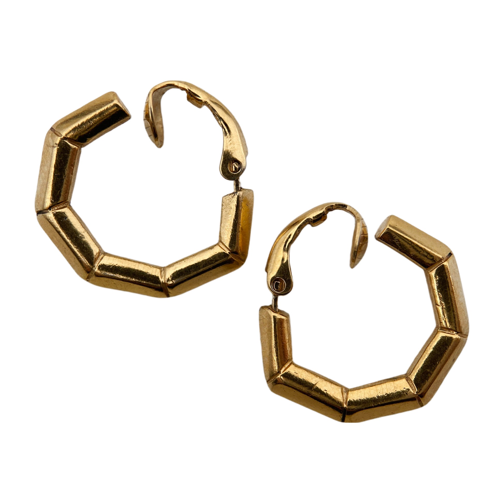 Sudėtis: metalas Būklė: labai gera Išmatavimai: 1,9 x 0,3 cm Spalva: aukso Šalis: JAV Žymėjimas: “M arba H rėmelyje” Laikotarpis: 1960-1970 metai Rinkos vertė: 20-30 EUR Vintažiniai klipsai, pagaminti JAV apie 1960–1970 m. Auskarai pasižymi geometriniu, segmentuotu dizainu.