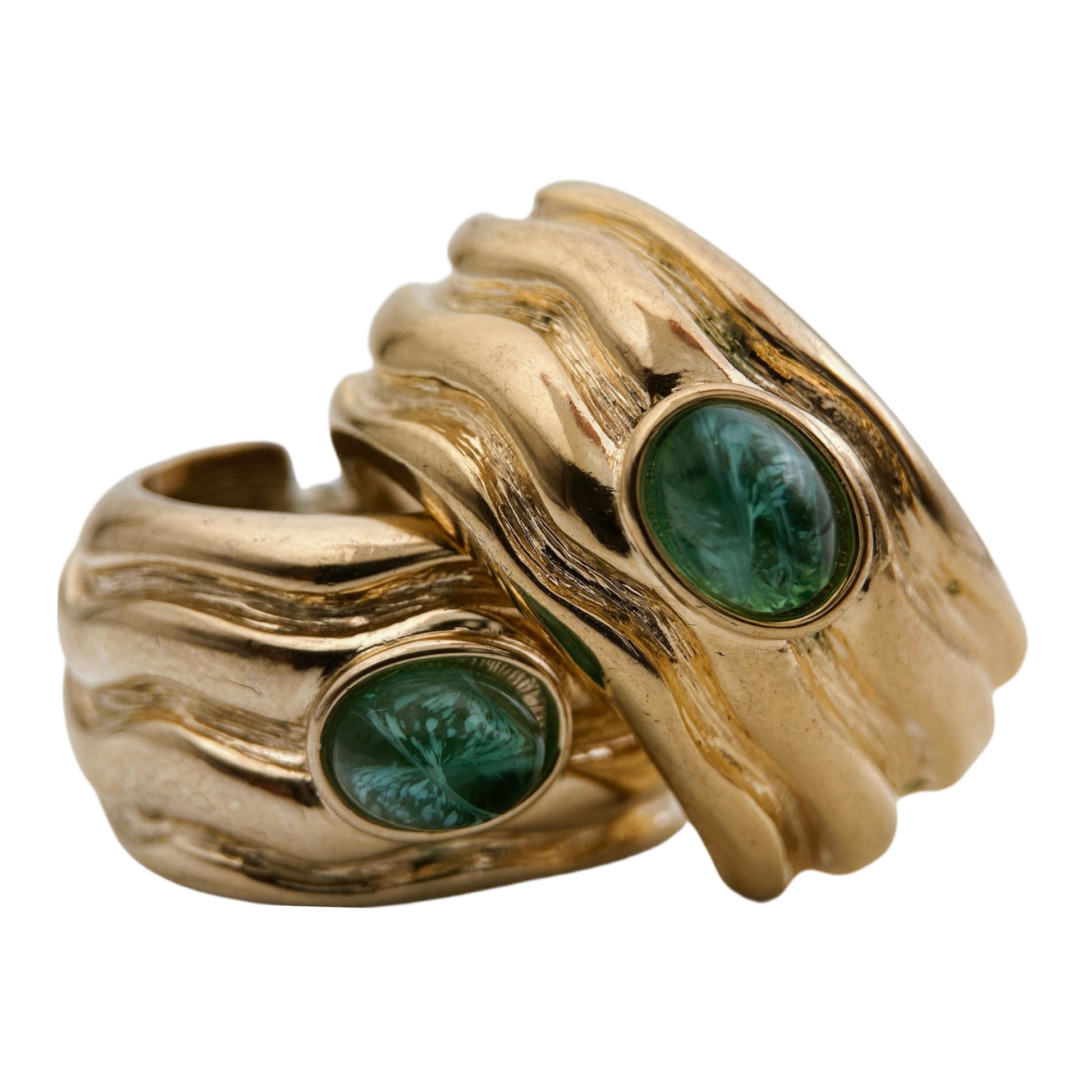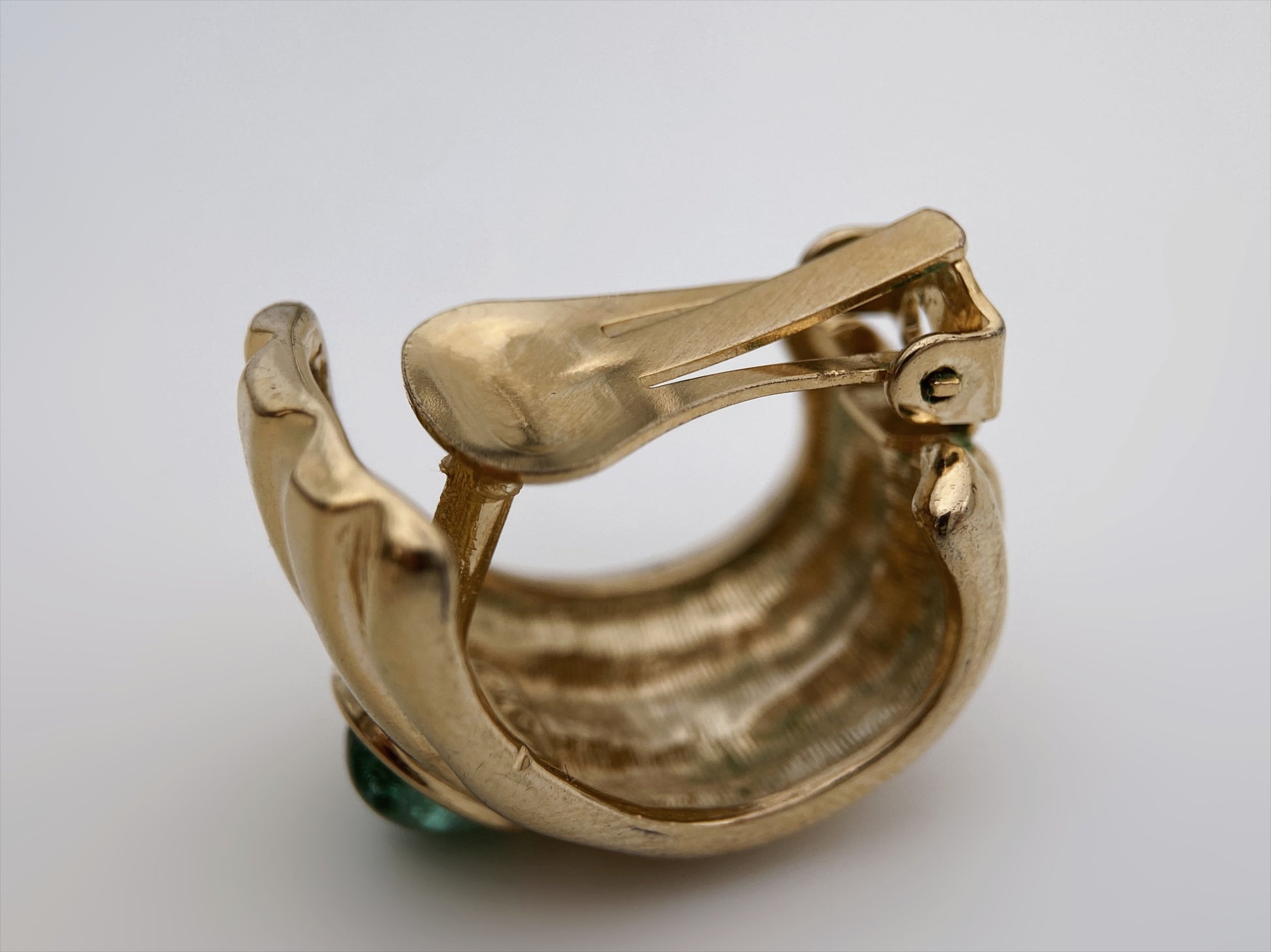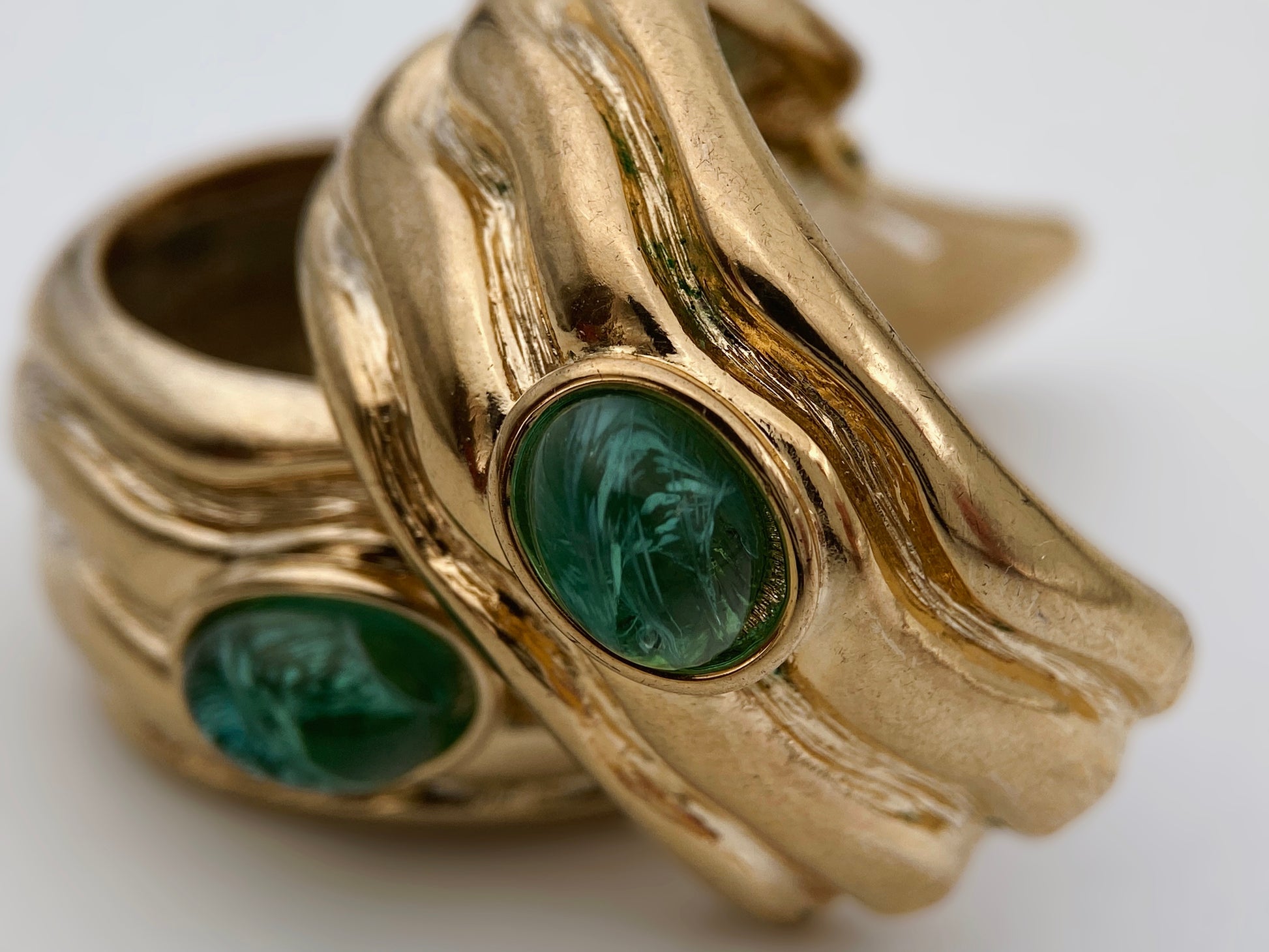 Išraiškingi, masyvūs klipsai, pasižymintys skulptūriniu, banguotu dizainu ir sodrios žalios spalvos marmuruoto efekto kabošonais. Papuošalas pagamintas iš storo, sunkesnio paauksuoto metalo, kruopščiai suformuoto liejimo būdu, kas būdinga aukštesnės klasės XX a. 8–9 dešimtmečių Europos “couture” bižuterijai. Ant vidinės pusės esantis žymėjimas „SL ©“ rodo autorinį arba studijos ženklą, tačiau tikslaus meistro ar dirbtuvės pavadinimo šiuo metu identifikuoti nepavyko. Tokie inicialiniai žymėjimai buvo būdingi mažesnėms dizaino studijoms ar nepriklausomiems meistrams, dirbusiems ribotais tiražais arba gaminusiems papuošalus butikinėms kolekcijoms. Konstrukcija – tvirta ir techniškai išbaigta: klipsinis užsegimas su vyriniu mechanizmu atitinka 1970–1980 m. Vakarų Europoje naudotus profesionalius klipsų sprendimus, užtikrinančius stabilų laikymą ir patogų dėvėjimą. Bendras dizainas, svoris ir apdirbimo kokybė leidžia šį kūrinį vertinti kaip meistro ar studijos darbą, o ne masinės gamybos aksesuarą.