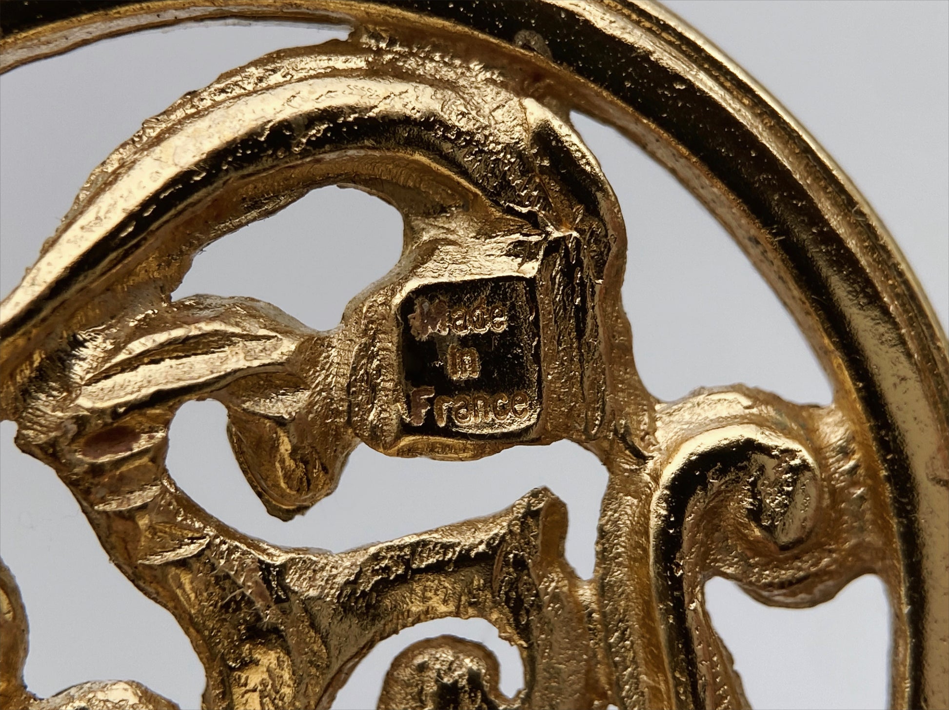 Sudėtis: paauksuotas metalas Būklė: labai gera Išmatavimai: 7,8 x 4,5 cm Spalva: aukso Šalis: Prancūzija Žymėjimas:YSL (ant užsegimo), Made in France Laikotarpis: 1970–1980 metai Kolekcinė vertė: 500–600 EUR