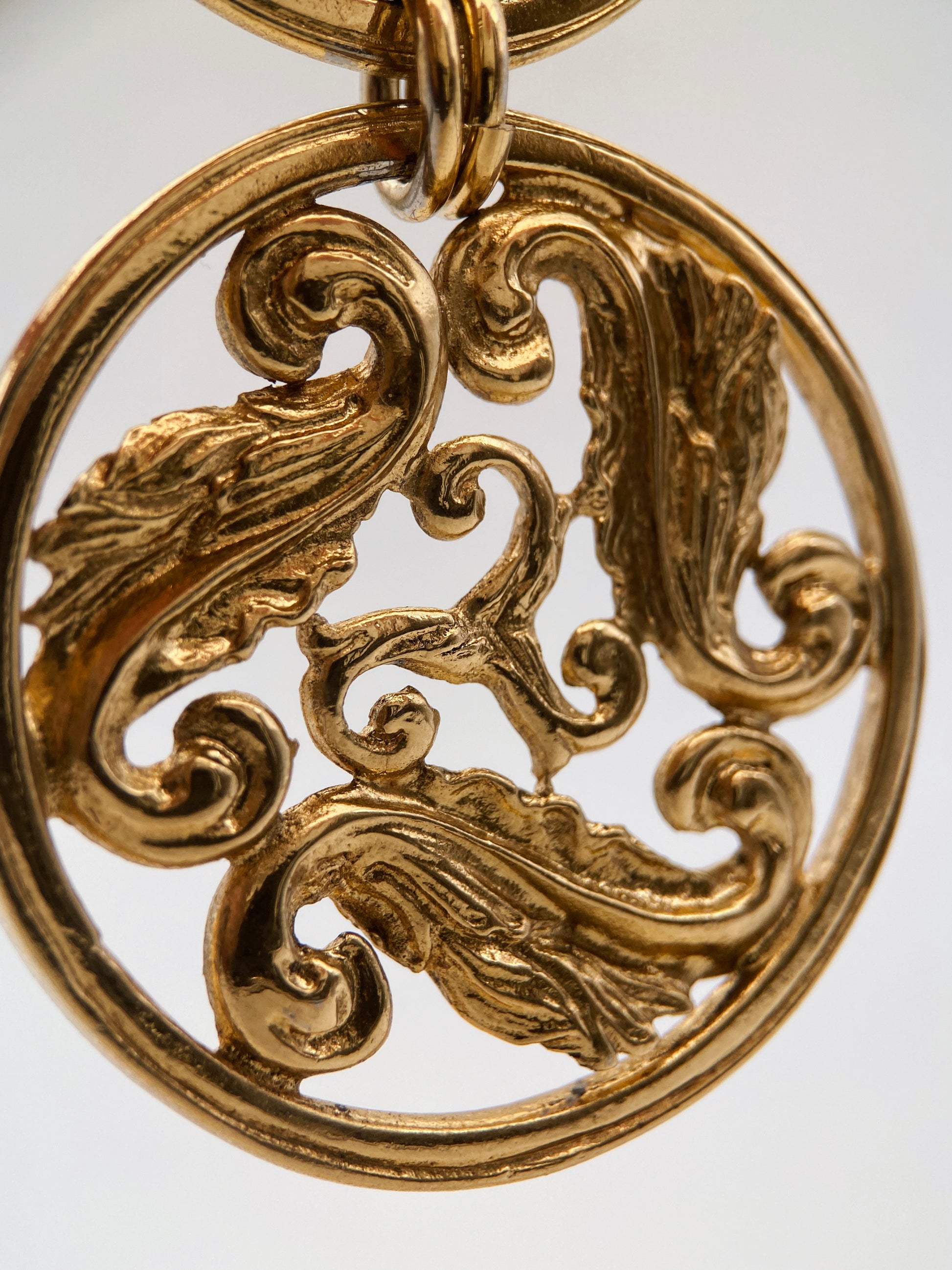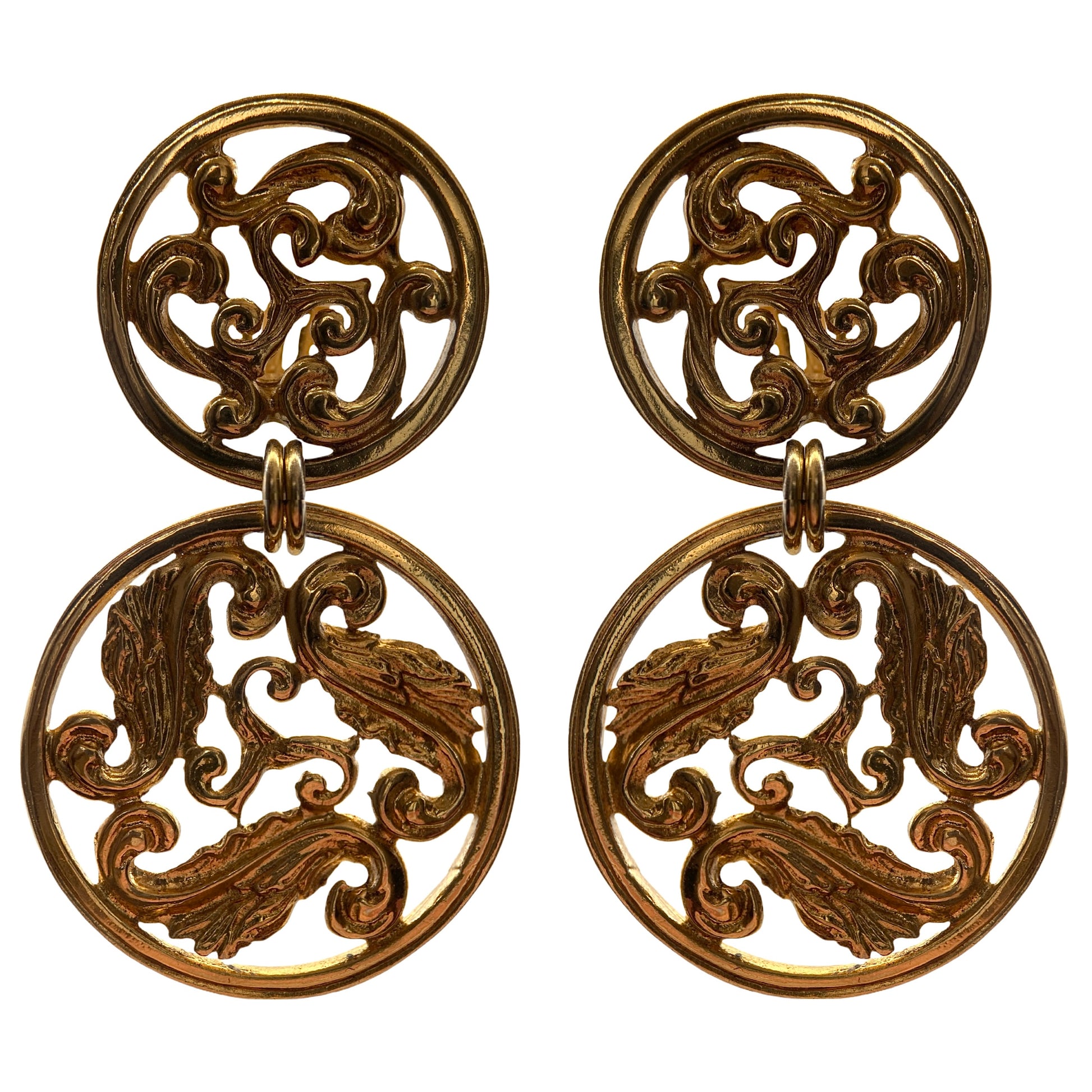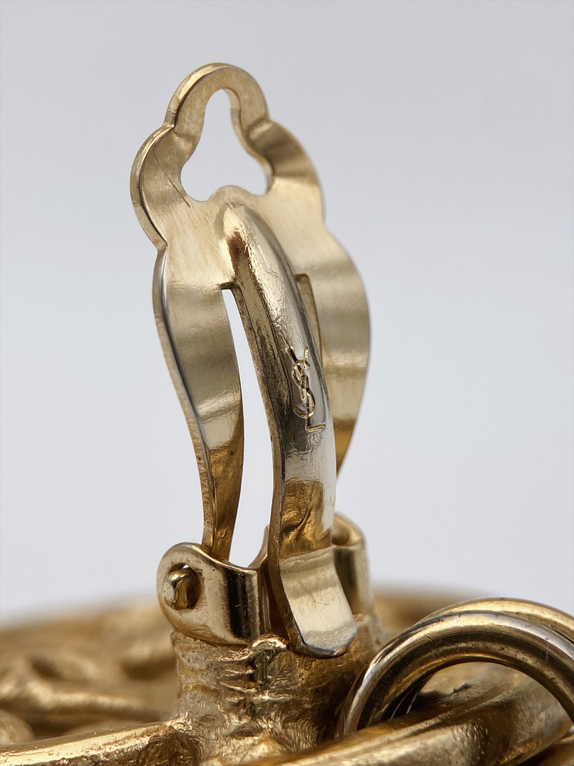 Auskarai pasižymi išraiškingu prancūziškos „couture“ bižuterijos dizainu, būdingu “Yves Saint Laurent” estetinei krypčiai. Kompozicija sudaryta iš dviejų jungiamų apskritimų su atviru, barokiniu ornamentu – vingiuojantys lapų motyvai kuria dinamišką, architektūrišką siluetą. Reljefas gilus ir nevienodas, su aiškiu skulptūrinės plastikos ir rankų darbo pojūčiu. Paauksuotas paviršius išlaiko sodrų, šiltą atspalvį, pabrėžiantį ornamentikos gylį ir šviesos–šešėlio žaismę. Dviejų dalių konstrukcija suteikia auskarams judesio, todėl, nepaisant masyvumo, jie atrodo gyvi ir vizualiai subalansuoti. Tai „statement“ tipo auskarai, skirti konceptualiems ir vakarinio stiliaus deriniams. Dizainas atspindi laikotarpį, kai prancūziška „couture“ bižuterija buvo kuriama kaip meno objektas, o ne tik aksesuaras. Ant klipso užsegimo esantis YSL žymėjimas kartu su „Made in France“ patvirtina prancūzišką kilmę ir dizainerio namų autorystę. Šio laikotarpio Yves Saint Laurent bižuterija šiandien vertinama dėl ribotos pasiūlos, išraiškingų formų ir kolekcinės vertės, todėl tokie auskarai yra itin patrauklūs kolekcininkams ir aukštesnės klasės vintažo papuošalų ieškantiems pirkėjams.