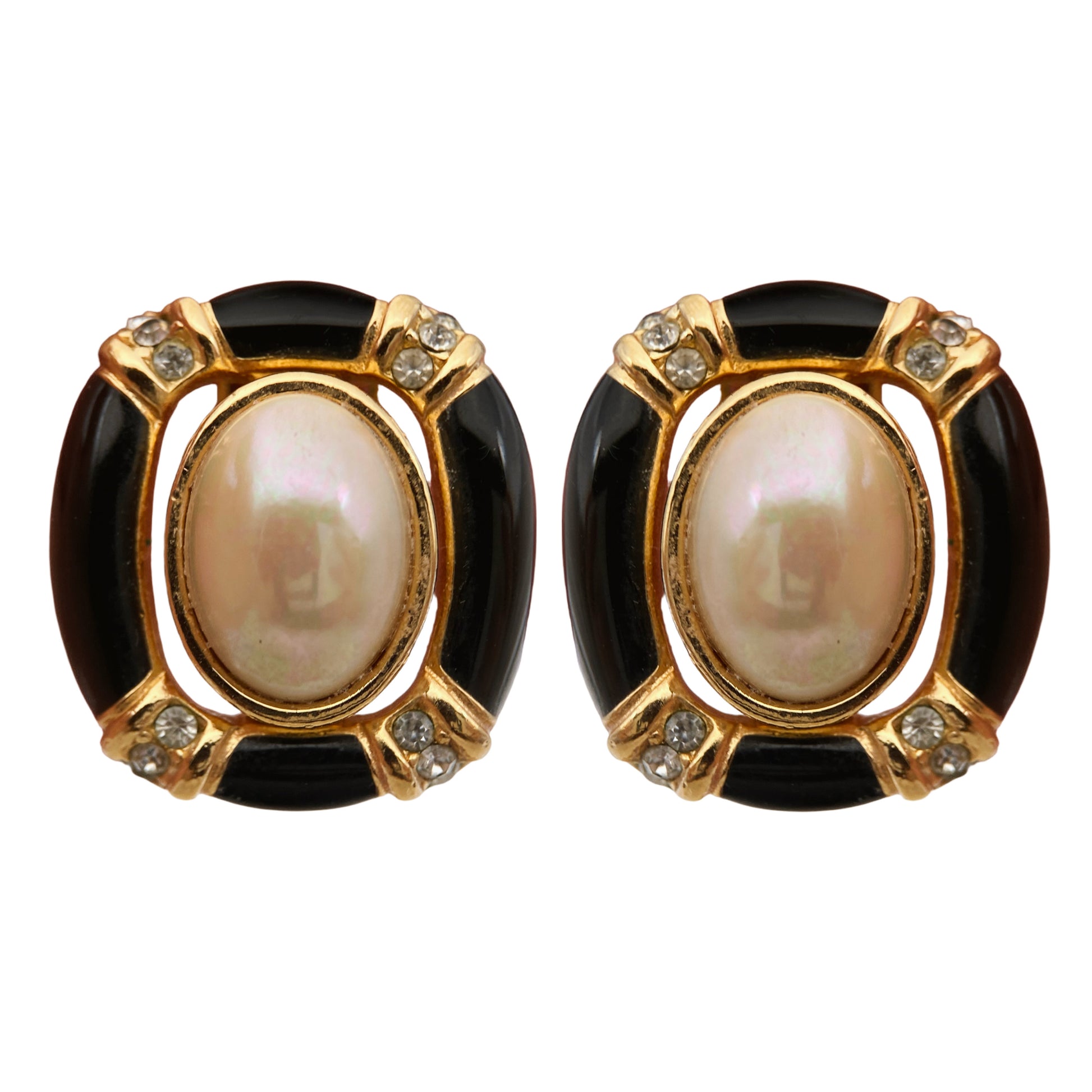 These earrings feature a bold geometry – a distinctly modernist approach popular in the late 60s. The black enamel frame, imitating onyx, with a central oval pearl, accented with crystals – a classic Dior costume jewelry style, combining elegance and luxury. Imitation pearl + enamel + crystals (rhinestones) – very characteristic of Dior fashion jewelry circa 1968-1971. The black and gold contrasting color scheme – extremely popular in the early 1970s, inspired by the Jet/Art Deco revival. The vintage authentic Christian Dior clips are fromthe late 1960s-1971 period.