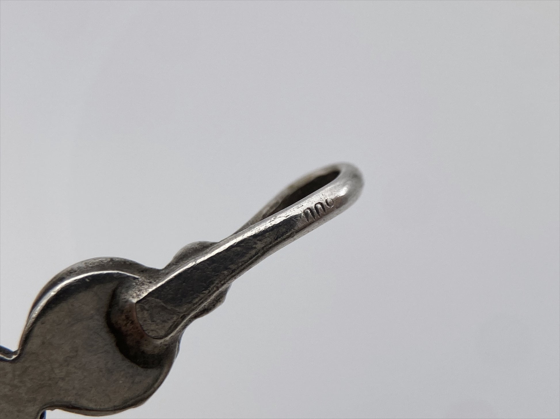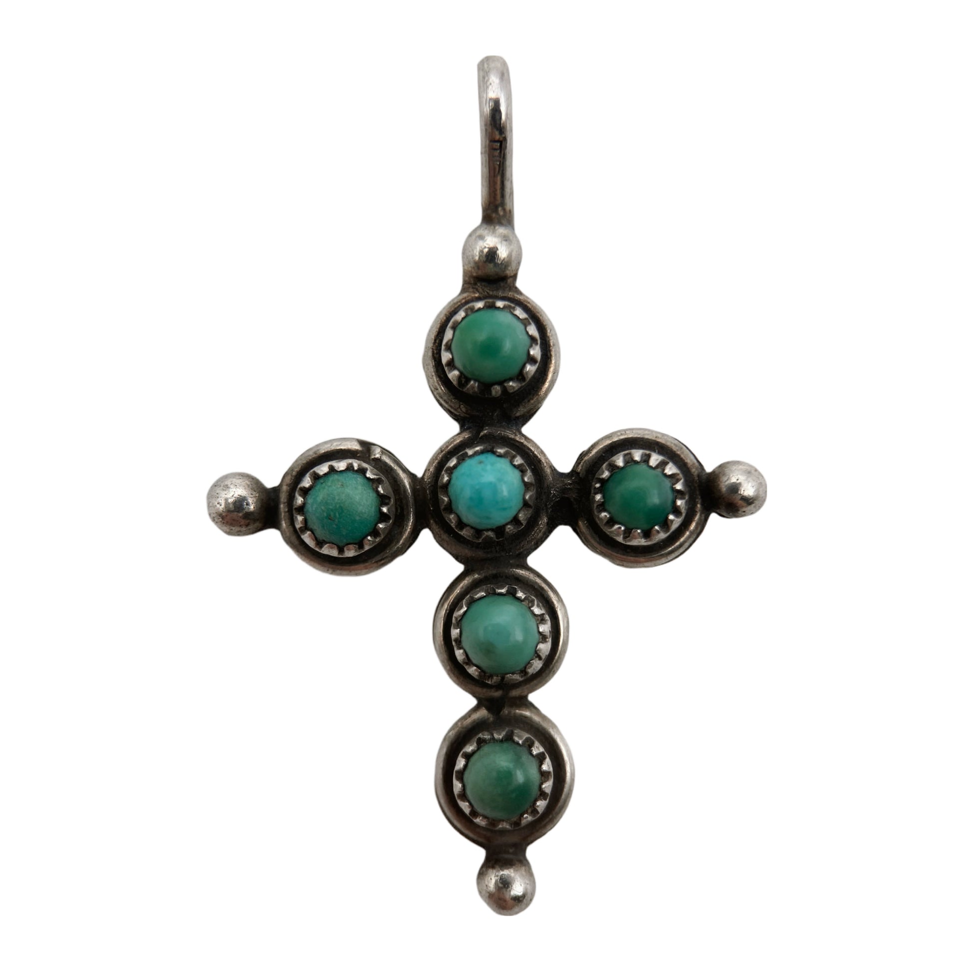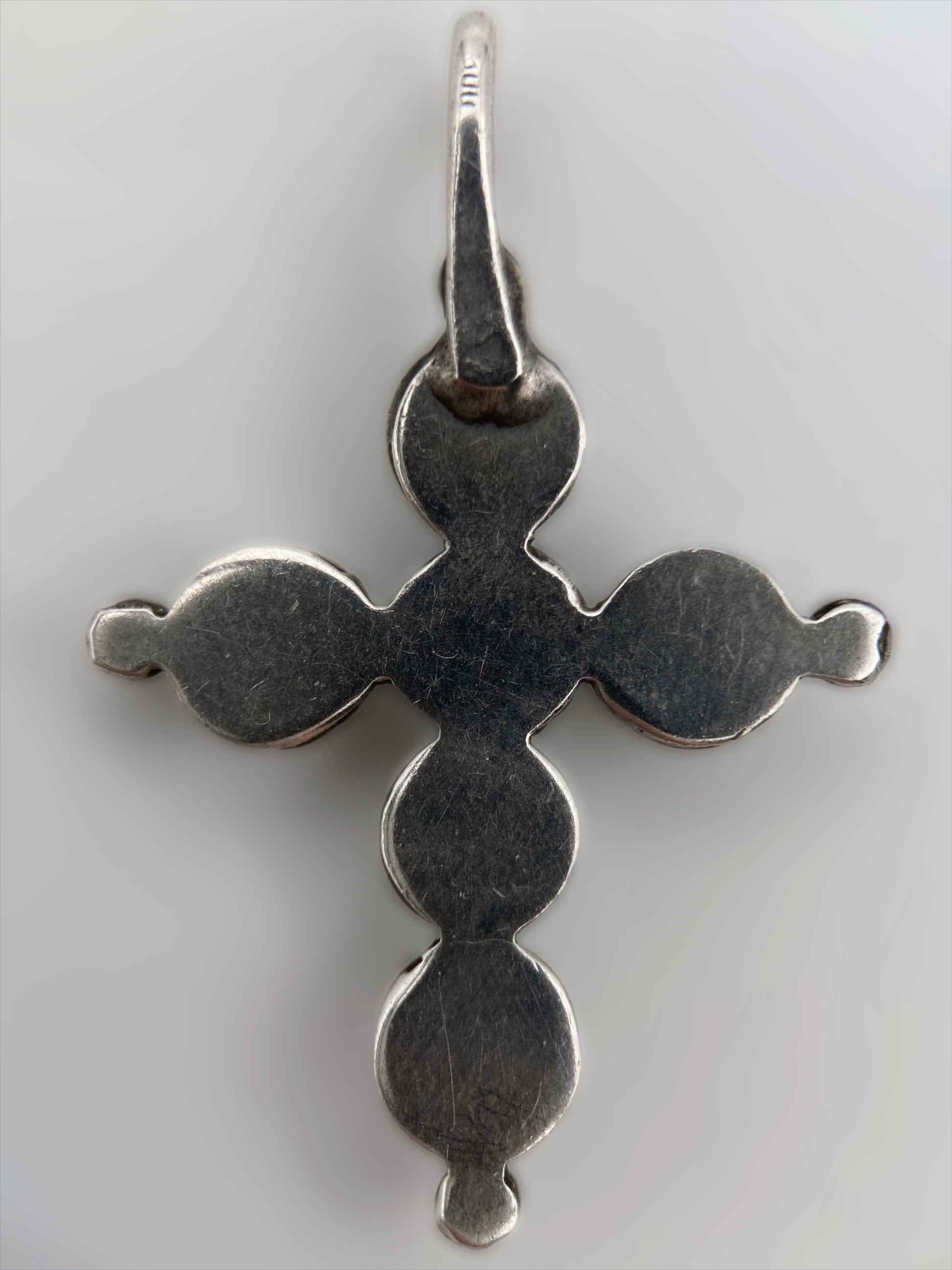 Senovinis 800 prabos sidabrinis kryželis su turkio spalvos akmenėliais, rankų darbo. Vėlyvas XIX a. – ankstyvas XX a., Vidurio / Pietų Europa. Autentiška religinė juvelyrika su originalia patina. Forma – klasikinis lotyniškas kryžius su apvalintais galais, būdingas pietų ir centrinės Europos bei Balkanų regiono religinei juvelyrikai.