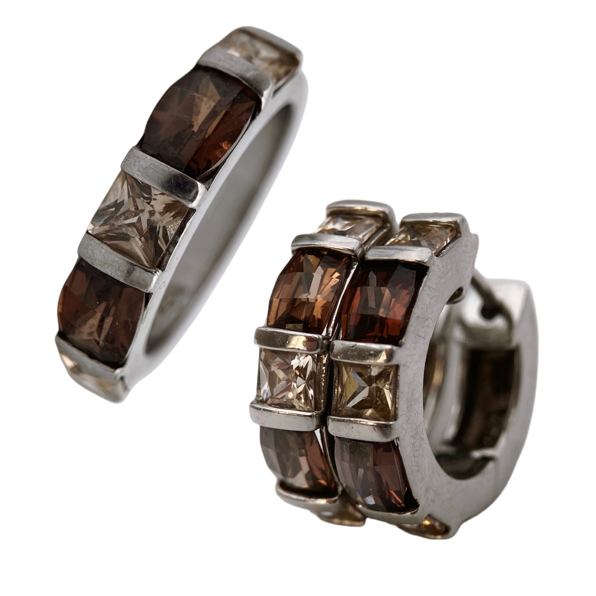 925 sidabro auskarų ir žiedo komplektas, dekoruotas šampaninio atspalvio kvadratiniais ir giliai rudos spalvos stačiakampiais kristalais. Auskarai - uždari, “huggie” tipo, patogiai priglundantys prie ausies, su tvirtu vyriu. Žiedas - masyvesnis, geometrinės formos, puikiai derantis prie auskarų. Prekės kodas: RF034