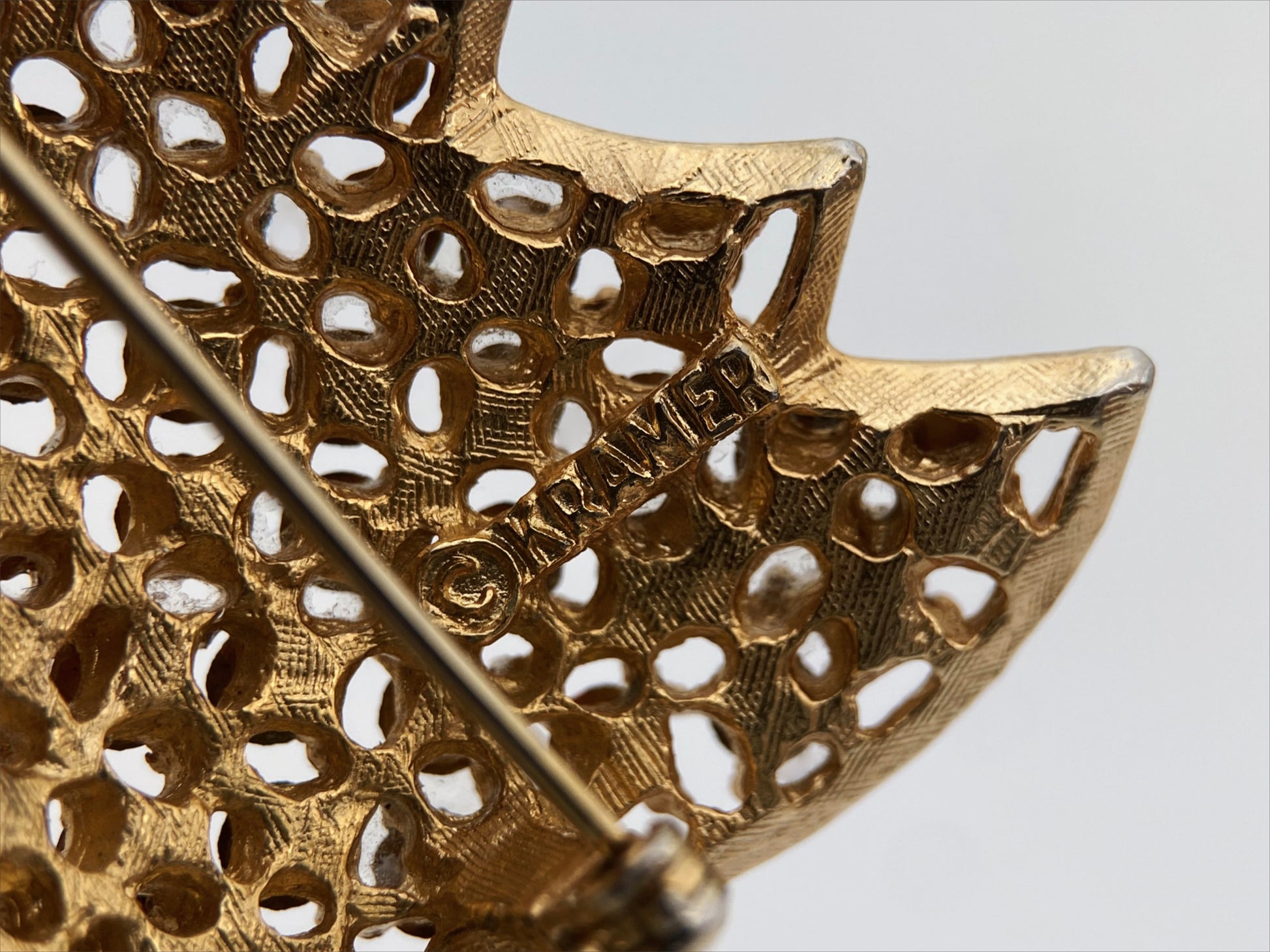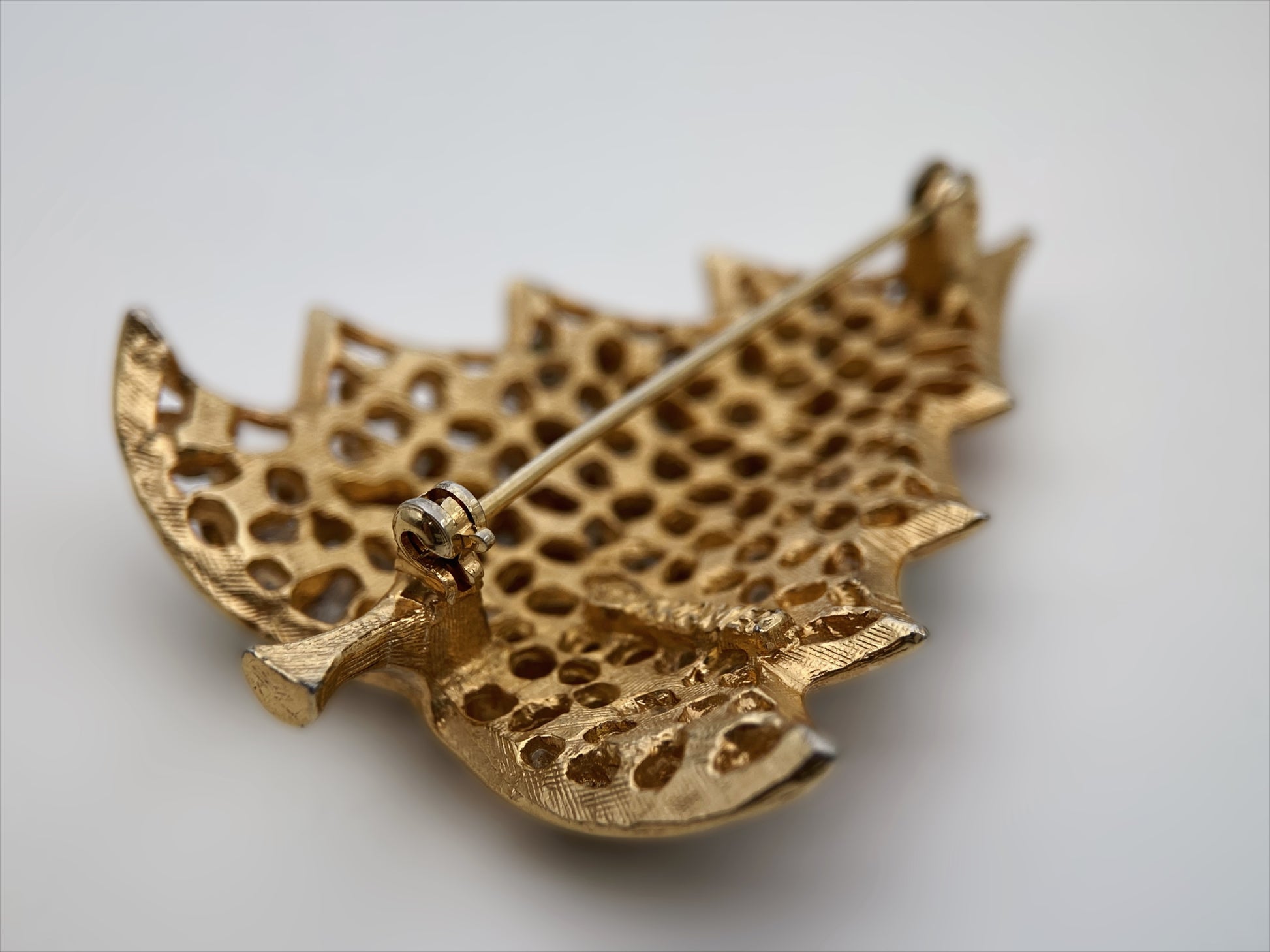 Sudėtis: metalas, stiklo kristalaiBūklė: labai geraIšmatavimai: 4 x 5 cmSpalva: aukso, raudona, mėlyna, žaliaŠalis: JAVŽymėjimas: “©KRAMER”Laikotarpis: 1950-1960 metaiRinkos vertė: 60-80 EURAutentiška, kolekcinė Kramer sagė „Kalėdinė eglutė“, dekoruota daugiaspalviais stiklo kristalais. Tai klasikinis, labai mėgstamas “mid-century” laikotarpio modelis.