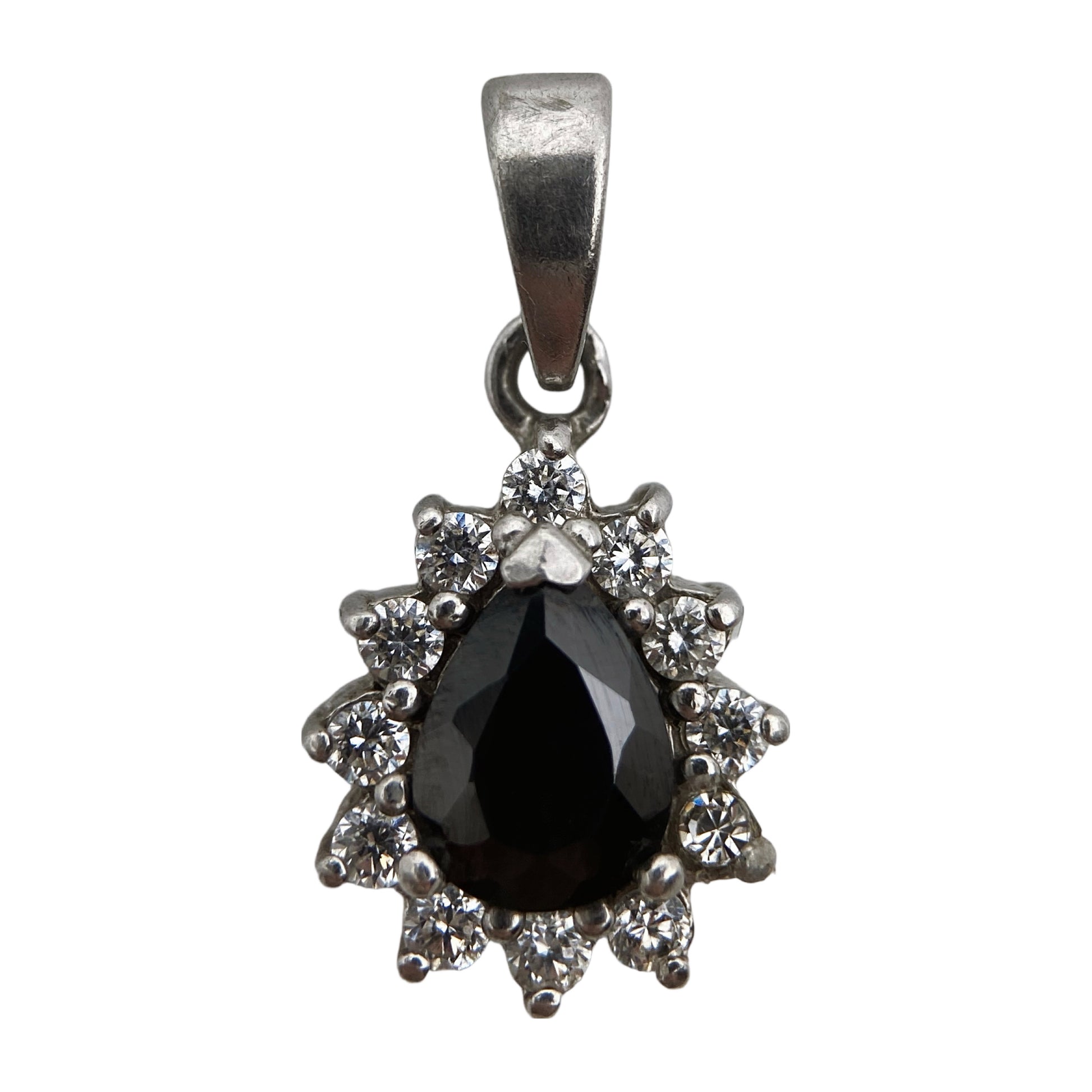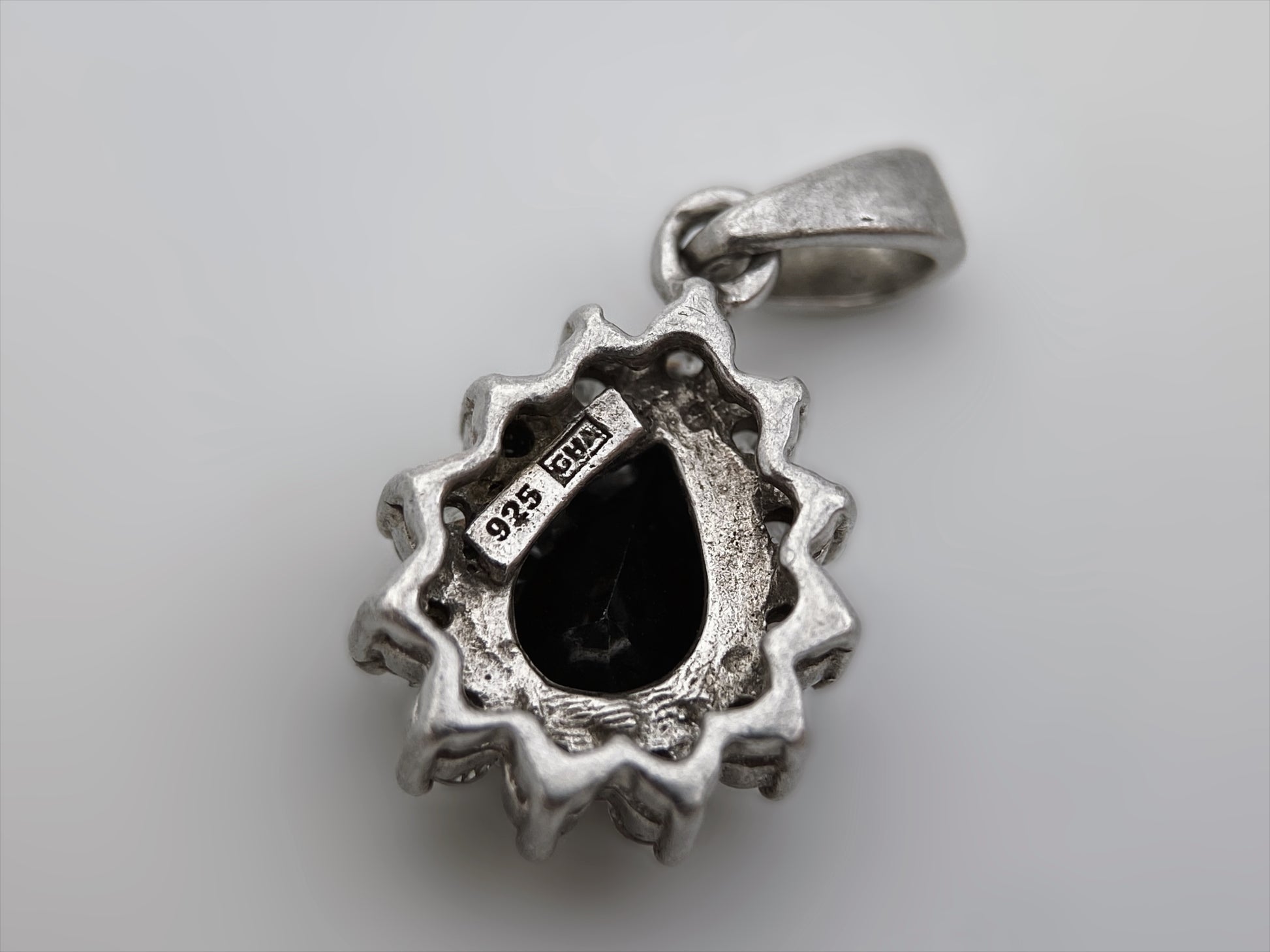 Klasikinio stiliaus sidabro pakabukas, dekoruotas juodu kriaušės formos akmeniu ir ryškiais baltais cirkoniais. Pagamintas iš 925 prabos sidabro, pažymėtas gamintojo žyma GHA, būdinga Šiaurės Amerikos (JAV / Kanada) juvelyrikos dirbtuvėms. Centrinis akmuo – poliruotas juodas oniksas (tamsiai juodas, blizgus). Jį juosia 14 ryškiai spindinčių cirkonio kristalų, sukuriančių klasikinį „halo“ efektą. Pakabuko korpusas masyvesnis, liejimo būdu, su išraiškinga banguota nugarėle.