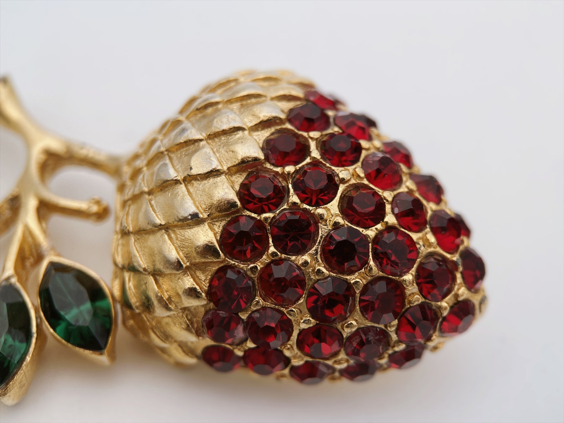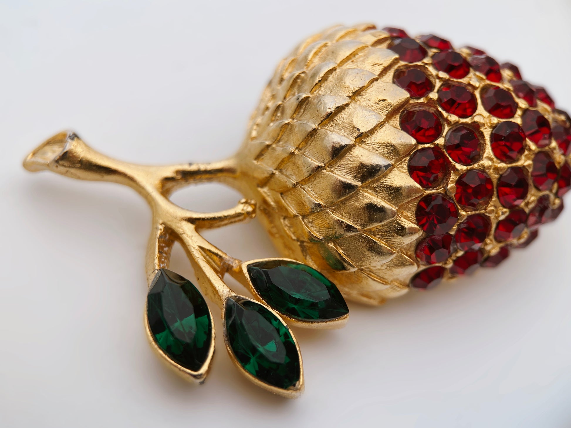 Išraiškinga vintažinė sagė, vaizduojanti gilę su šakele ir lapeliais, pagaminta iš aukštos kokybės auksaspalvio metalo. Sagė gausiai dekoruota sodrios raudonos spalvos stiklo kristalais, imituojančiais granatus, bei žaliais kristalais lapeliuose. Tekstūruotas, reljefinis paviršius suteikia papuošalui gylio ir skulptūriškumo. Atvira nugarėlė su perforacijomis ir klasikinis saugus segtuko tipo užsegimas būdingi aukštos kokybės XX a. vidurio JAV bižuterijai. Gamtos motyvai, tokie kaip gilės, buvo itin populiarūs 1950–1960 m. laikotarpiu ir šiandien vertinami kolekcininkų.