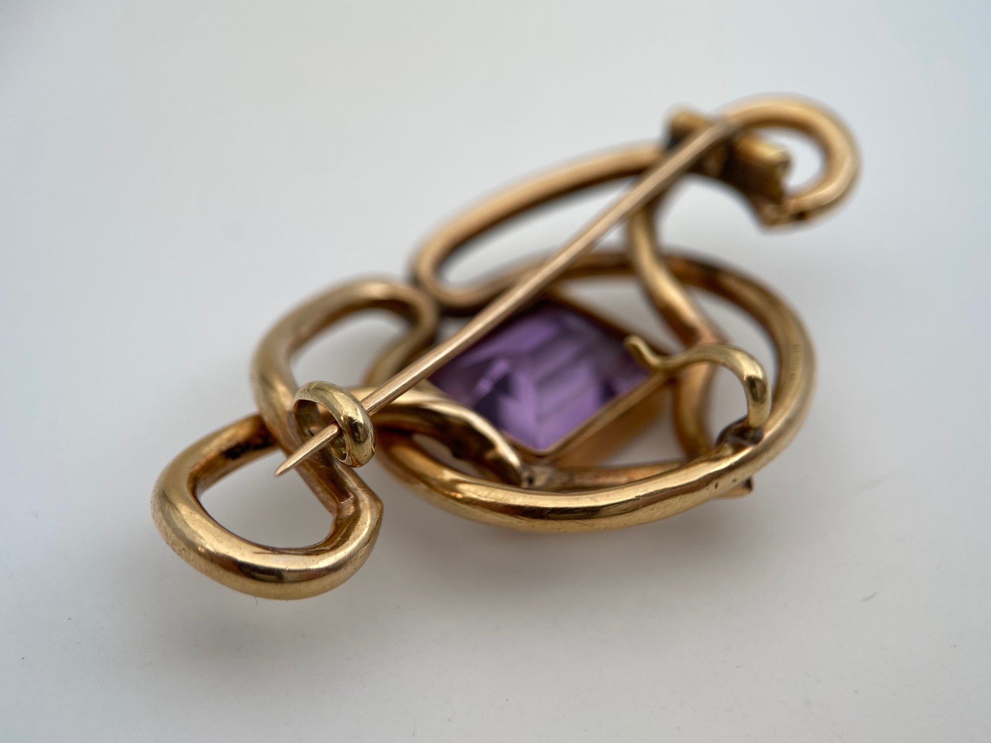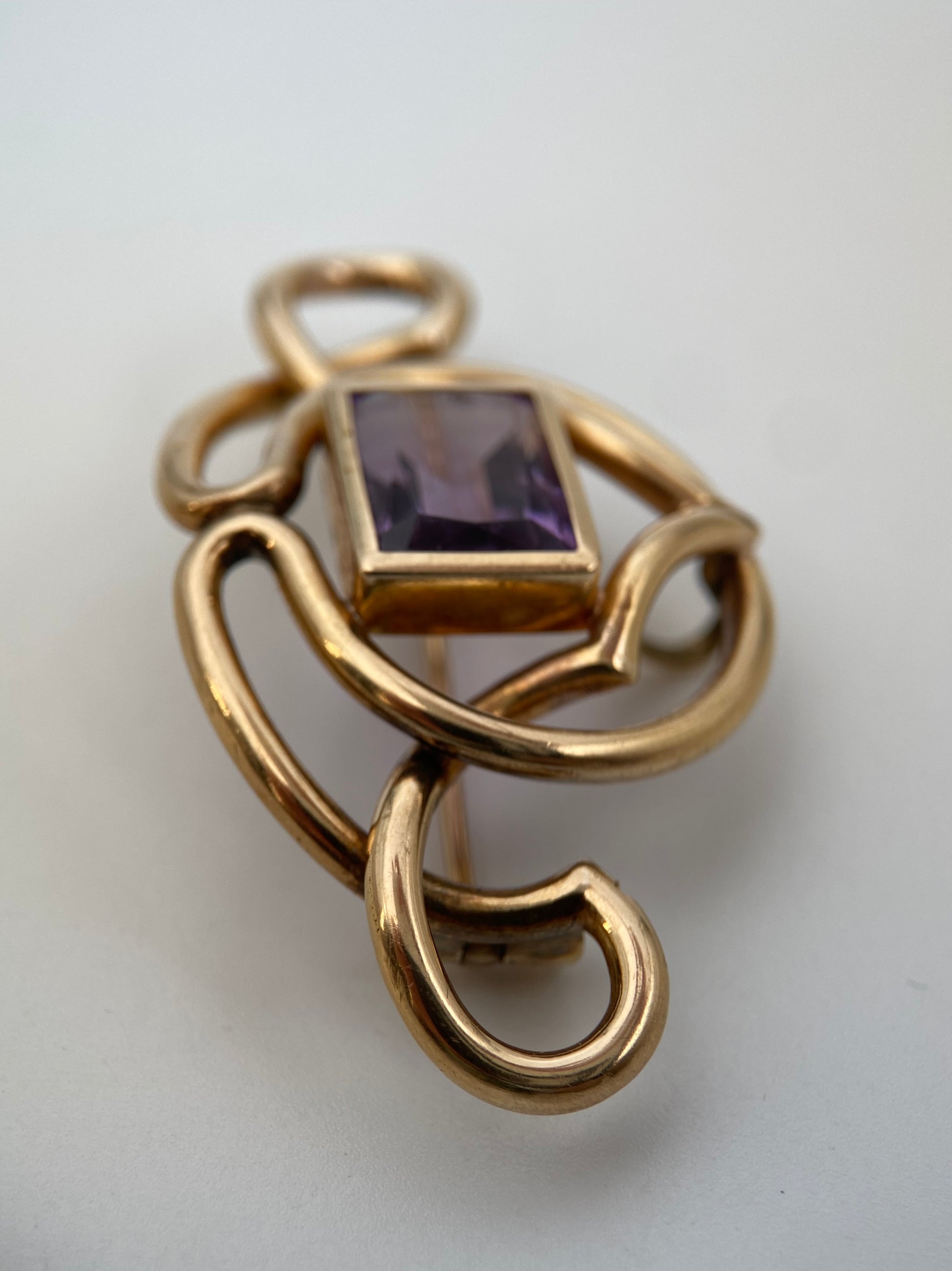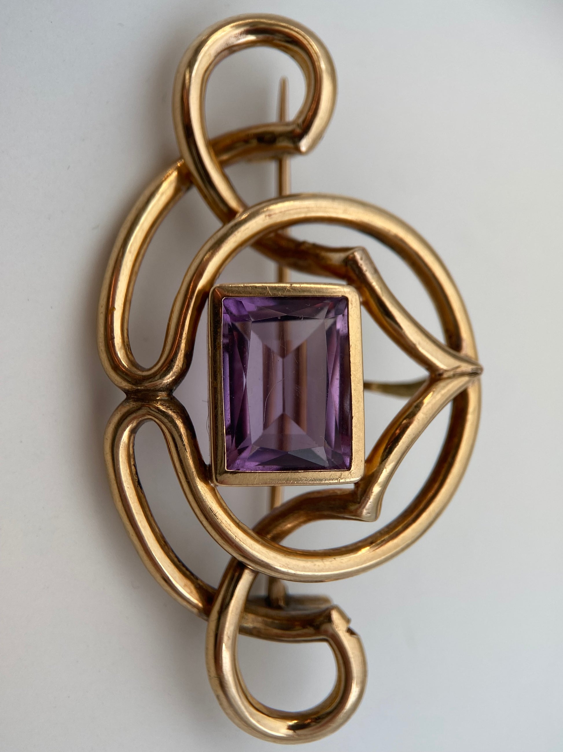 Išraiškinga XX a. vidurio modernistinė dvigubos paskirties sagė–pakabukas, pagaminta rankomis iš aukso spalvos metalo vielos. Organinės, vingiuotos linijos sukuria skulptūrišką, unikalų siluetą, būdingą 1940–1960 m. modernizmo papuošalams. Centre įstatytas ryškus ametisto spalvos stačiakampis stiklo kristalas, suteikiantis papuošalui spalvinio akcento ir gilumo. Nugarėlėje – ankstyvo tipo “C-clasp” segės užsegimas ir integruota pakabuko kilpa, todėl papuošalą galima nešioti dviem būdais: kaip sagę arba kaip pakabuką ant grandinėlės.