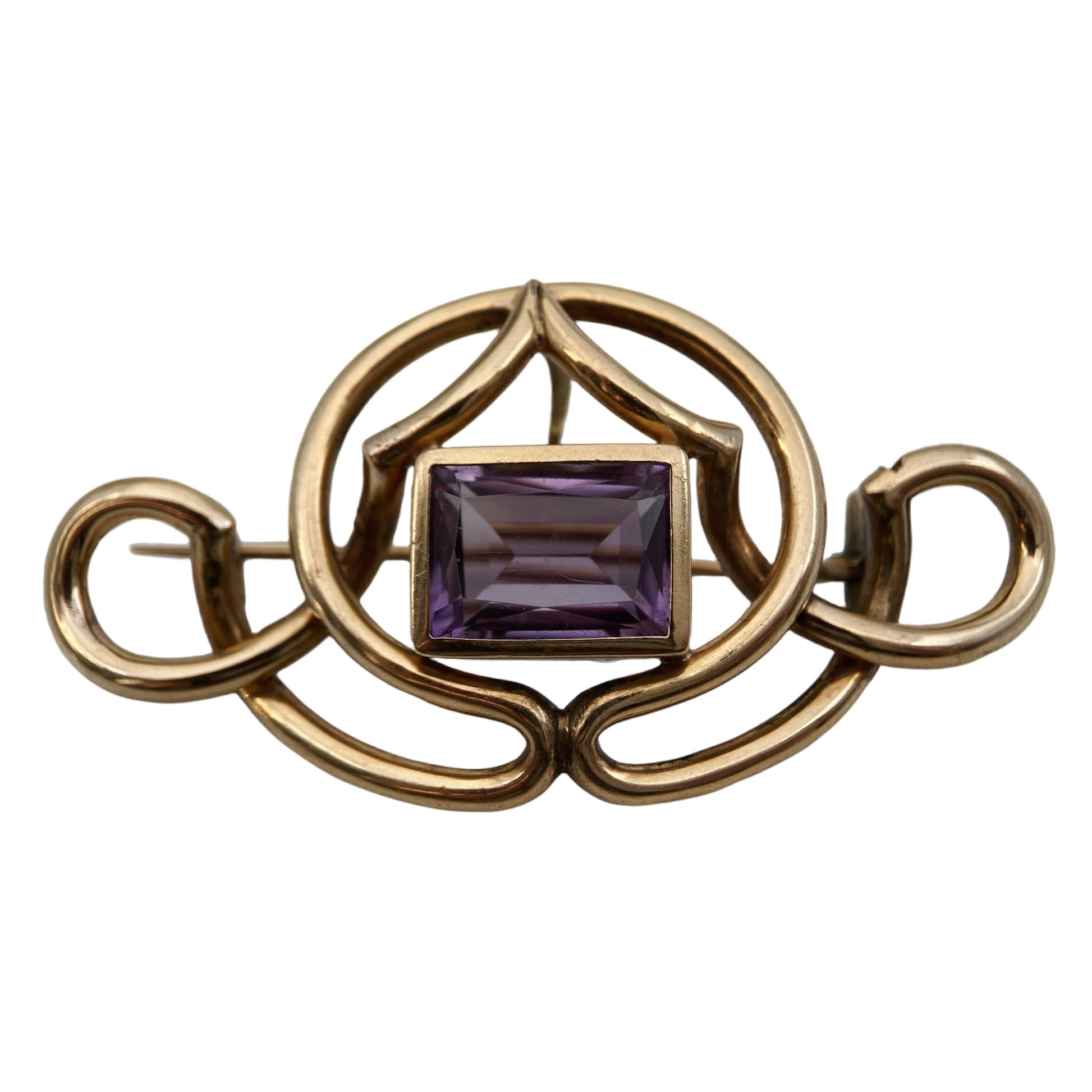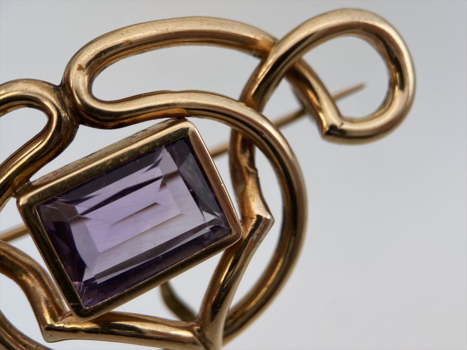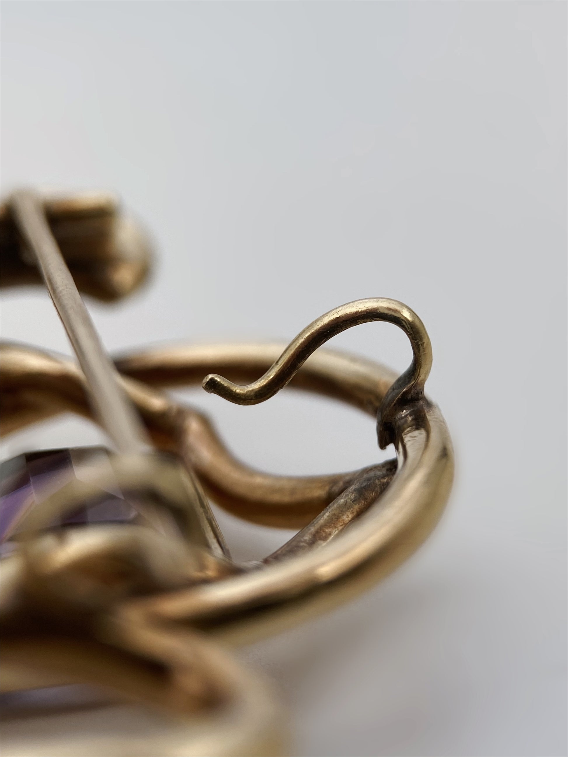 Išraiškinga XX a. vidurio modernistinė dvigubos paskirties sagė–pakabukas, pagaminta rankomis iš aukso spalvos metalo vielos. Organinės, vingiuotos linijos sukuria skulptūrišką, unikalų siluetą, būdingą 1940–1960 m. modernizmo papuošalams. Centre įstatytas ryškus ametisto spalvos stačiakampis stiklo kristalas, suteikiantis papuošalui spalvinio akcento ir gilumo. Nugarėlėje – ankstyvo tipo “C-clasp” segės užsegimas ir integruota pakabuko kilpa, todėl papuošalą galima nešioti dviem būdais: kaip sagę arba kaip pakabuką ant grandinėlės.