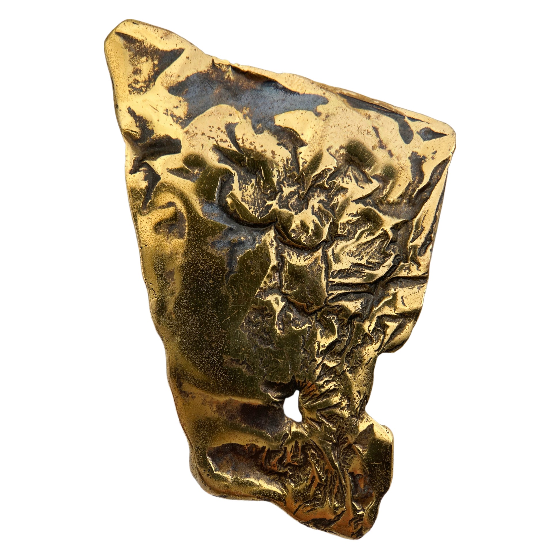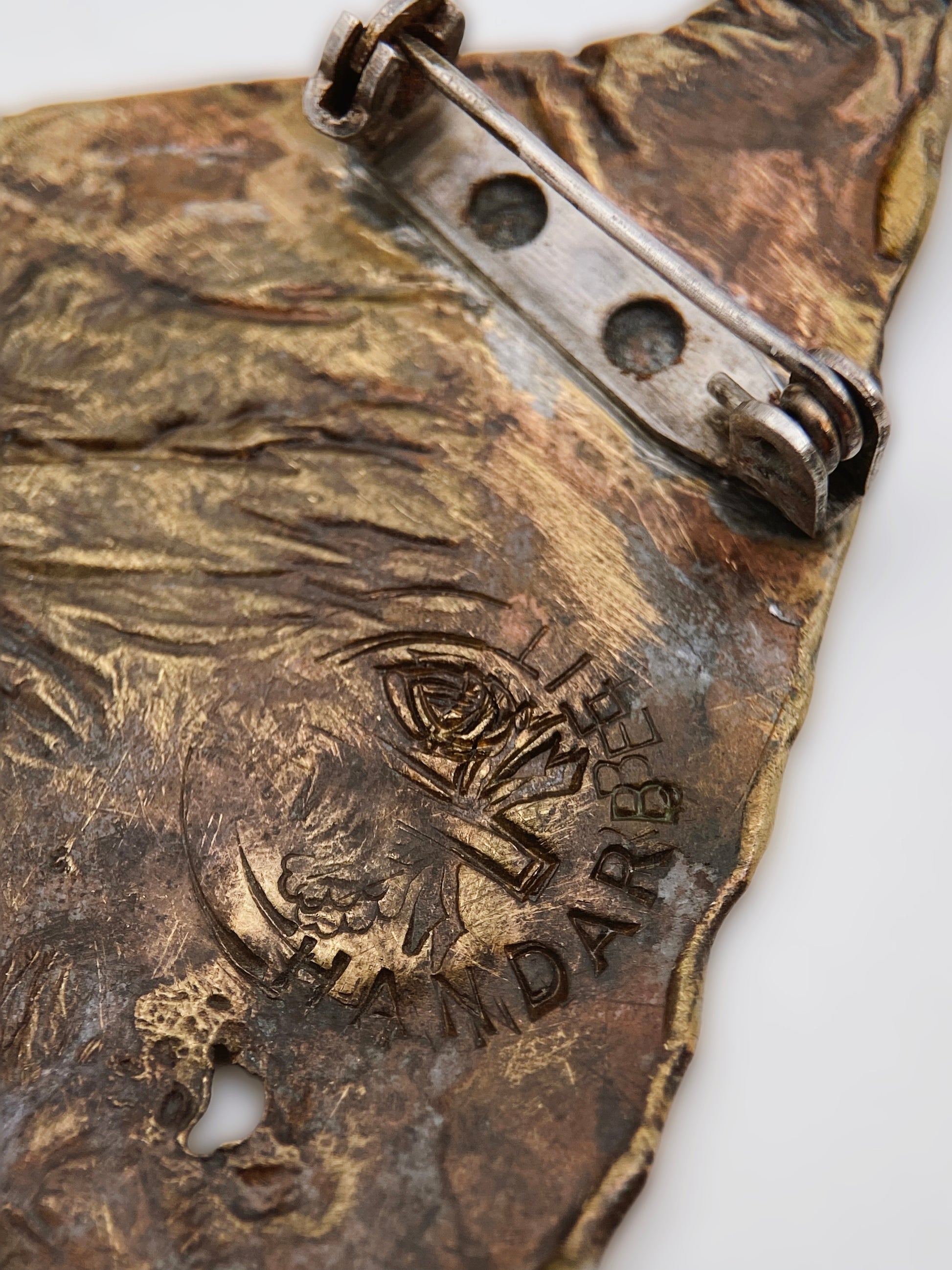 Tai autentiška vokiška vintažinė sagė, sukurta kaip meninės juvelyrikos papuošalas, o ne dekoratyvinis aksesuaras. Sagė išsiskiria ryškiu skulptūriniu reljefu, organiška, tarsi natūralios uolienos ar abstraktaus kūno fragmento forma. Dizainas sąmoningai netaisyklingas, ekspresyvus, būdingas pokario Europos modernizmui. Sagė pagaminta iš žalvario, su natūraliai susiformavusia patina, kuri pabrėžia reljefo gylį ir rankų darbo faktūrą. HANDARBEIT – vokiškas užrašas, reiškiantis „rankų darbas“. Tai labai svarbus identifikacinis elementas, rodantis, kad sagė buvo gaminta nedidelėse dirbtuvėse ar meninėje studijoje, o ne masinės gamybos būdu. Monograma / ženklas – stilizuotas simbolis, būdingas autorinei arba studijinei juvelyrikai. Tokie ženklai dažni Vakarų Vokietijos meninėje juvelyrikoje XX a. viduryje.