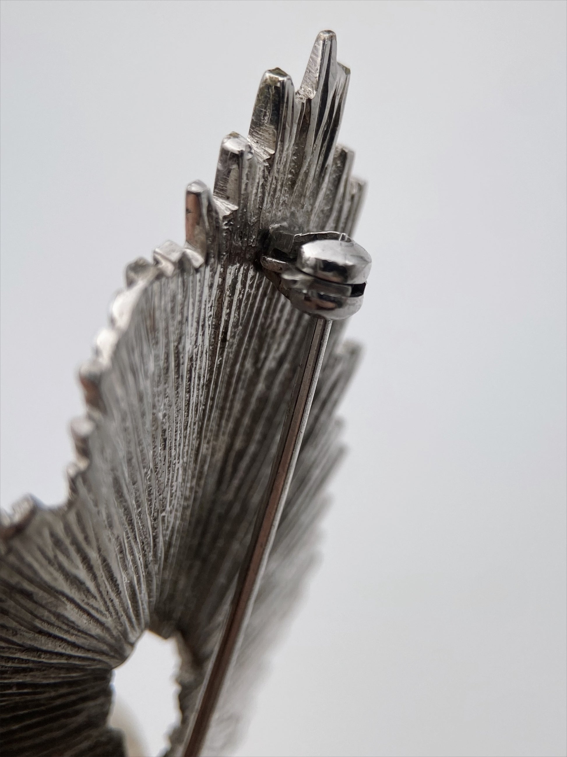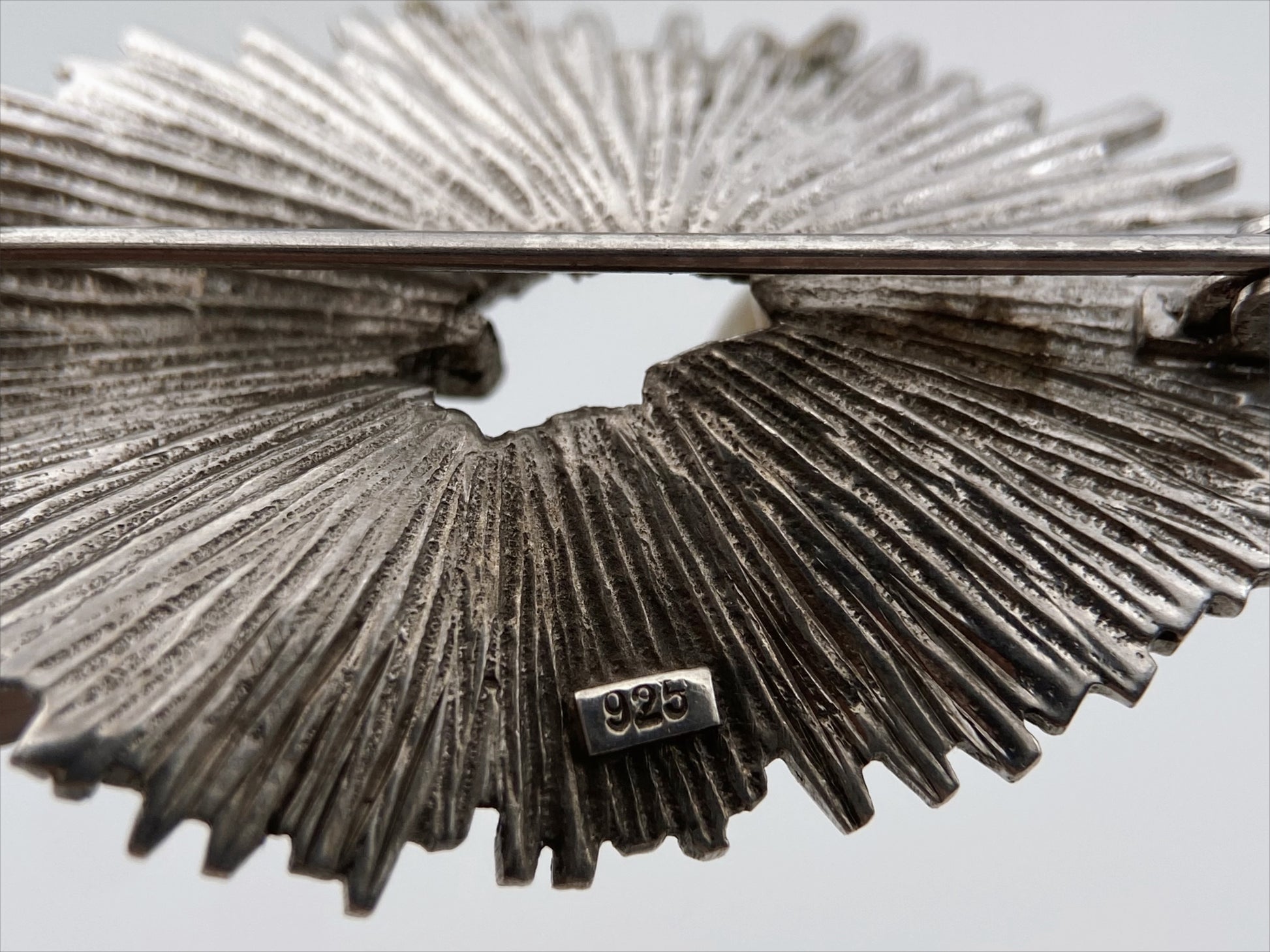 Išskirtinė modernistinio stiliaus sagė, pagaminta iš sterlinginio sidabro (925), pasižyminti ryškia spindulių / saulės pliūpsnio forma ir reljefiška, rankų darbo faktūra. Kompozicijos centre – perlo imitacija, suteikianti dizainui elegancijos ir kontrasto. Sagė masyvi, tvirta, su kokybišku klasikiniu smeigtuko užsegimu. Dizainas būdingas XX a. vidurio–antroje pusėje kurtai modernistinei juvelyrikai, kur akcentuojama forma, struktūra ir metalo plastika.