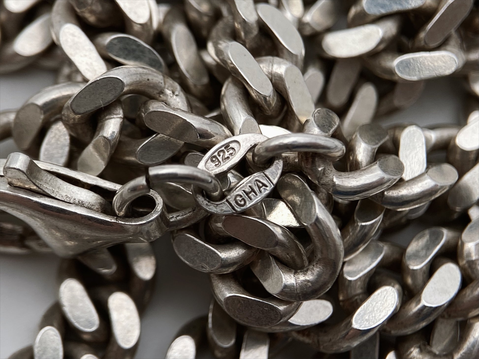 Sudėtis: sidabras Būklė: labai gera Išmatavimai: 48 cm Svoris: 34,2 g Spalva: sidabro Šalis: Švedija Žymėjimas: “GHA 925” Laikotarpis: 1960-1980 metai Rinkos vertė: 90-110 EUR Autentiška 925 prabos sterlingo sidabro grandinėlė, pagaminta Švedijoje ir pažymėta GHA – Anderssons Gravyr & Guldsmedsverk meistrų dirbtuvės ženklu. Klasikinio „curb / pancer“ tipo pynimas, būdingas XX a. vidurio skandinaviškam dizainui – lakoniškas, tvirtas ir ilgaamžis. Grandinėlė pasižymi solidžia konstrukcija, tvarkingai apdirbtais nareliais ir patikimu užsegimu.