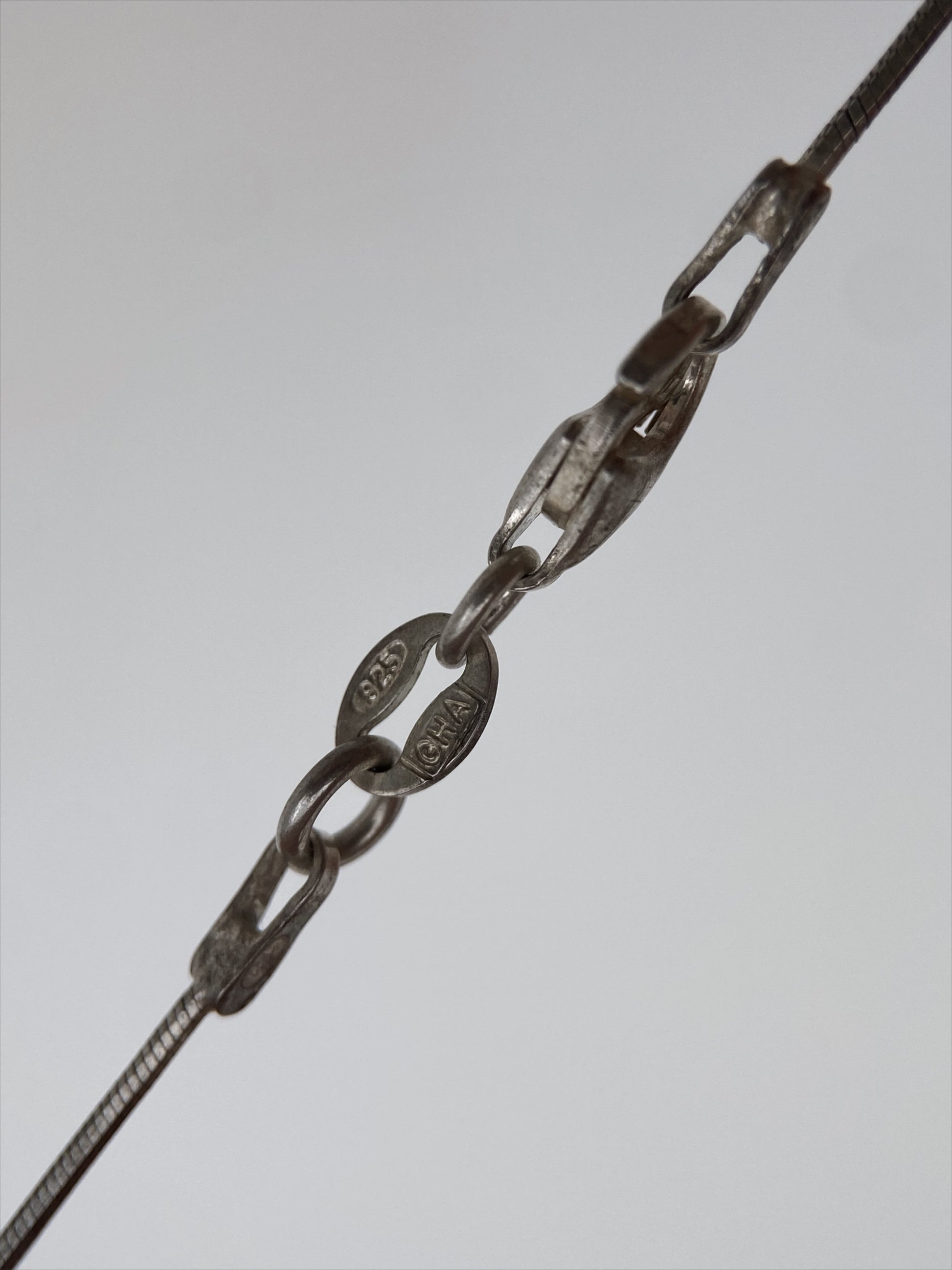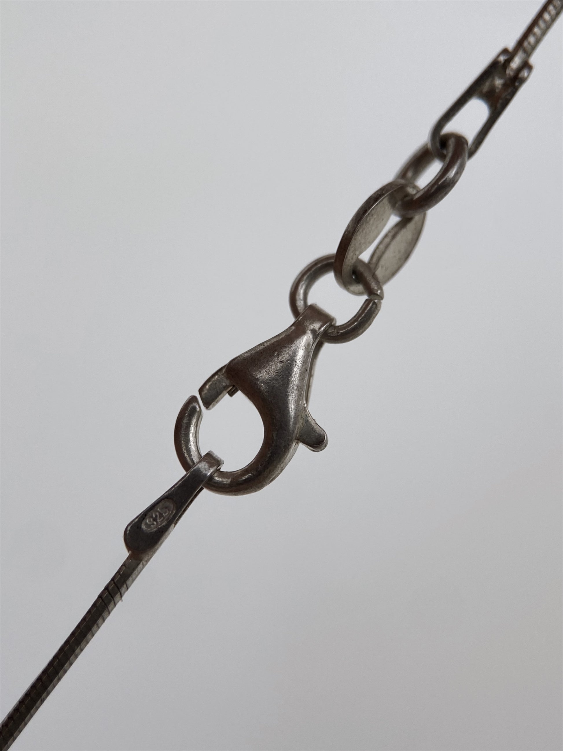 Sudėtis: sidabras Būklė: labai gera Išmatavimai: 43 cm (grandinėlės ilgis), 5,5 cm (pakabuko ilgis) Spalva: sidabro Šalis: Vokietija Žymėjimas: “925 GHA” Laikotarpis: 1990-2000 metai Rinkos vertė: 50-60 EUR