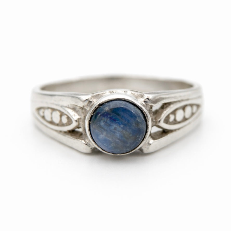 Sidabro žiedas su apvaliu mėlynu akmeniu, kurio šonus puošia subtilūs ažūriniai ornamentai, suteikiantys papuošalui lengvumo ir dekoratyvumo. Natūrali akmens tekstūra sukuria švelnų spalvų žaismą nuo pilkai mėlynos iki sodresnės mėlynos. Prekės kodas: RF133
