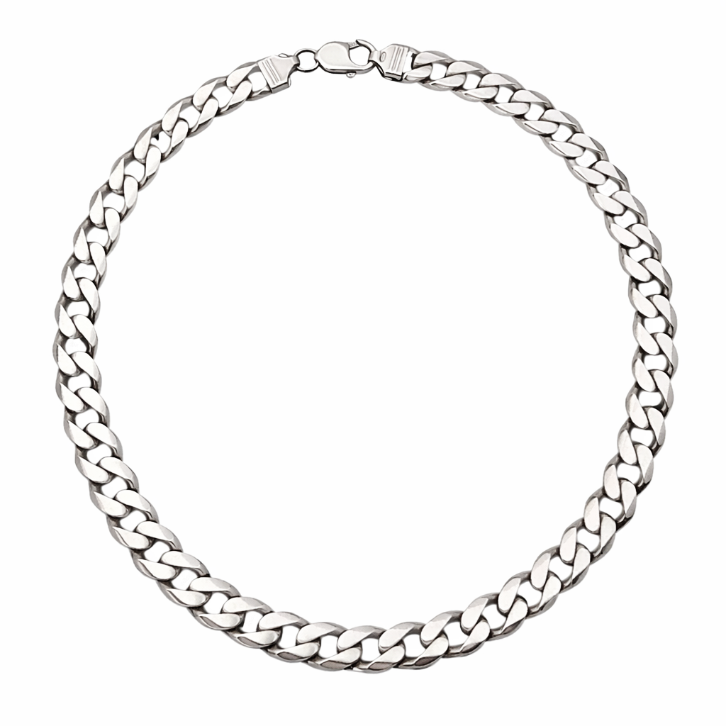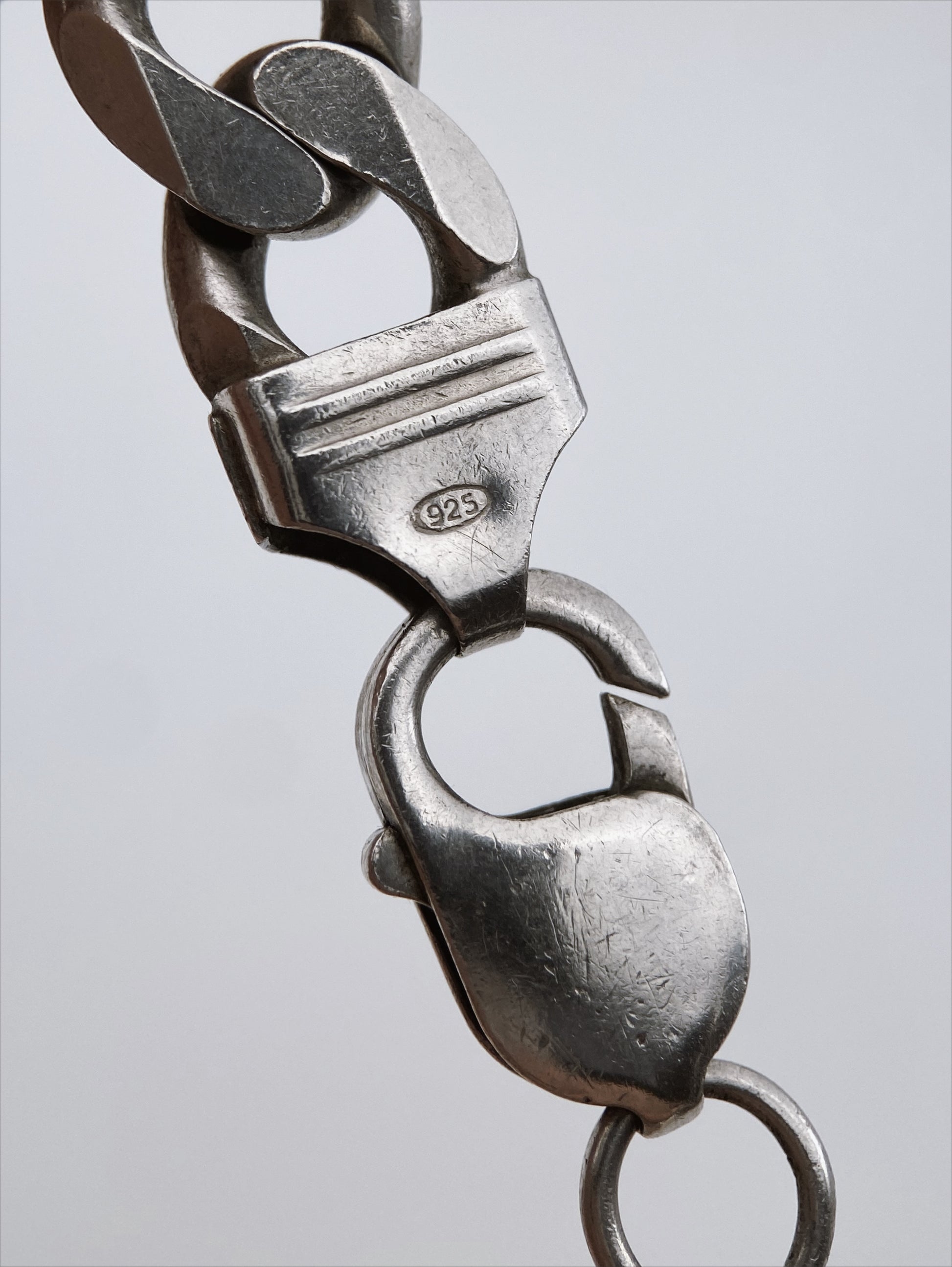 Įspūdingo svorio ir aukštos kokybės 925 sidabro grandinė, pagaminta klasikiniu “Flat curb / Cuban” pynimo stiliumi. Daugiau kaip 90 g sverianti grandinė yra solidi, tvirta ir prabangi.