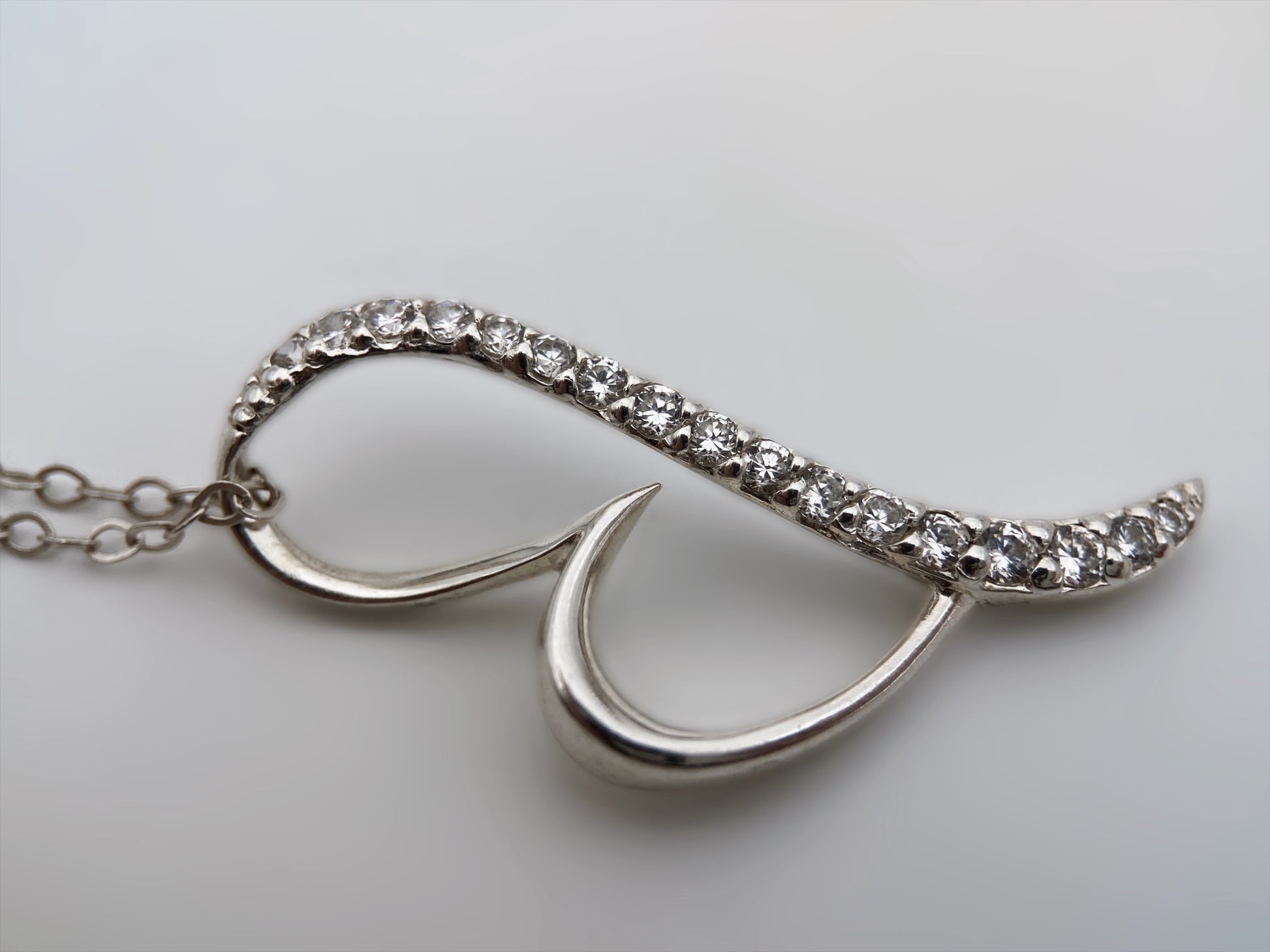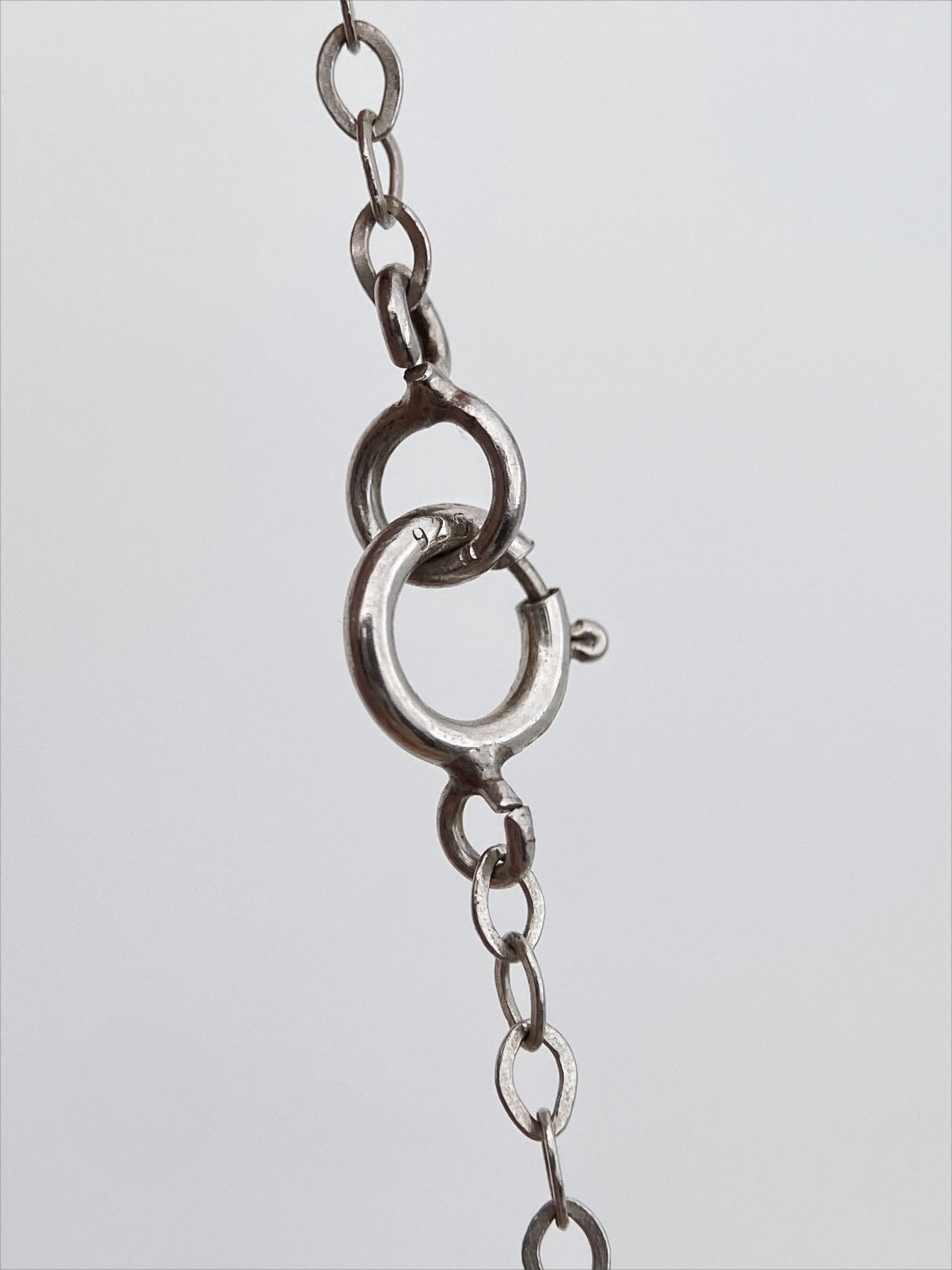 Sudėtis: sidabras, cirkoniai Būklė: labai gera Išmatavimai (grandinėlė): 40 cm Išmatavimai (pakabukas): 4,9 x 1,5 cm Svoris: 4,65 g Spalva: sidabro Šalis: Danija Žymėjimas: “925, JAa” Laikotarpis: 1990-2000 metai Rinkos vertė: 50-70 EUR