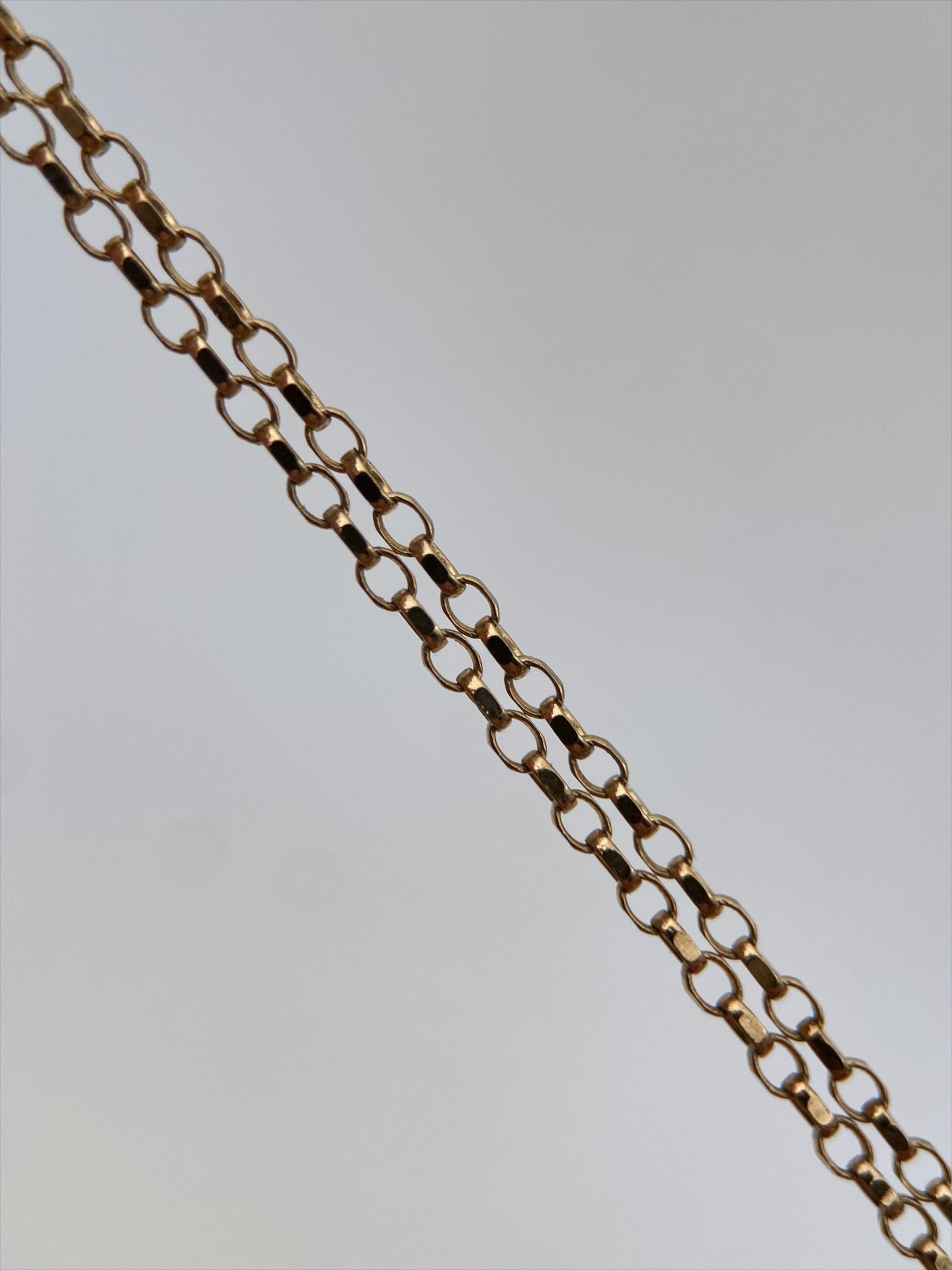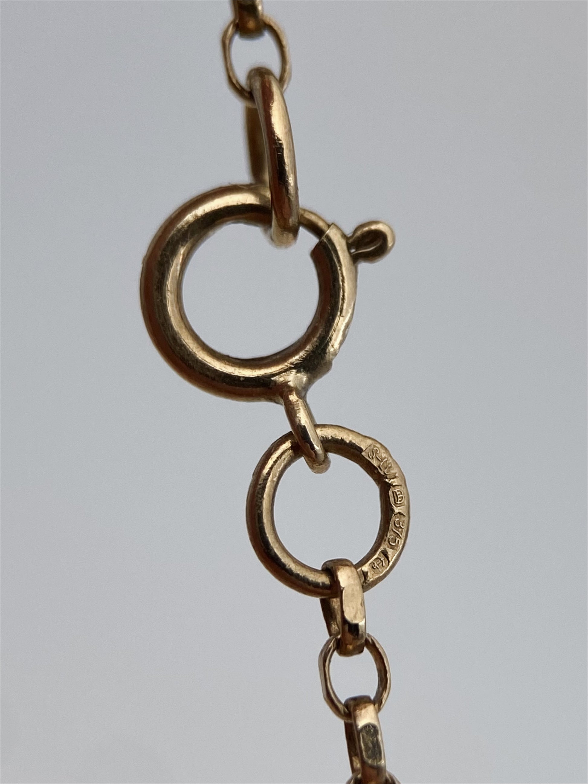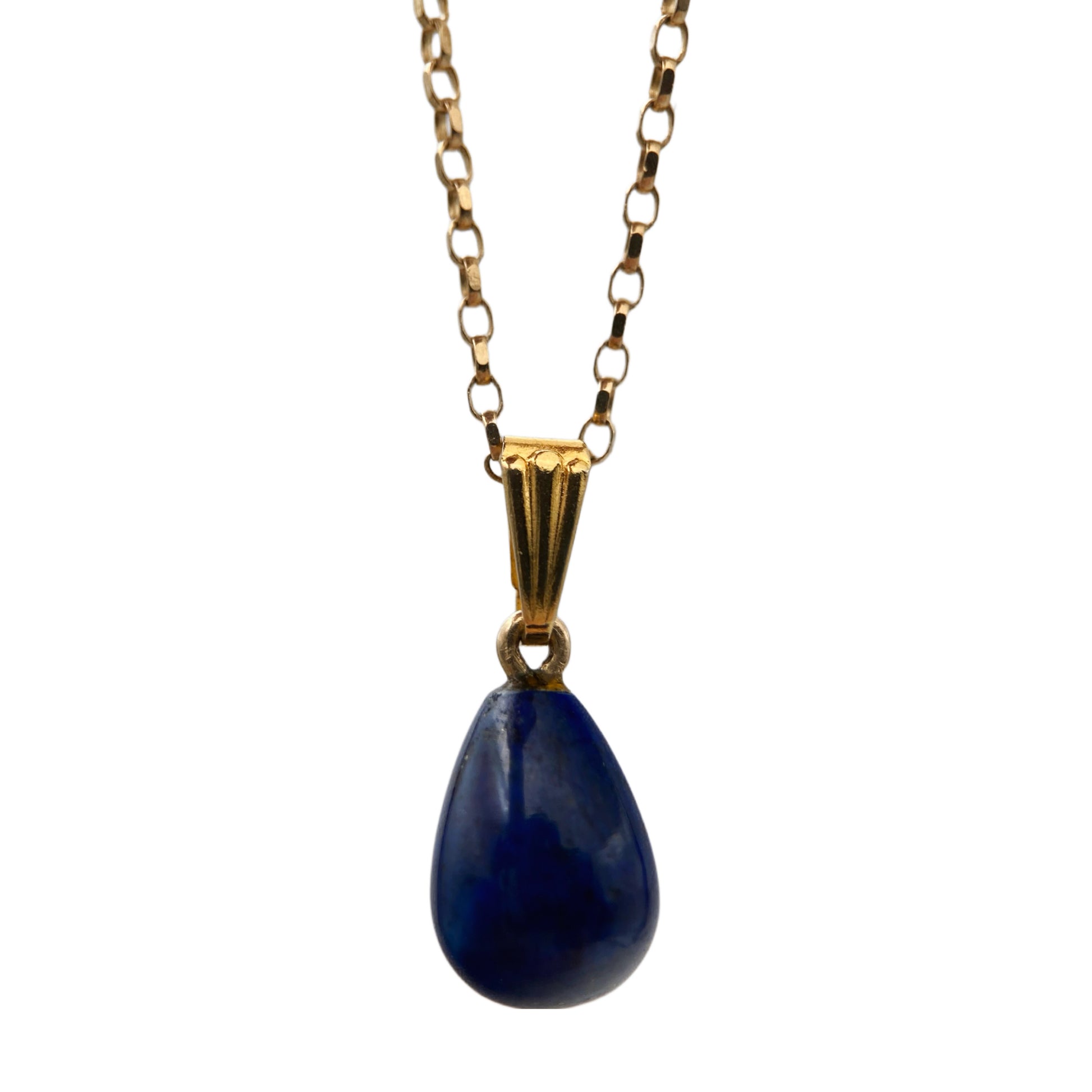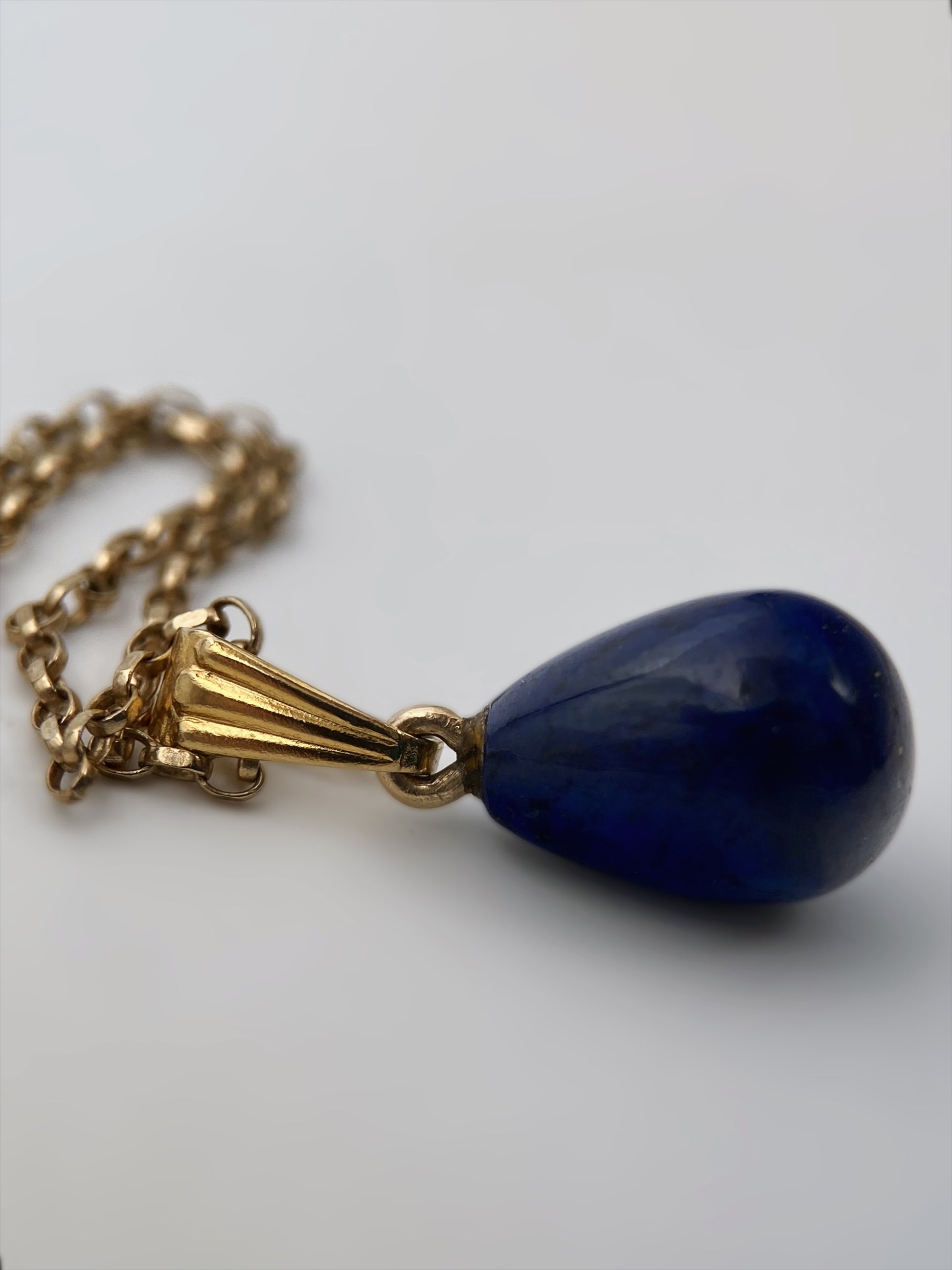 XX a. II pusės vintažinis vėrinys, pagamintas iš 9 karatų aukso (375), su elegantišku lašo formos mėlynu akmens pakabuku. Papuošalas išsiskiria subtilia, minimalistine estetika ir aukštos kokybės metalo apdirbimu. Grandinėlė pažymėta britiškais kontroliniais žymėjimais – karūna ir 375, būdingais Jungtinės Karalystės aukso prabos patikrai. Užsegimas – klasikinis spyruoklinis, taip pat su prabos žyma, kas rodo, jog grandinėlė yra originali ir autentiška, o ne vėlesnis pakaitalas. Pakabukas – natūralaus akmens (lapis lazuli) lašas, įtvirtintas paprastame laikiklyje. Akmuo pasižymi sodria mėlyna spalva su natūraliais intarpais, būdingais natūraliai kilmei.