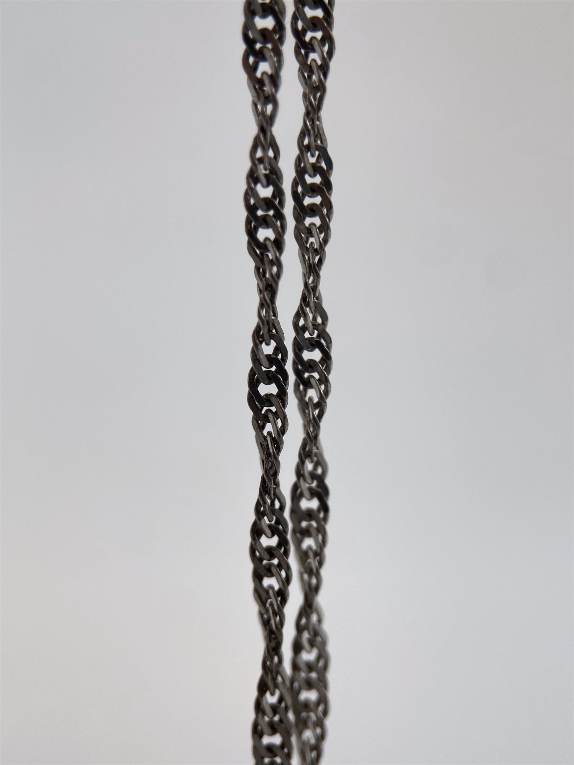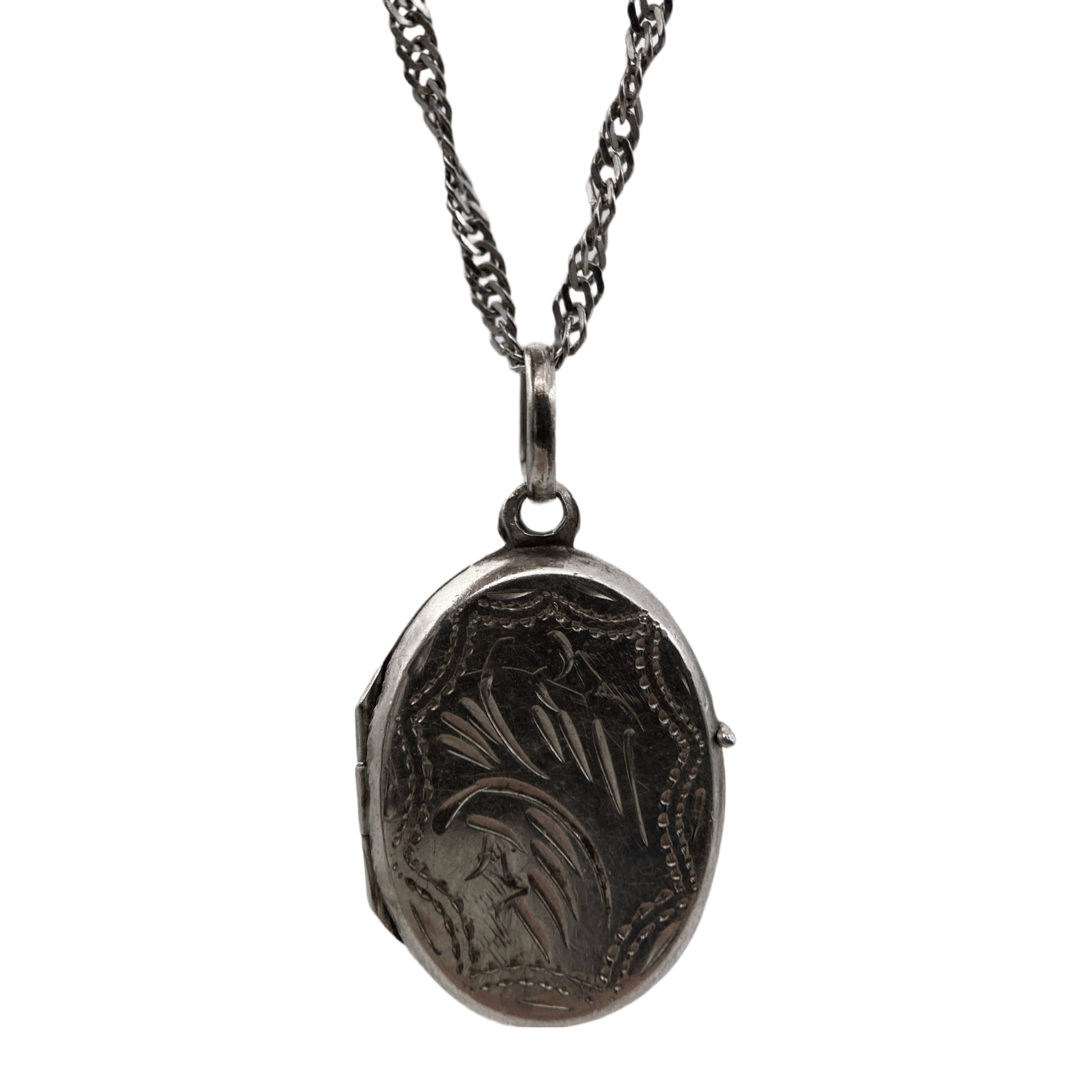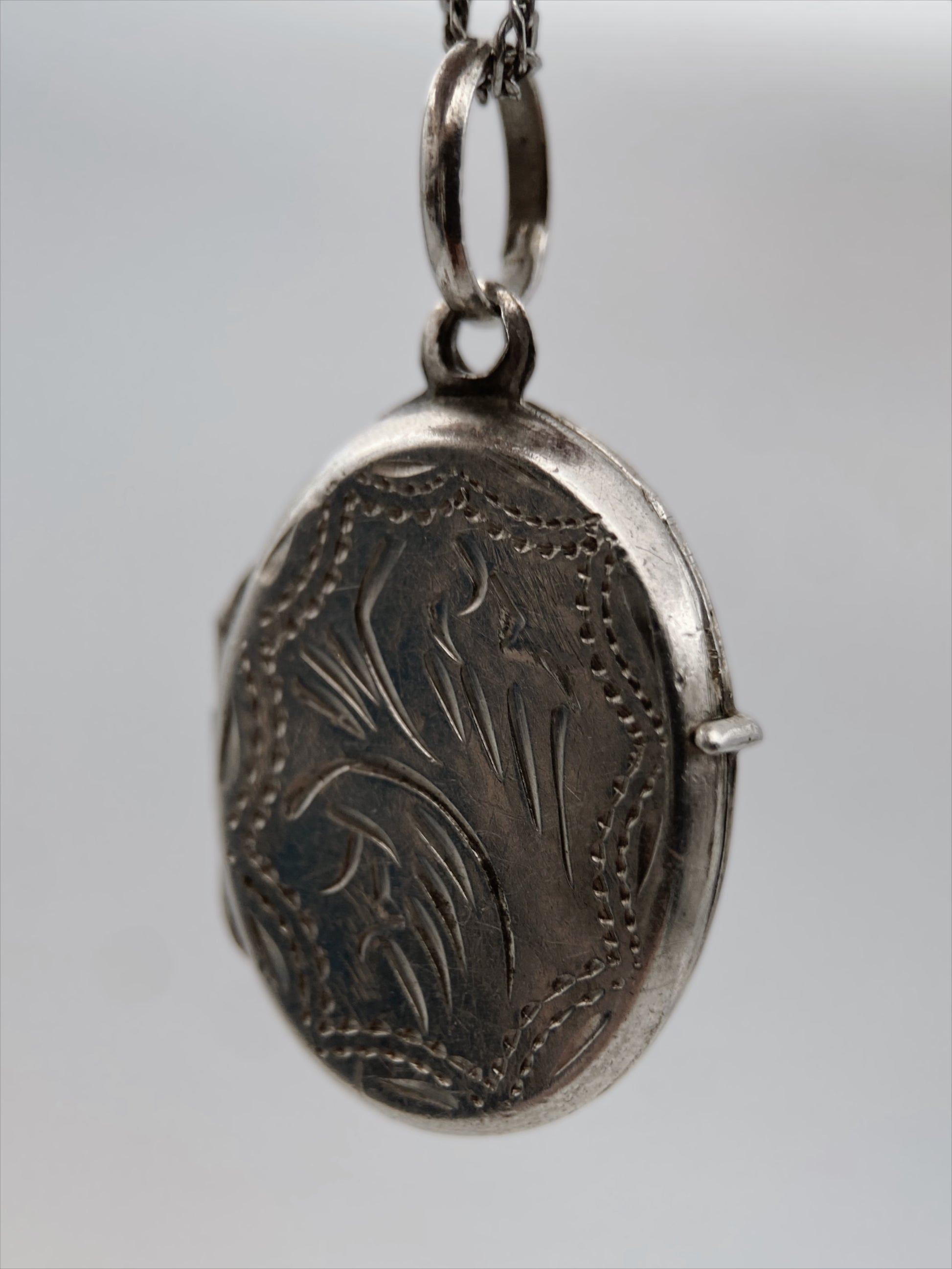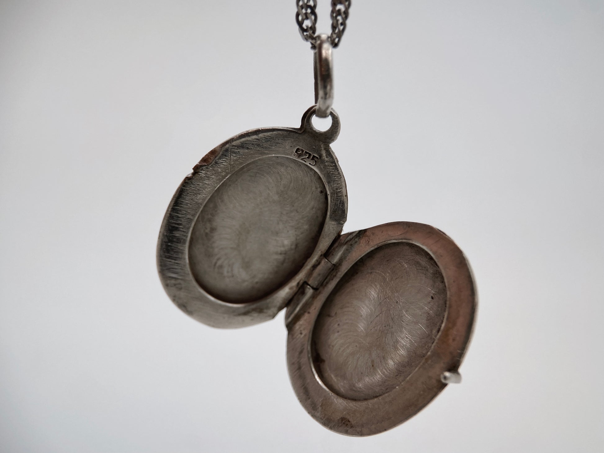 925 prabos sidabrinis atverčiamas medalionas (locket) su originalia grandinėle. Ovalios formos medalionas dekoruotas subtilia rankinio graviravimo augaline kompozicija, būdinga XX a. vidurio Šiaurės Europos juvelyrikai. Medalionas atsidaro, skirtas laikyti nuotrauką ar nedidelį atminimo simbolį. Vidinė pusė su aiškiu 925 sidabro žymėjimu. Grandinėlė taip pat sidabrinė, su klasikiniu spyruokliniu žiediniu užsegimu, pažymėtu 925 – tai patikimas, laikotarpiui būdingas užsegimas.