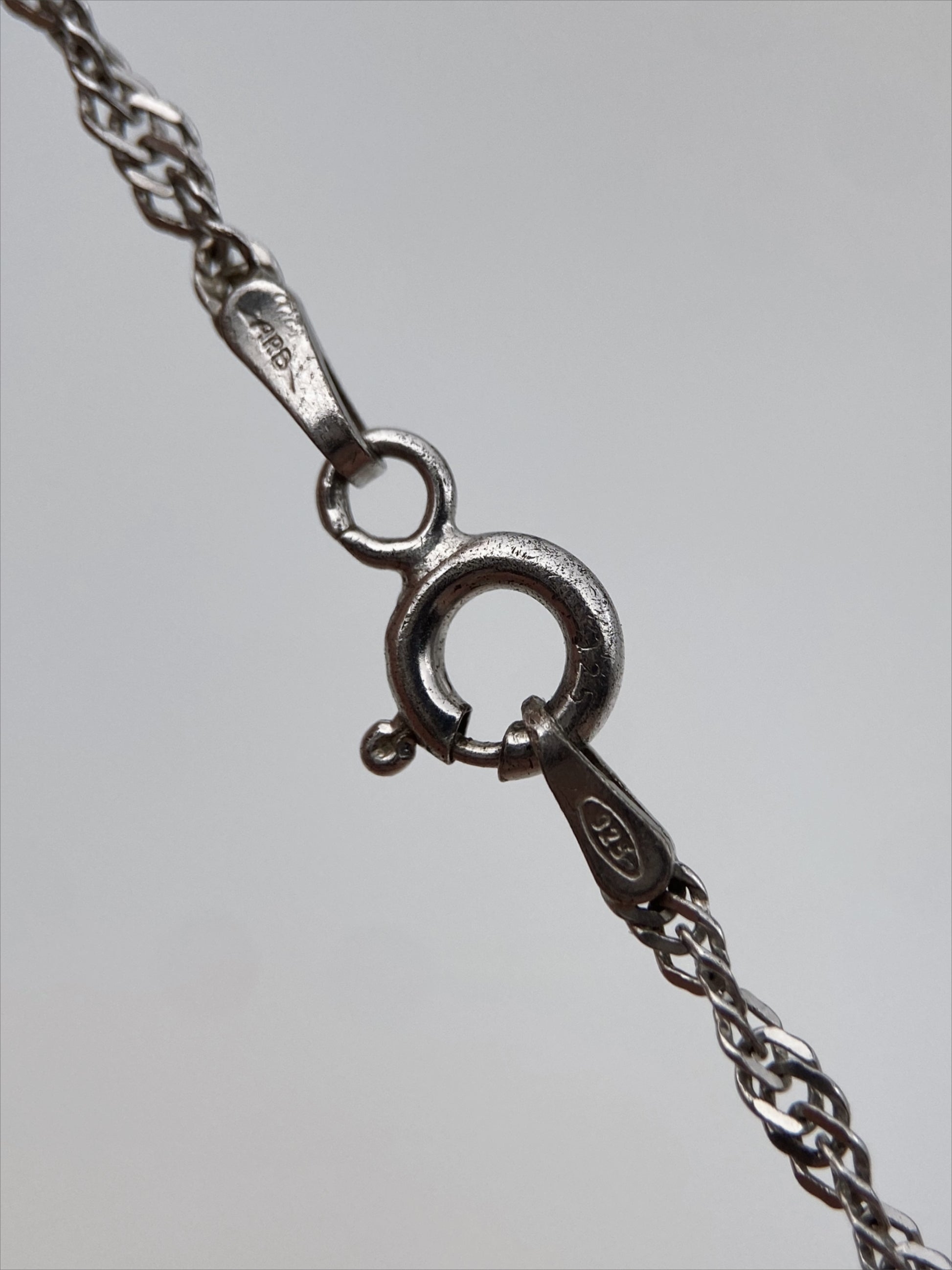 Sudėtis: sidabras Gamybos būdas: rankų darbas Būklė: labai gera Išmatavimai (grandinėlė): 44,5 cm Išmatavimai (pakabukas): 2,6 x 1,9 cm Svoris: 6,8 g Spalva: sidabro Šalis: Vokietija Žymėjimas: “925, 2ARB” Laikotarpis: 1950-1970 metai Rinkos vertė: 60-90 EUR