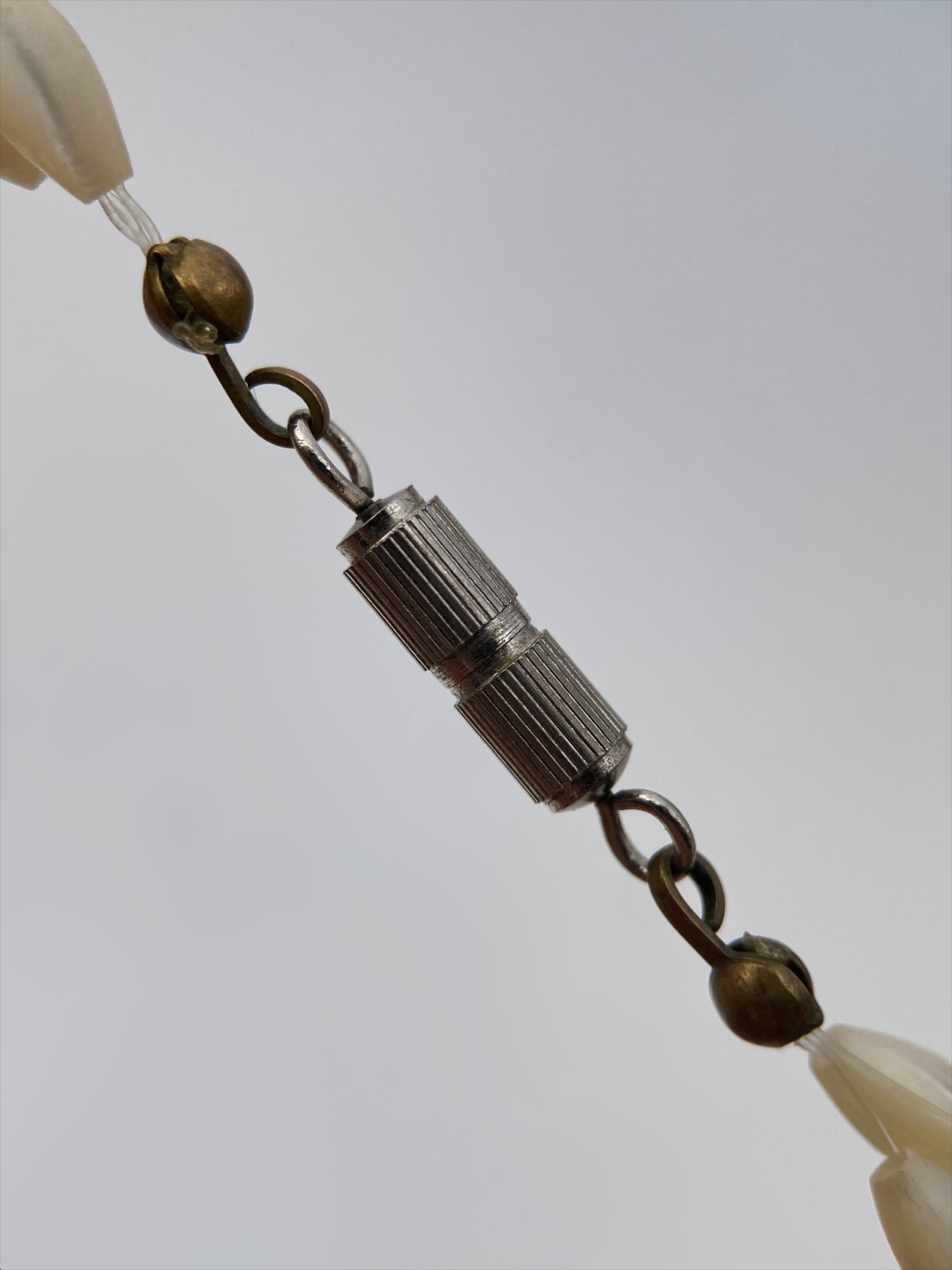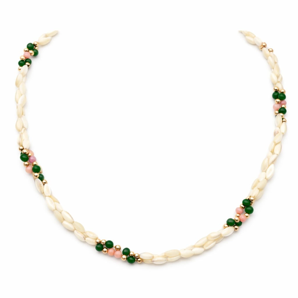 Elegantiškas vintažinis vėrinys, sudarytas iš pailgų, lapelio formos kriauklės (mother-of-pearl) karoliukų, papildytų smulkiais žaliais ir rožiniais akcentiniais karoliukais. Vėrinys užsegamas metaliniu cilindriniu (sraigtiniu) užsegimu, būdingu 1950–1960 m. laikotarpio papuošalams. Dizainas simetriškas, lengvas ir patogus nešioti.