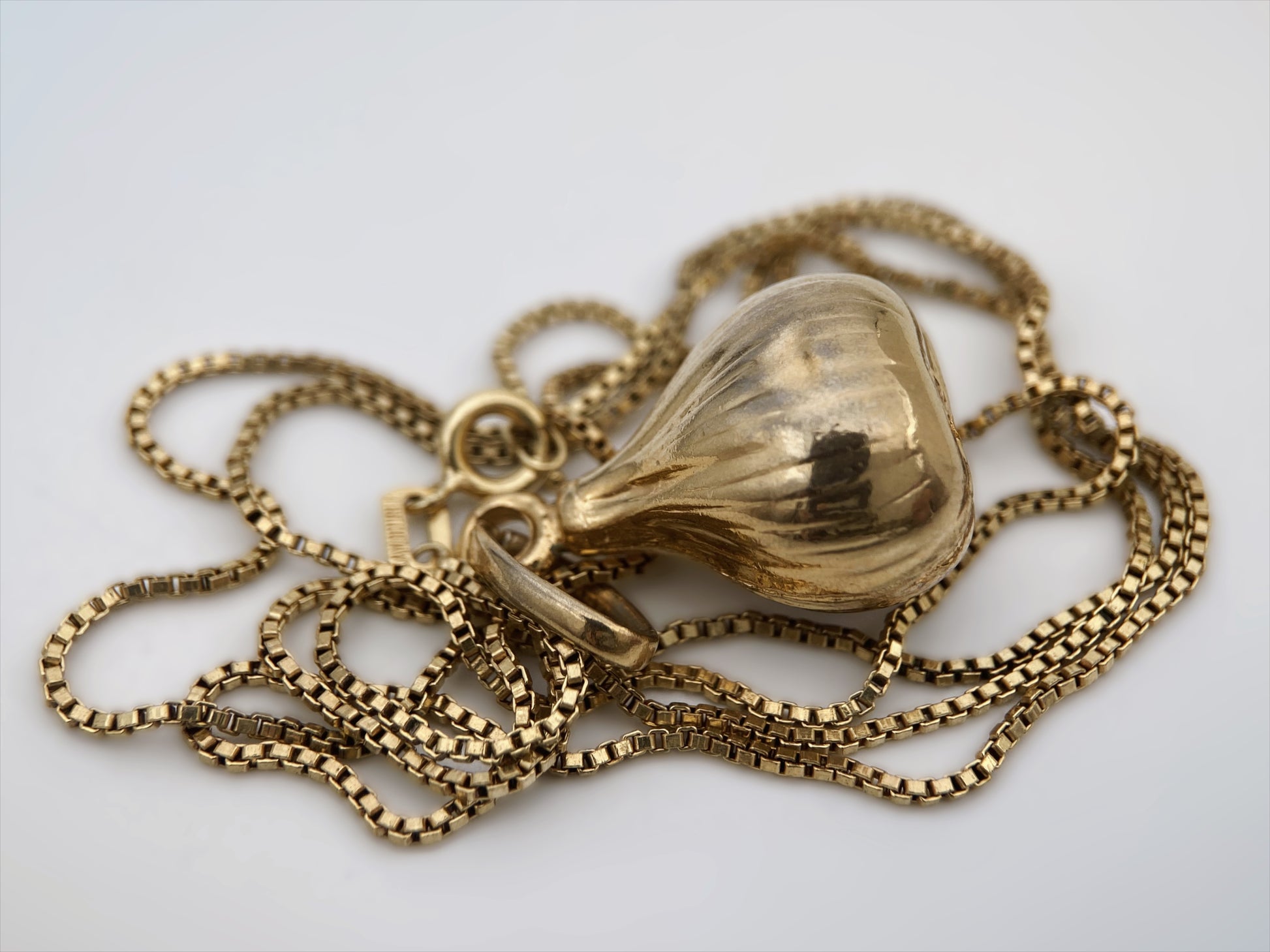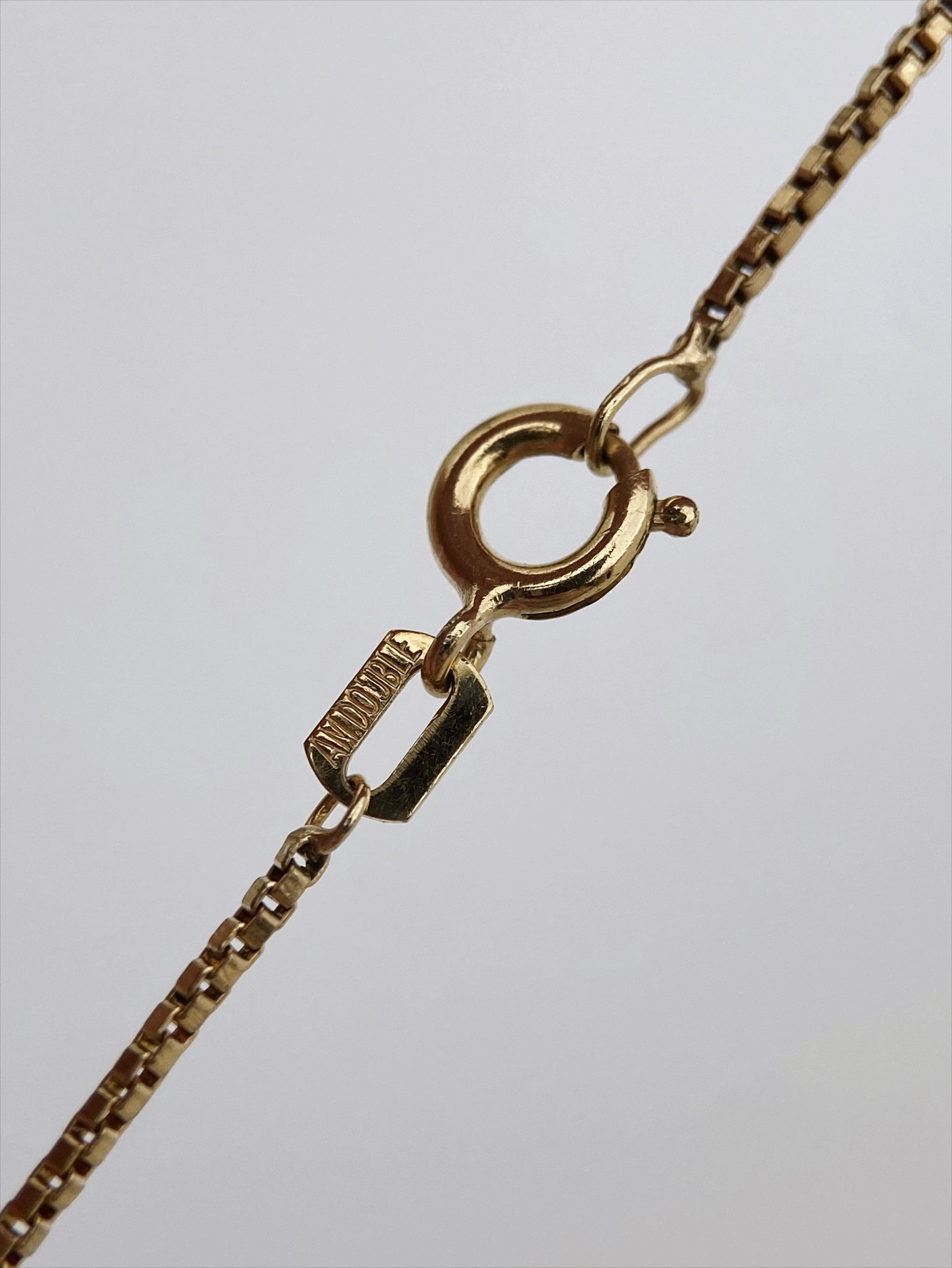 Sudėtis: paauksuotas metalas Būklė: labai gera Išmatavimai (pakabukas): 3 × 1,5 cm Išmatavimai (grandinėlė): 65 cm Spalva: aukso Šalis: Prancūzija (pakabukas), JAV (grandinėlė) Žymėjimas: pakabukas nežymėtas, grandinėlė – “AM DOUBLE” Laikotarpis: 1960–1970 metai Rinkos vertė: 60–90 EUR