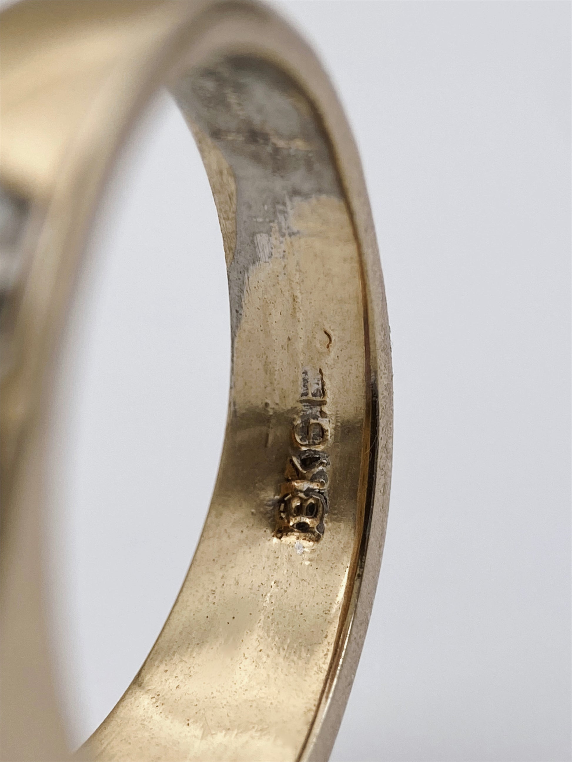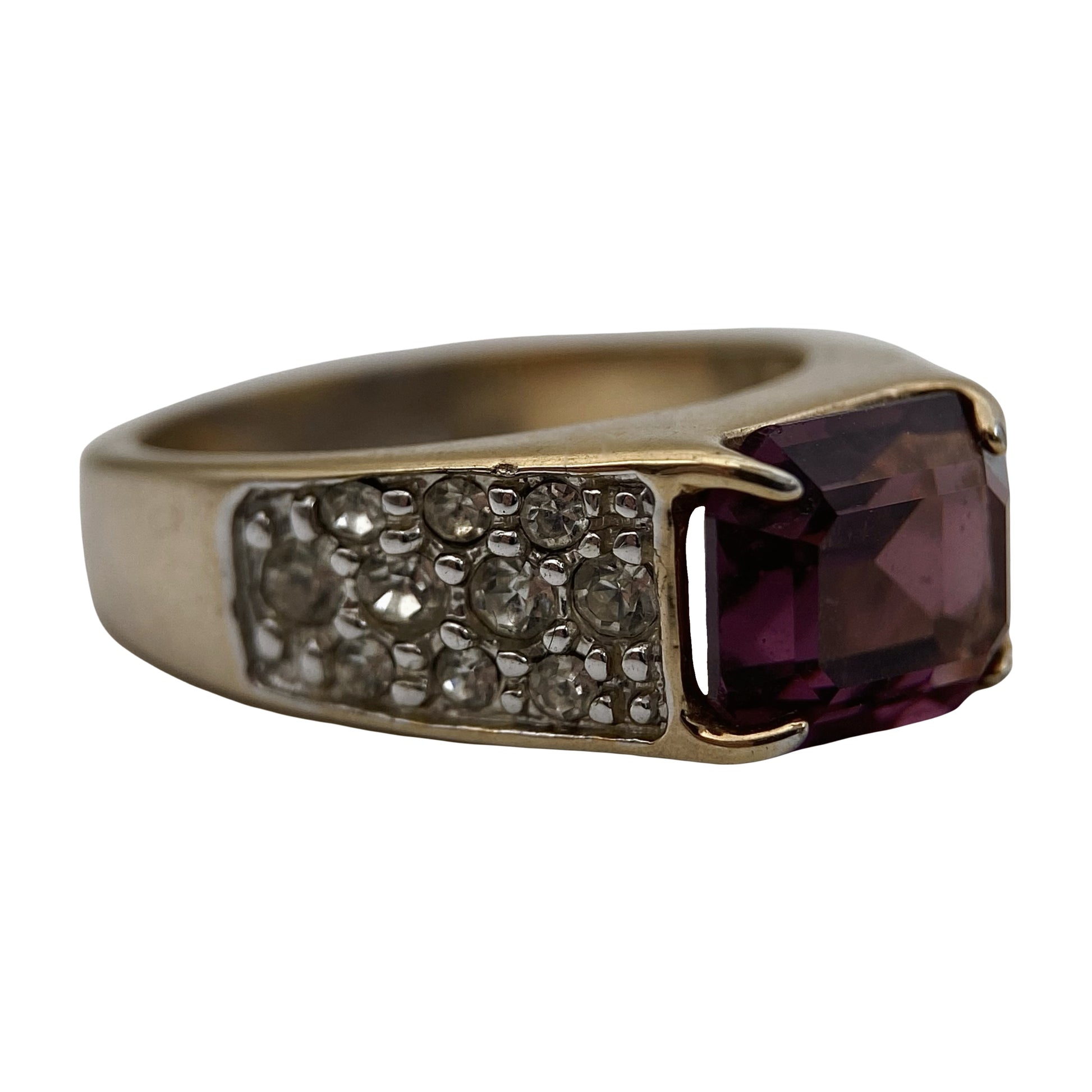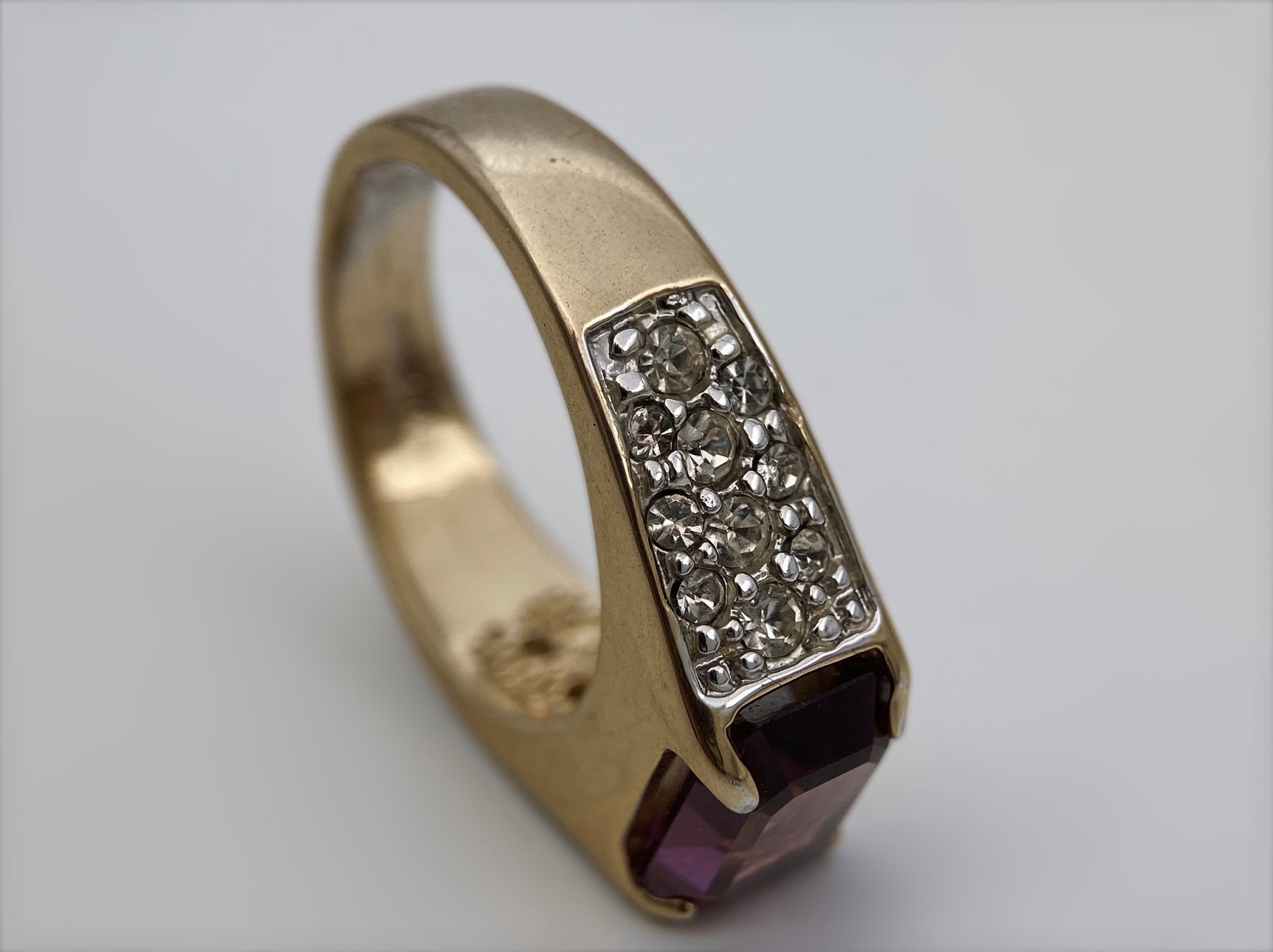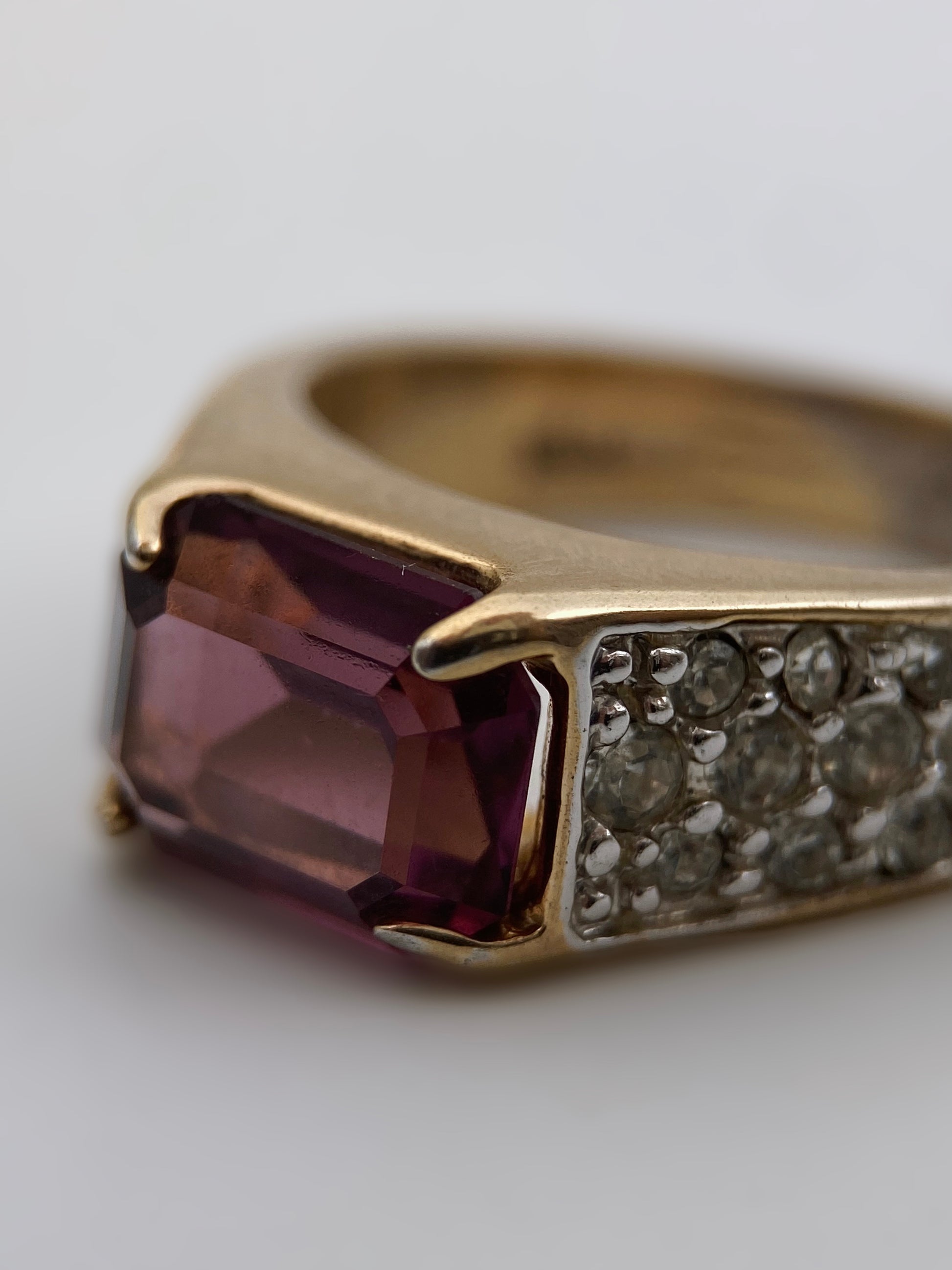 Stilingas vintažinis žiedas su 18 karatų auksiniu elektrocheminiu padengimu (18K GE). Pagrindinis akmuo – didelis purpurinis stiklo kristalas, šonuose įstatyti skaidrūs kristalai. Tai klasikinis 8–9 dešimtmečio „cocktail ring“ stiliaus žiedas.