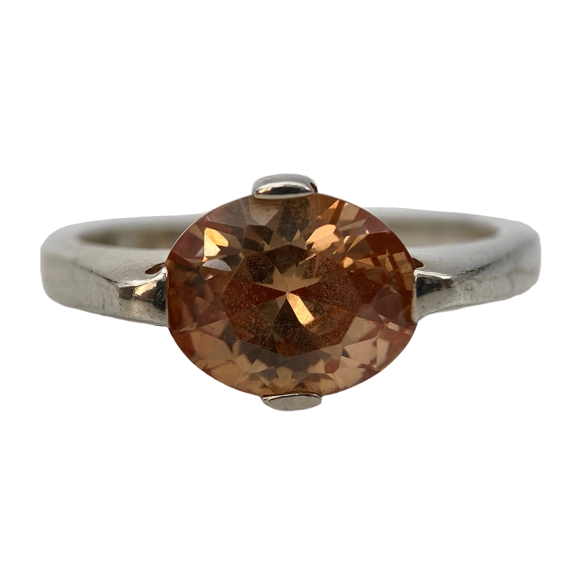 925 prabos sidabro žiedas, dekoruotas dideliu šampano–persikinės spalvos stiklo kristalu. Akmuo tvirtinamas keturiais laikikliais, pjūvis ryškiai atspindi šviesą.
