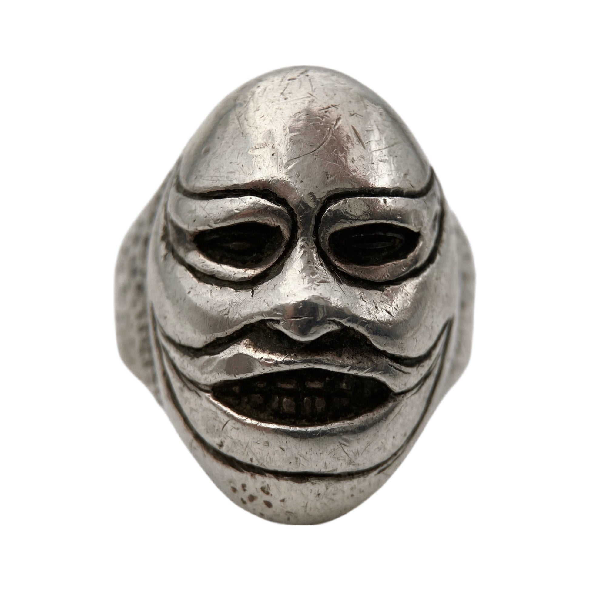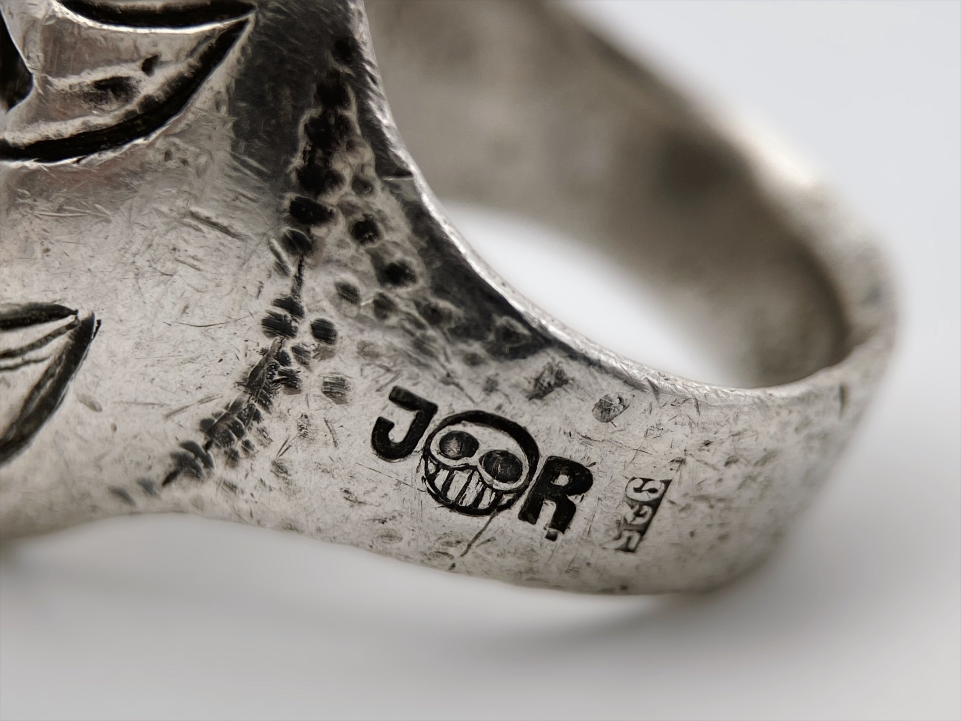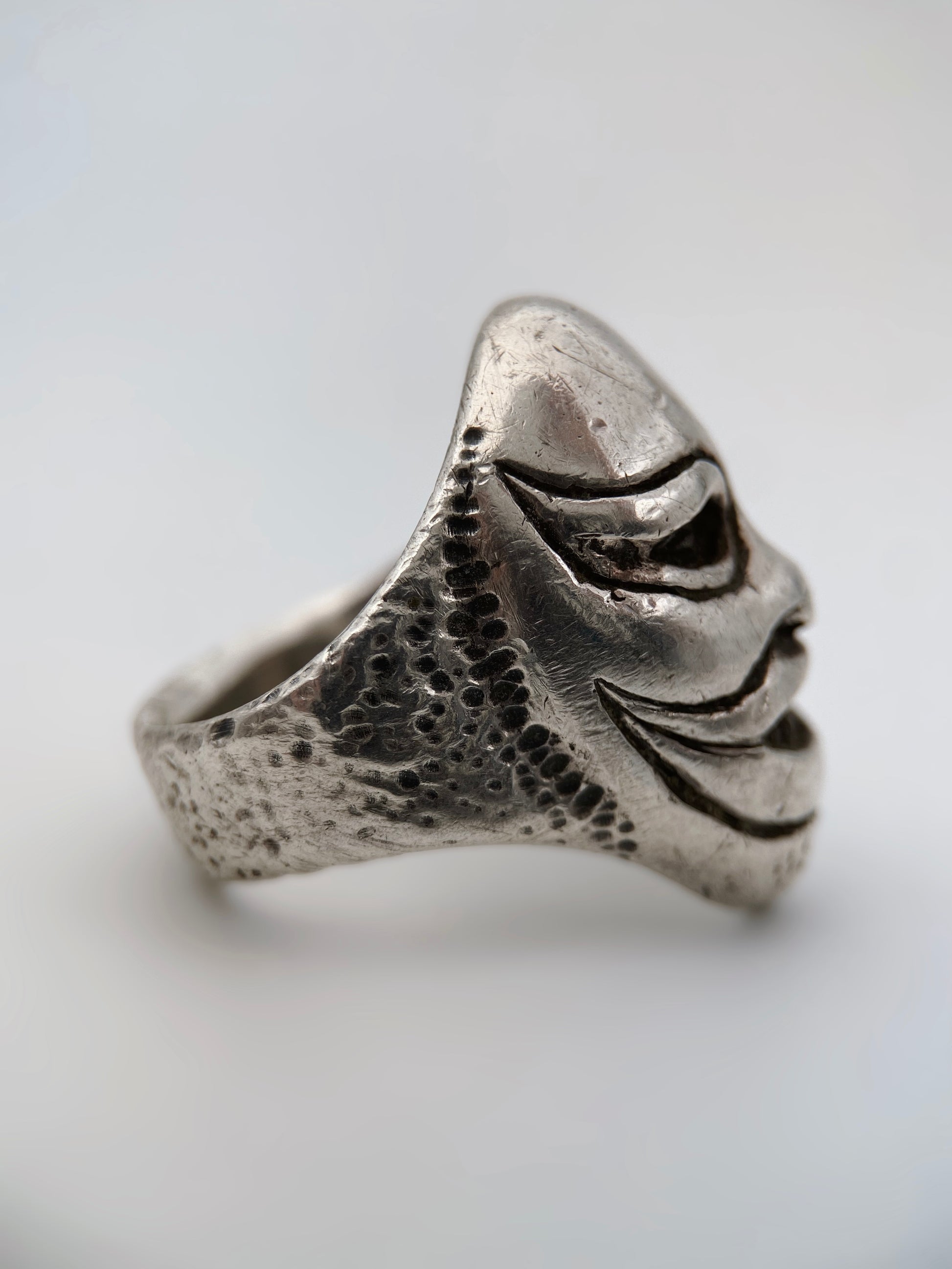 Išraiškingas 925 sidabro žiedas, sukurtas skandinaviškos brutalist / gothic estetikos dvasia. Žiedas dekoruotas skulptūrišku kaukės motyvu, pasižyminčiu gilia reljefine faktūra ir natūralia patina. Vidinėje pusėje – autoriaus piktografinis ženklas (J–simbolis–R) ir 925 praba, būdinga Švedijos ir Danijos juvelyrikos dirbtuvėms.