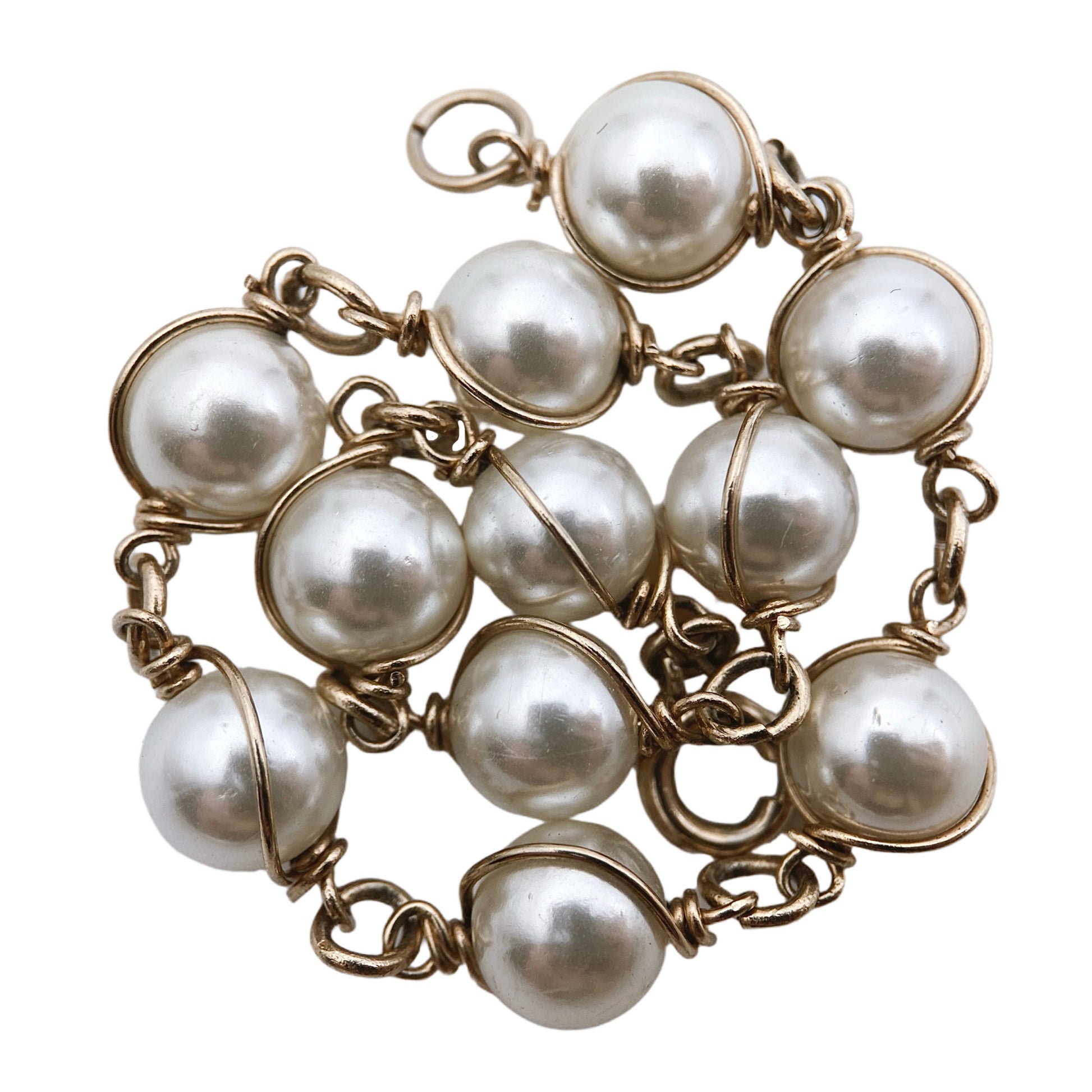 Ši apyrankė su perlų imitacijomis ir paauksuotu vieliniu apvijimu yra vintažinė „Sarah Coventry“ bižuterija. Dirbtiniai perlai - tai klasikiniai „Sarah Cov“ perliukai – lengvi, šiek tiek blizgūs, dažnai plastikinio arba stiklinio pagrindo su perlamutriniu padengimu. Apvijimas vielute - subtilus dekoratyvinis sprendimas, įprastas 1960–1970 m. dizainui. Auksuotas bazinis metalas (greičiausiai žalvaris arba cinko lydinys). Užsegimas: spyruoklinis žiedas (spring ring), dažnas laikotarpio ženklas.