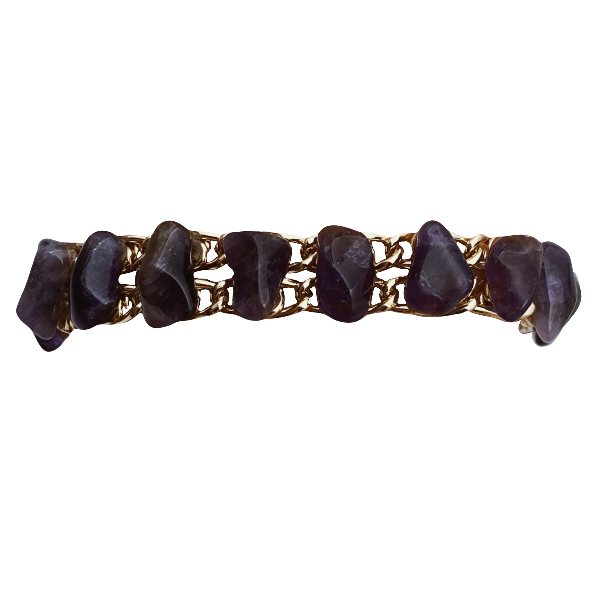 Vintažinė amerikietiška apyrankė, pagaminta iš paauksuoto metalo ir puošta natūralių ametisto akmenukų gabalėliais. Kiekvienas akmuo išsaugojęs organišką formą, subtiliai poliruotas, todėl apyrankė yra unikali. Dvigubos grandinėlės pynimas sudaro tvirtą, dekoratyvų pagrindą, o klasikinis „spring ring“ tipo užsegimas būdingas JAV gamybai XX a. viduryje. Tokio tipo apyrankes 6–7 dešimtmetyje JAV kūrė mažos studijinės dirbtuvės ir menininkai, taip pat kai kurios žinomos kompanijos turėjo panašių „natūralaus akmens“ linijų: Cadoro, Les Bernard, Hobé, Napier Artisan Collection, Robert Originals, DeMario. Tačiau daug tokių kūrinių buvo be ženklinimo – jie buvo gaminami butikuose ar rankų darbo juvelyrų dirbtuvėse.