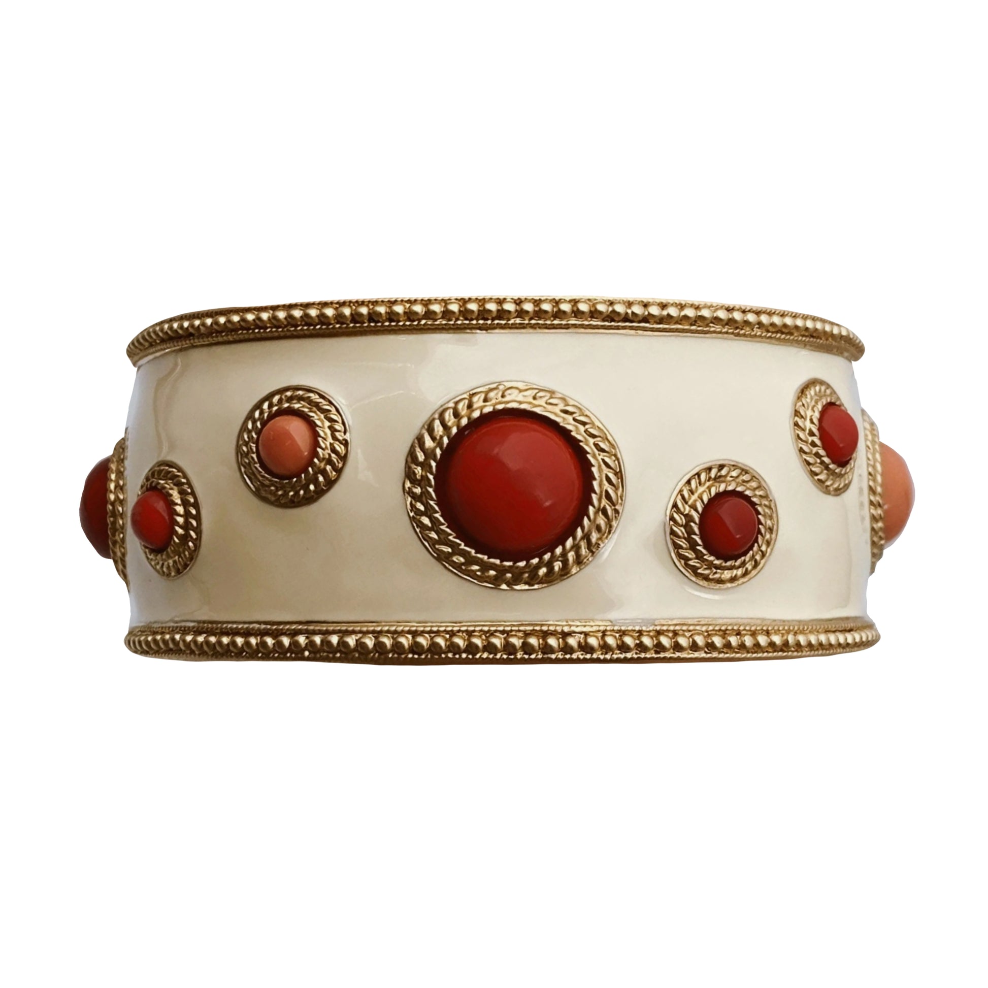 Ši apyrankė yra Kenneth Jay Lane (KJL) kūrinys, pagamintas vėlyvuoju laikotarpiu (1990-2000 m.), tai rodo ženklinimas “©KJL” + „CHINA“ (dalis vėlesnės KJL produkcijos buvo gaminama Kinijoje). Apyrankė yra šiuolaikiško, bet retro įkvėpto dizaino. Tai estetiškas ir masyvus dizainas, išskirtinė spalvinė kombinacija (koralo ir dramblio kaulo/smėlio spalvos emalis).