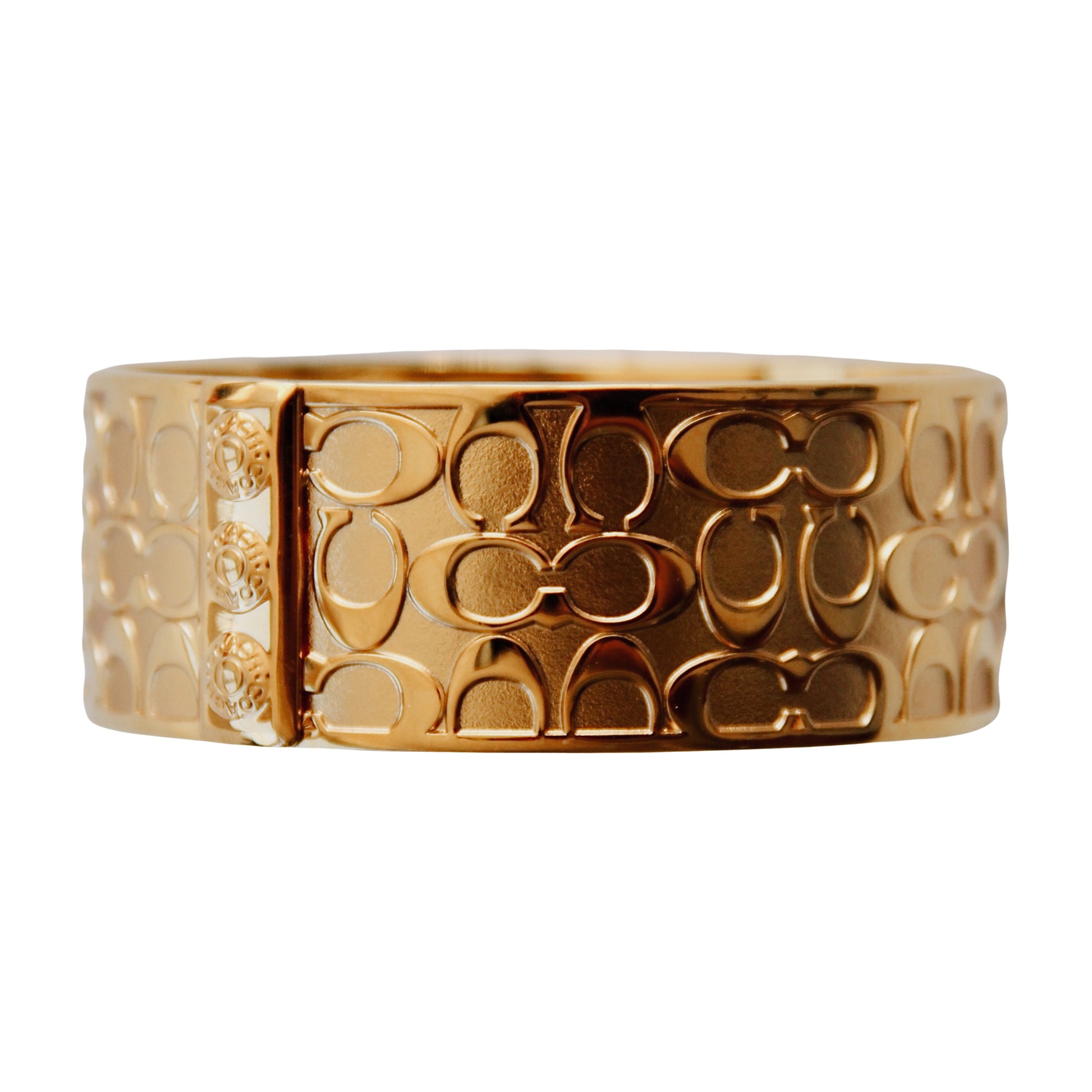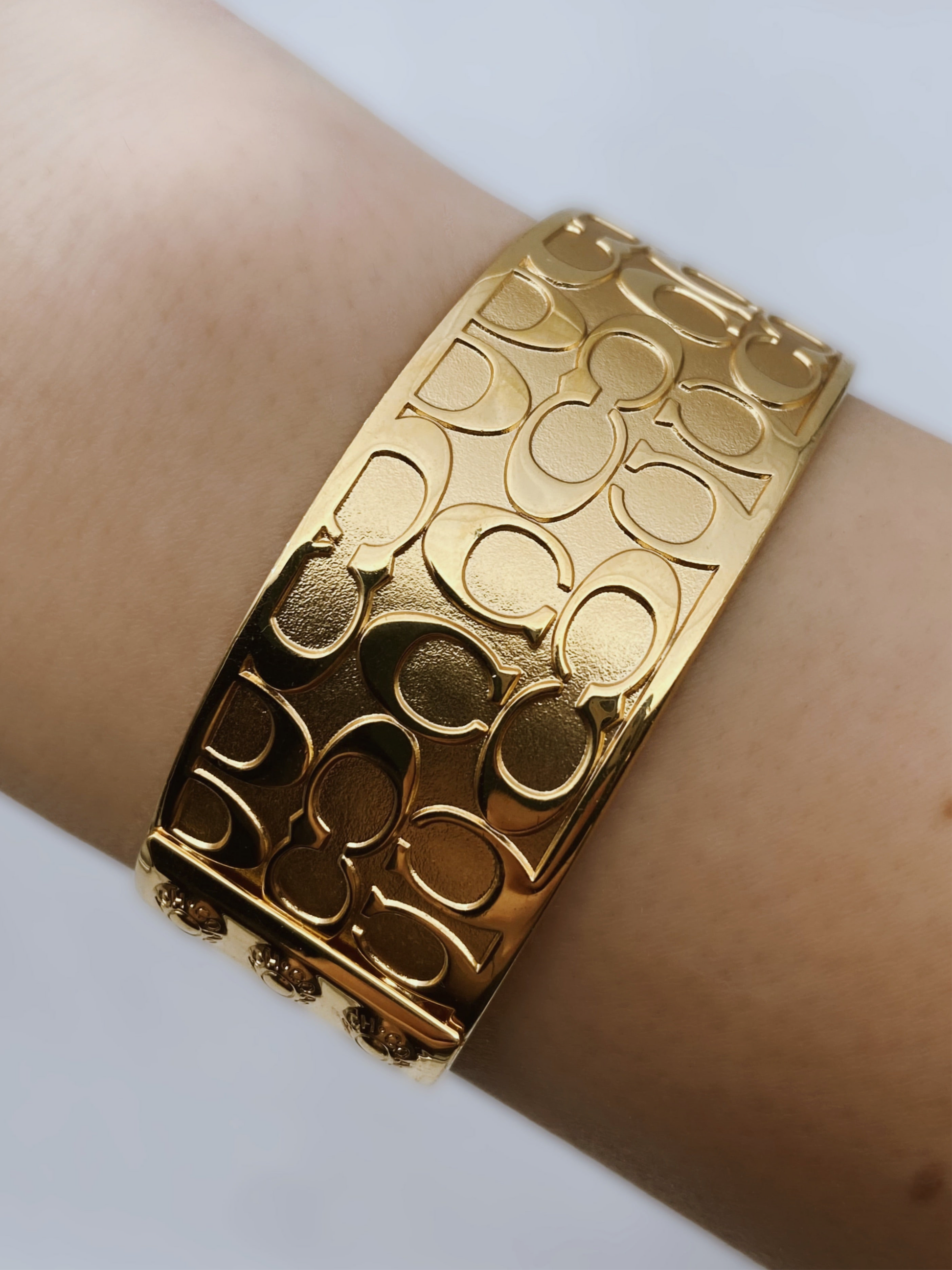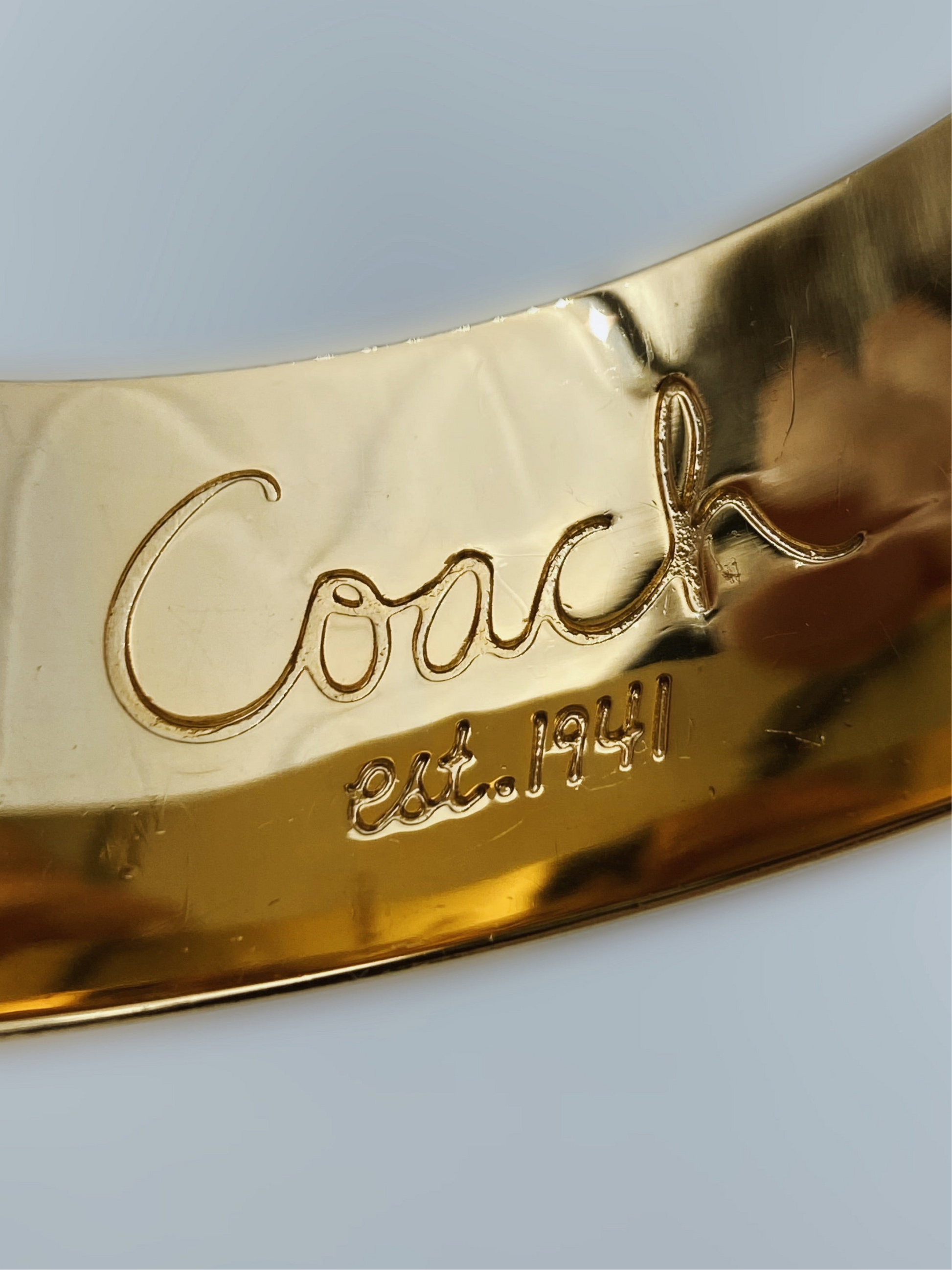 Tai “Coach” prekinio ženklo paauksuota metalinė apyrankė su klasikiniais „Signature C“ raštais. Vidinėje pusėje yra išgraviruotas logotipas: Coach est. 1941.