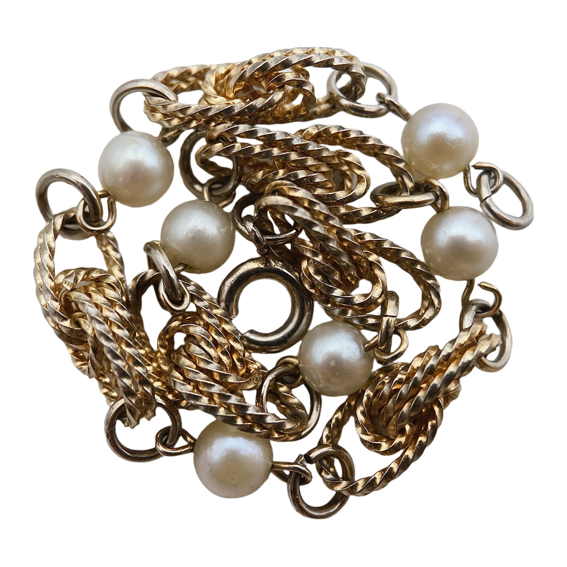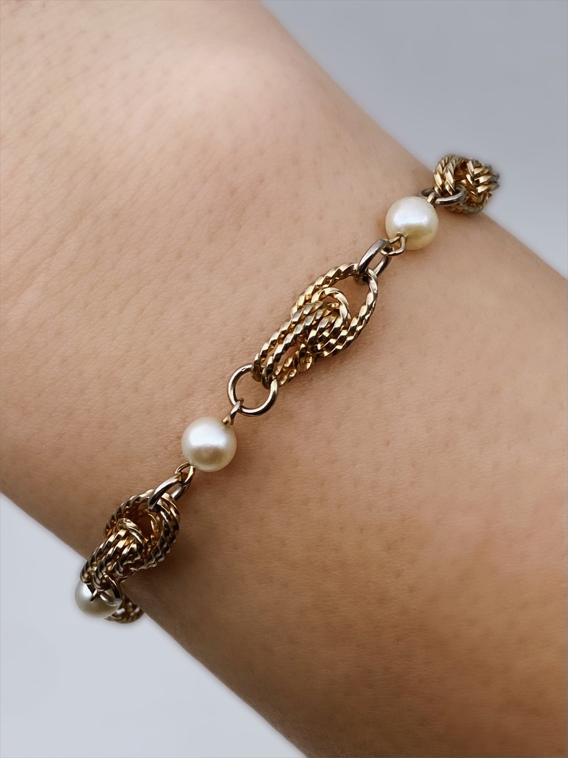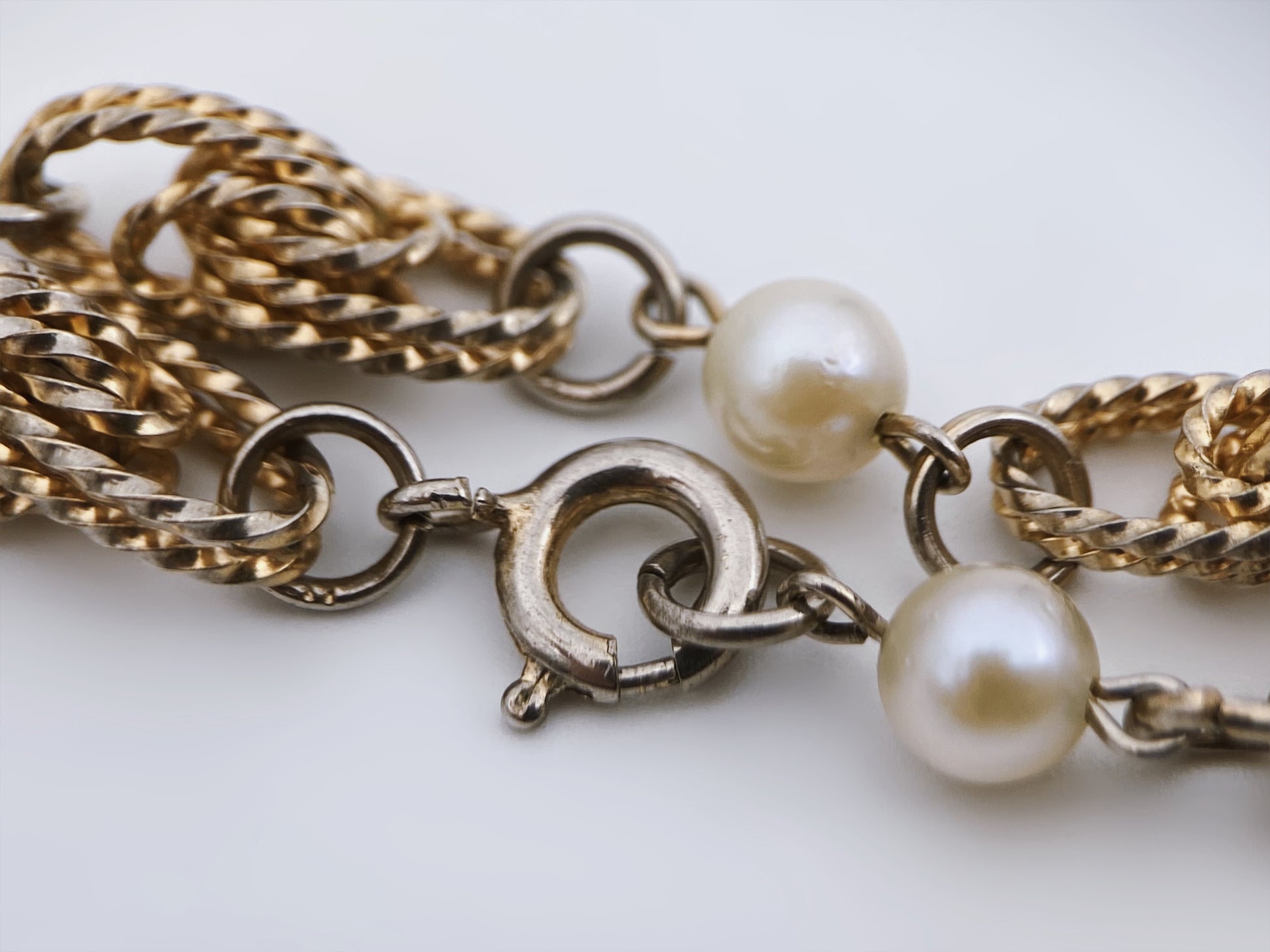 Apyrankė pagaminta iš suktos aukso spalvos grandinėlės kilpų (susuktų spiralių) ir perlų. Senas stiliaus spyruoklinis užsegimas (spring ring clasp) – gana dažnas vintažinėje bižuterijoje, ypač 1950–1970 m.
