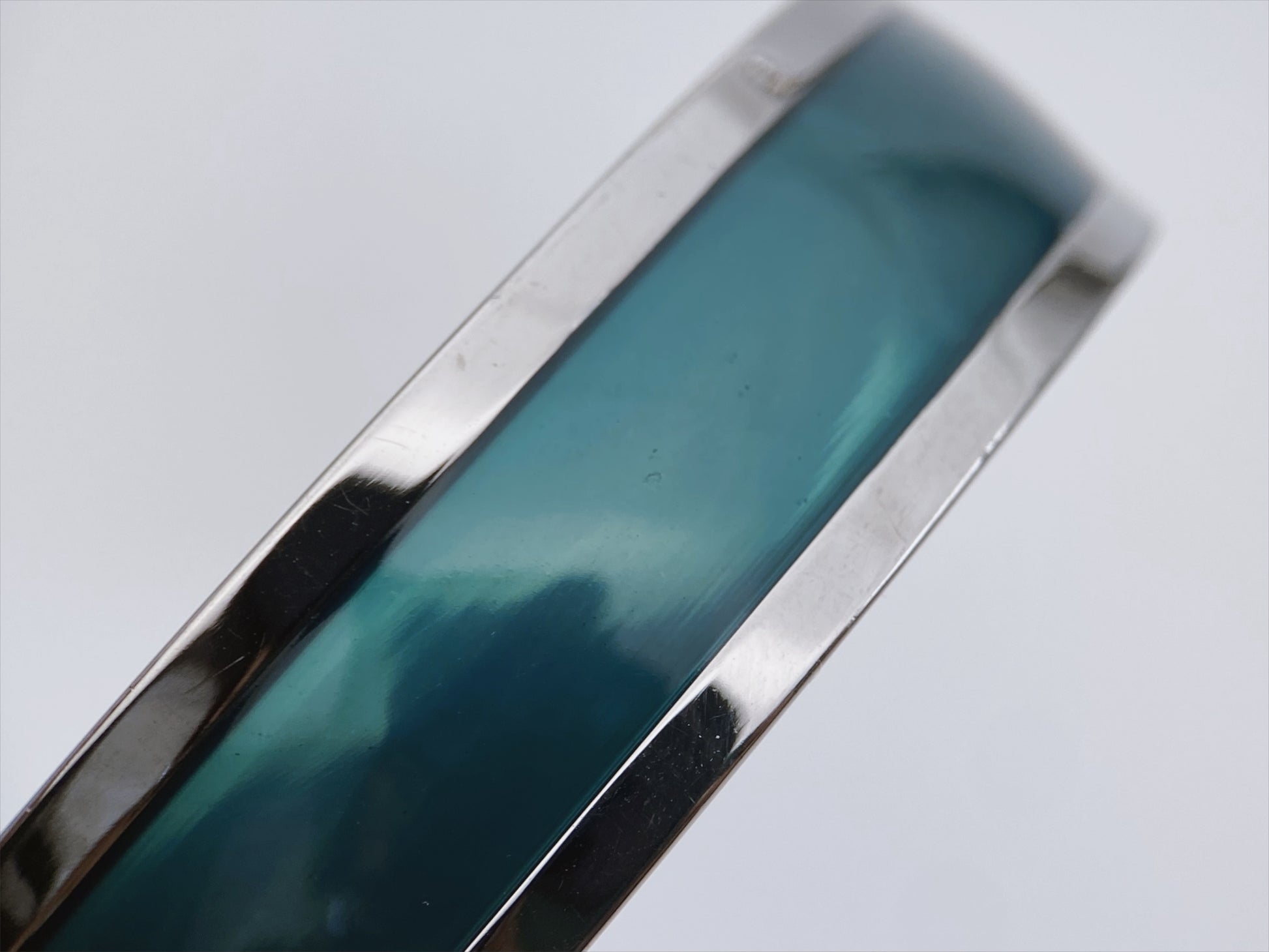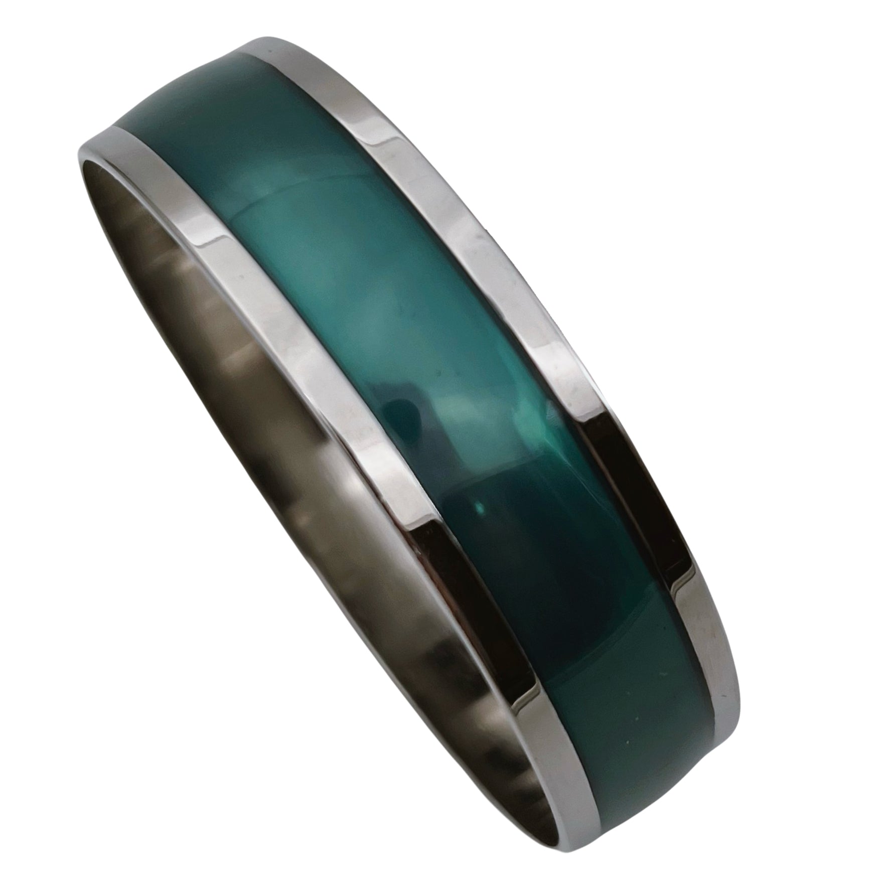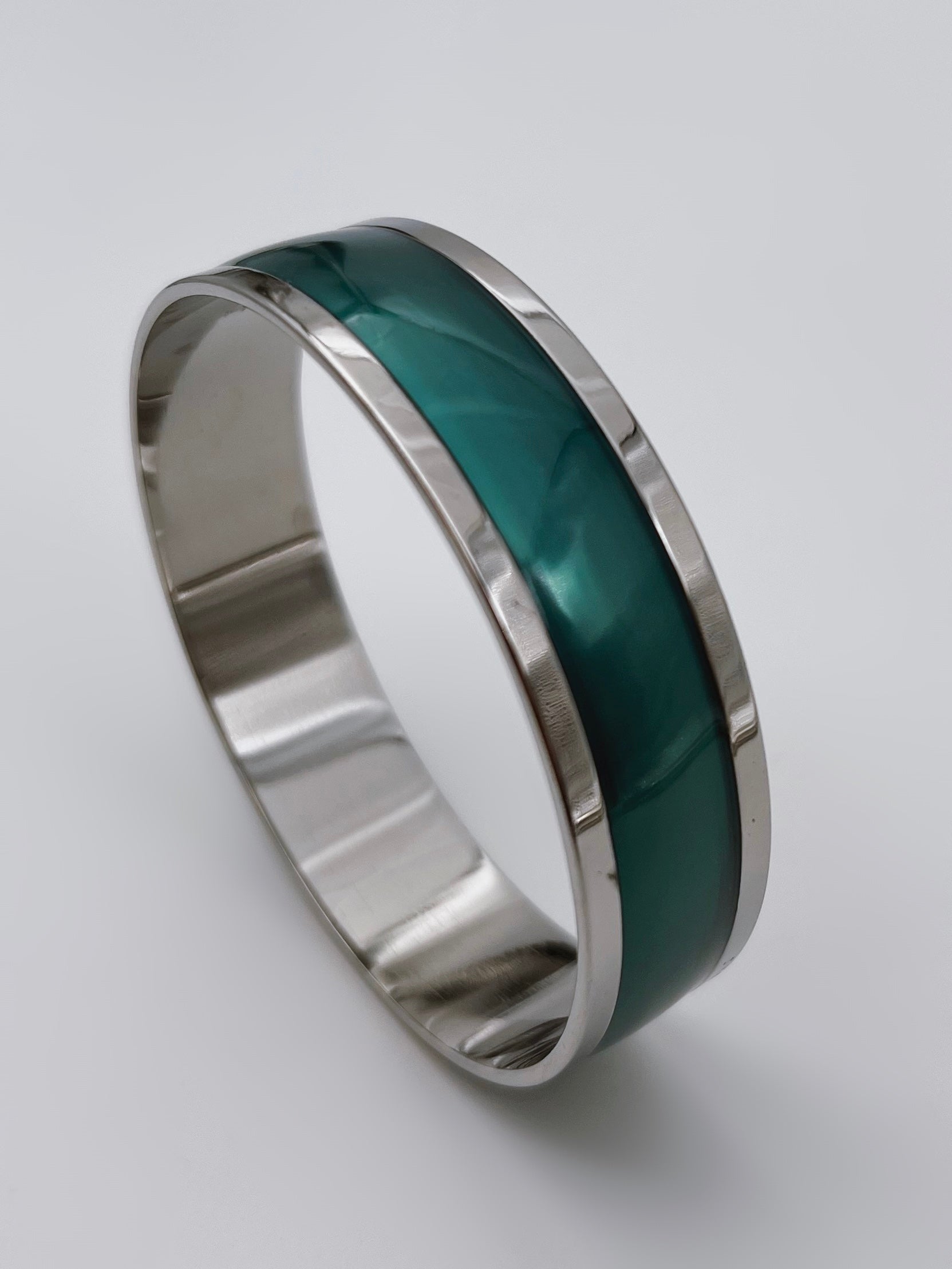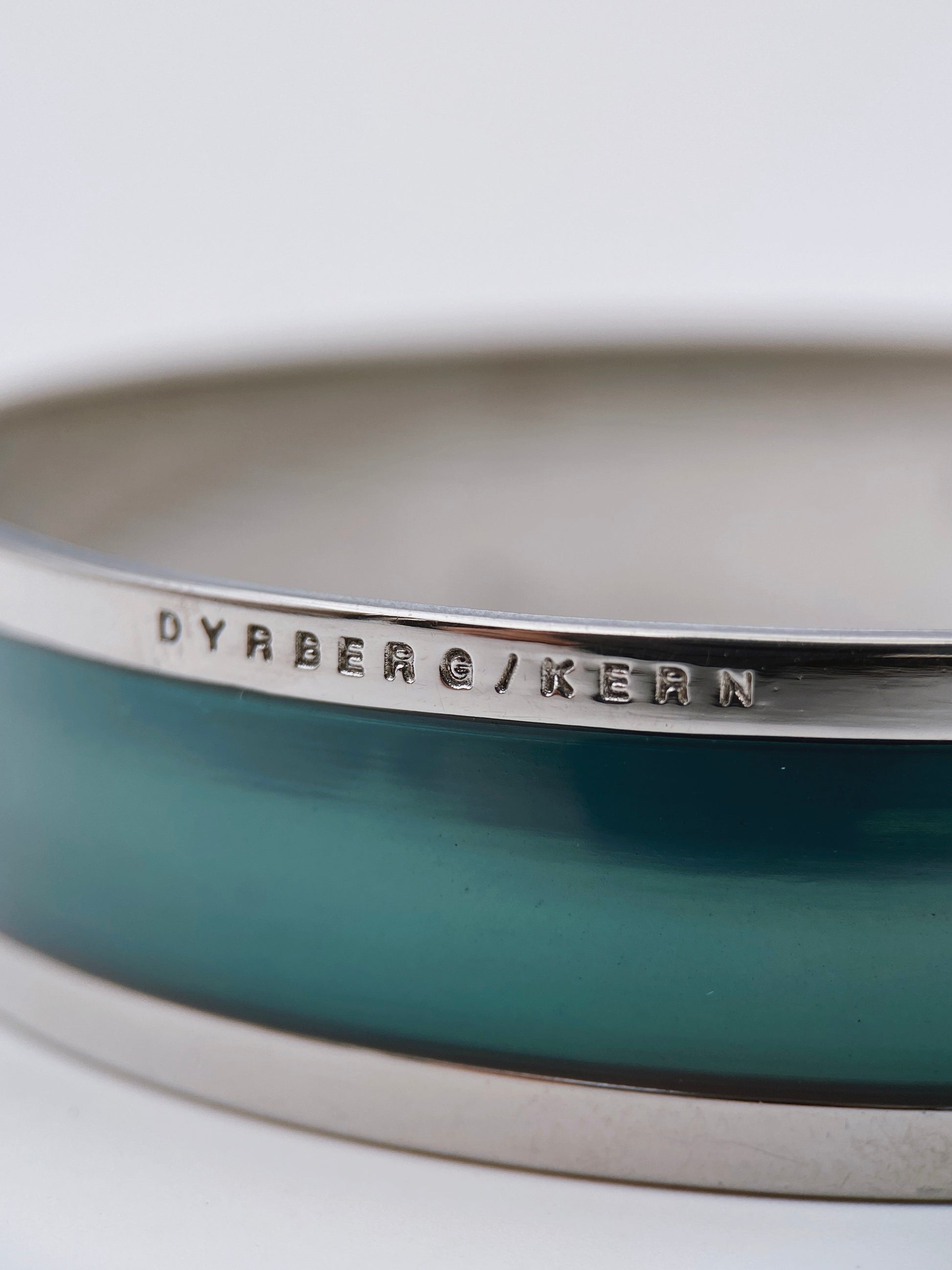 Šiuolaikinio dizaino DYRBERG/KERN standi apyrankė, pagaminta iš aukštos kokybės nerūdijančio plieno, puošta plačiu žalsvai mėlynu, perlamutriniu efektu spindinčiu intarpu.