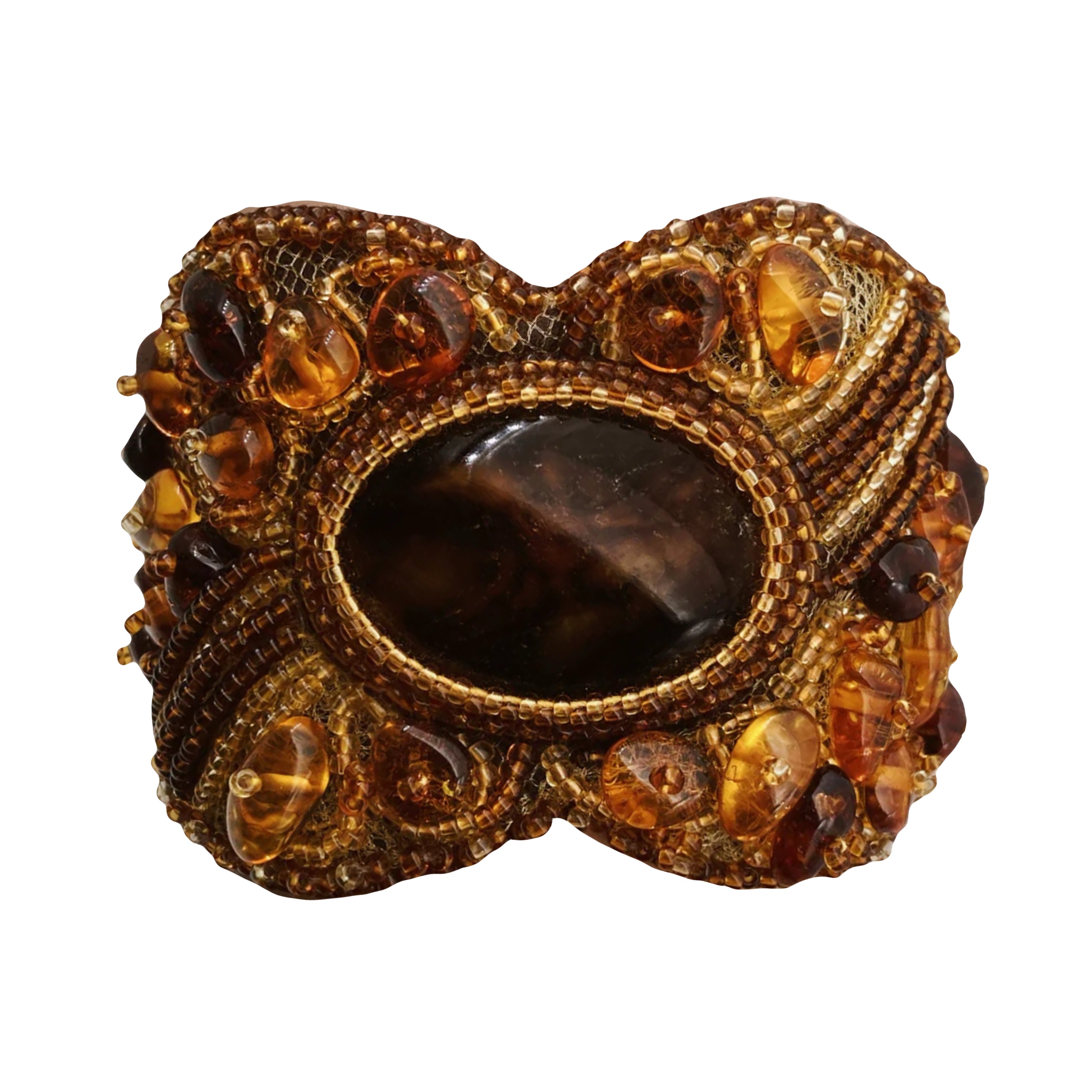 Ši apyrankė yra išskirtinis meninio gintaro siuvinėjimo pavyzdys – rankų darbo kūrinys, kur natūralus Baltijos gintaras derinamas su smulkiomis karoliukų mozaikomis, siuvinėtais raštais ir tekstile (tinkleliu, siūlais). Ji pasižymi sodria barokine / etnine estetikos derme. Sodrios gintaro spalvos – nuo konjako iki vyšninės – sukuria šiltą, organišką vaizdą.