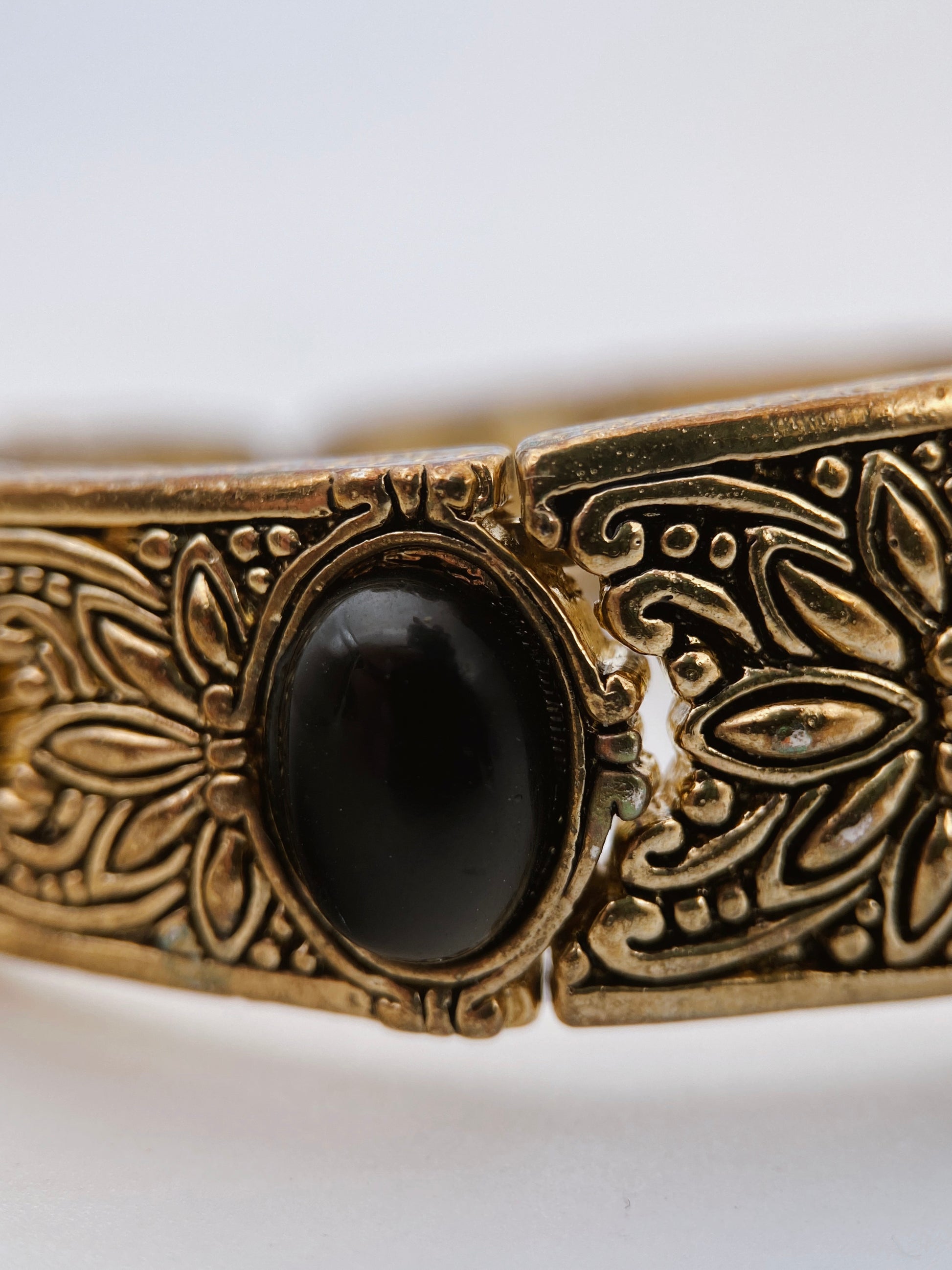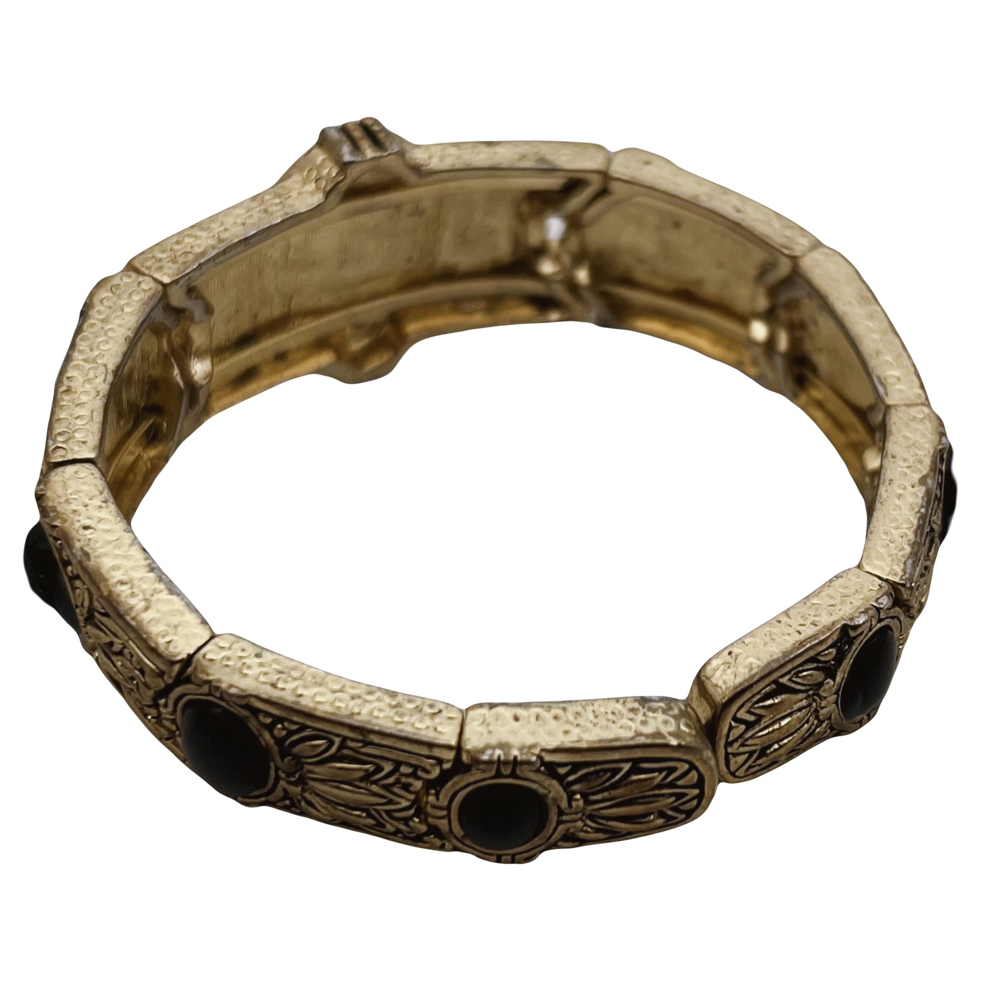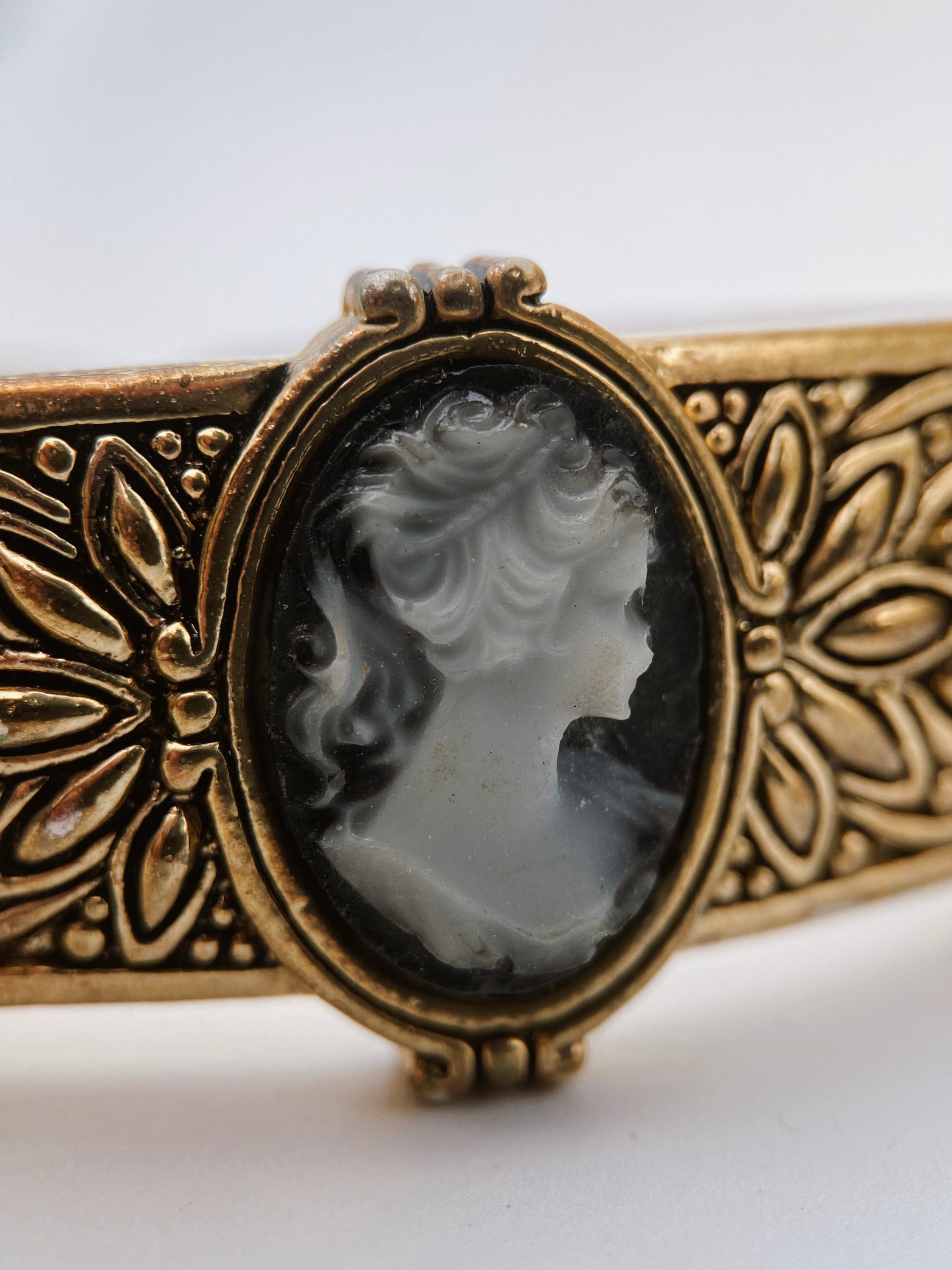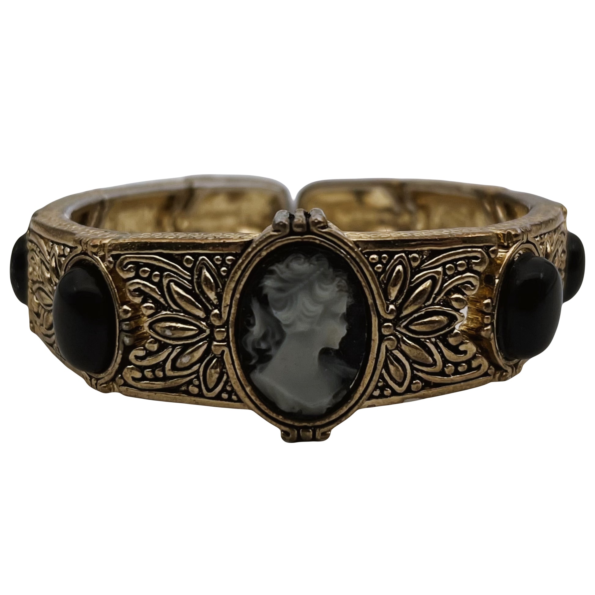 Tai retro stiliaus apyrankė su lieta kameja ir juodais intarpais, masinės gamybos, be gamintojo ženklinimo, datuojama apie 1990–2010 m. Estetika imituoja viktorijos stilių, bet gamybos technika – moderni. Lanksti apyrankė (segmentinė, su elastingu vidumi), vadinama stretch bracelet. Kameja (cameo) su moters profiliu – klasikinis motyvas, įkvėptas viktorijos laikotarpio. Metalas – auksaspalvis lydinys, be tauriųjų metalų ženklinimo. Intarpai – dirbtiniai onikso tipo ovalai (juodi) ir kameja, kuri, remiantis tekstūra, greičiausiai yra lieta iš dervos. Gėlių raštai tarp portretų – sukuria įspūdį, kad tai senoviška, tačiau technika moderni.