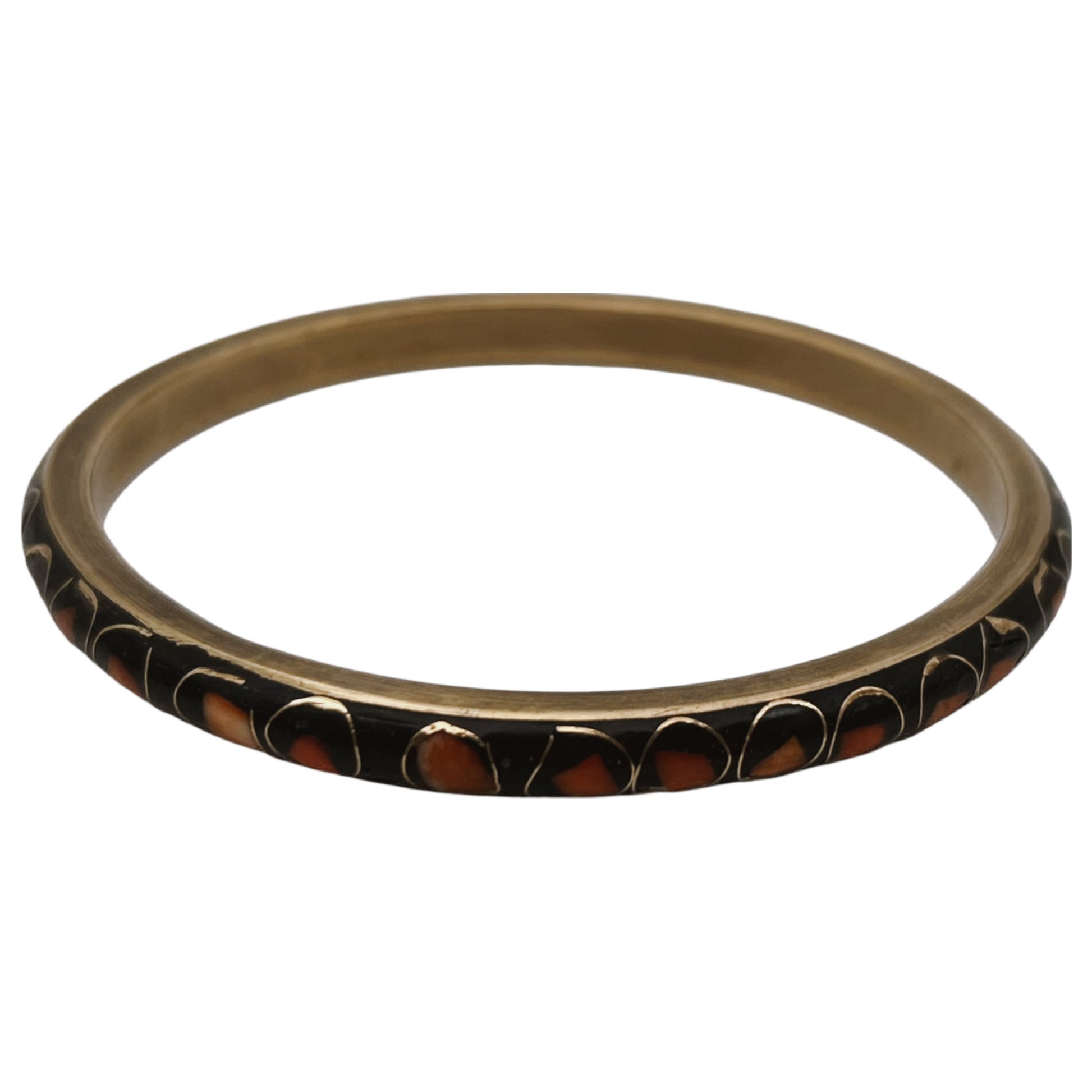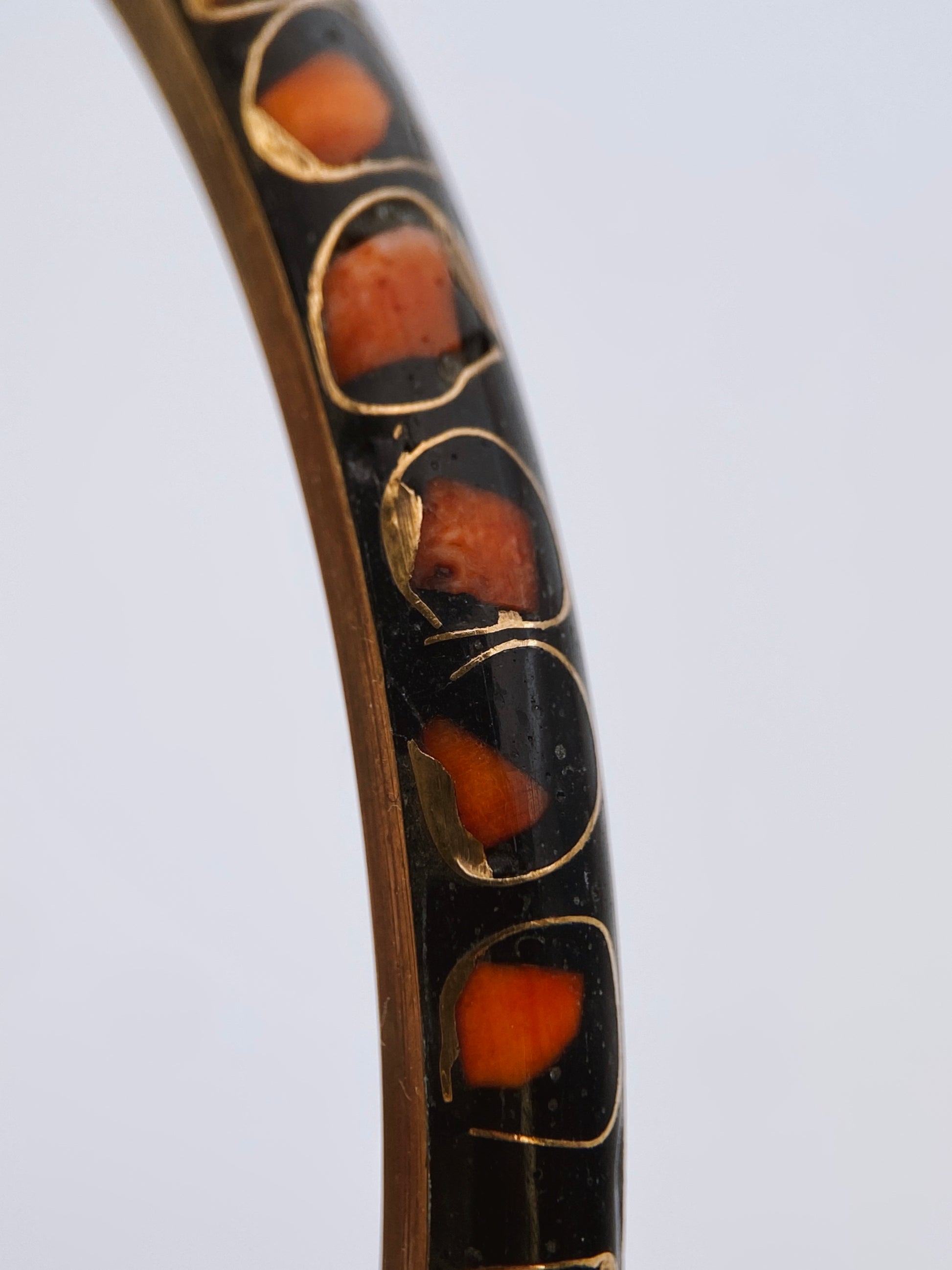 Ši apyrankė – tai vintažinė inkrustuota vario (arba žalvario) “bangle” tipo apyrankė, dekoruota juodu emaliu ir raudonais akmens ar koralo fragmentais, įtvirtintais dekoratyviuose aukso spalvos kontūruose. Dėl netolygių fragmentų ir apdailos matyti, kad tai ne masinė gamyba, o rankų darbo dirbinys.