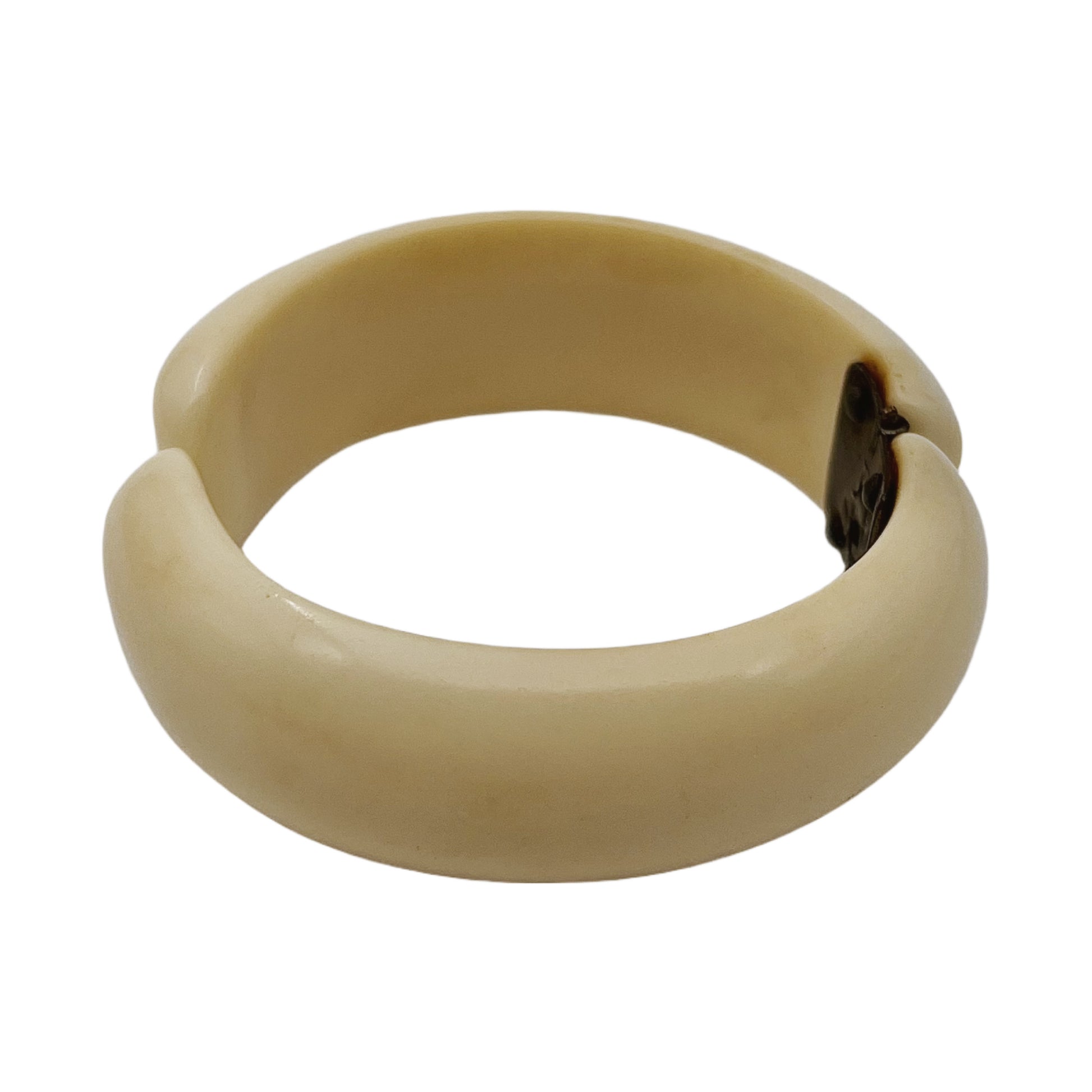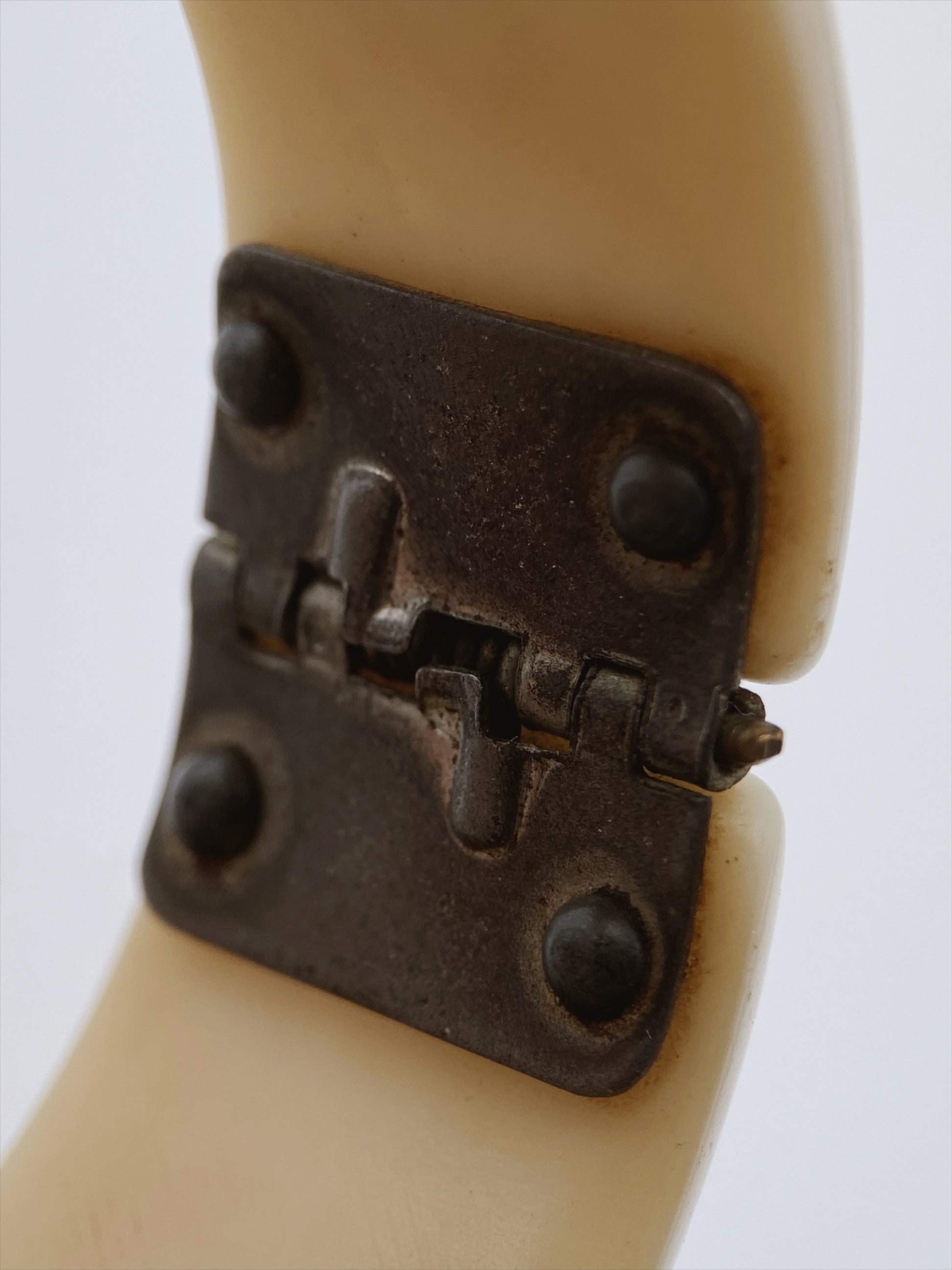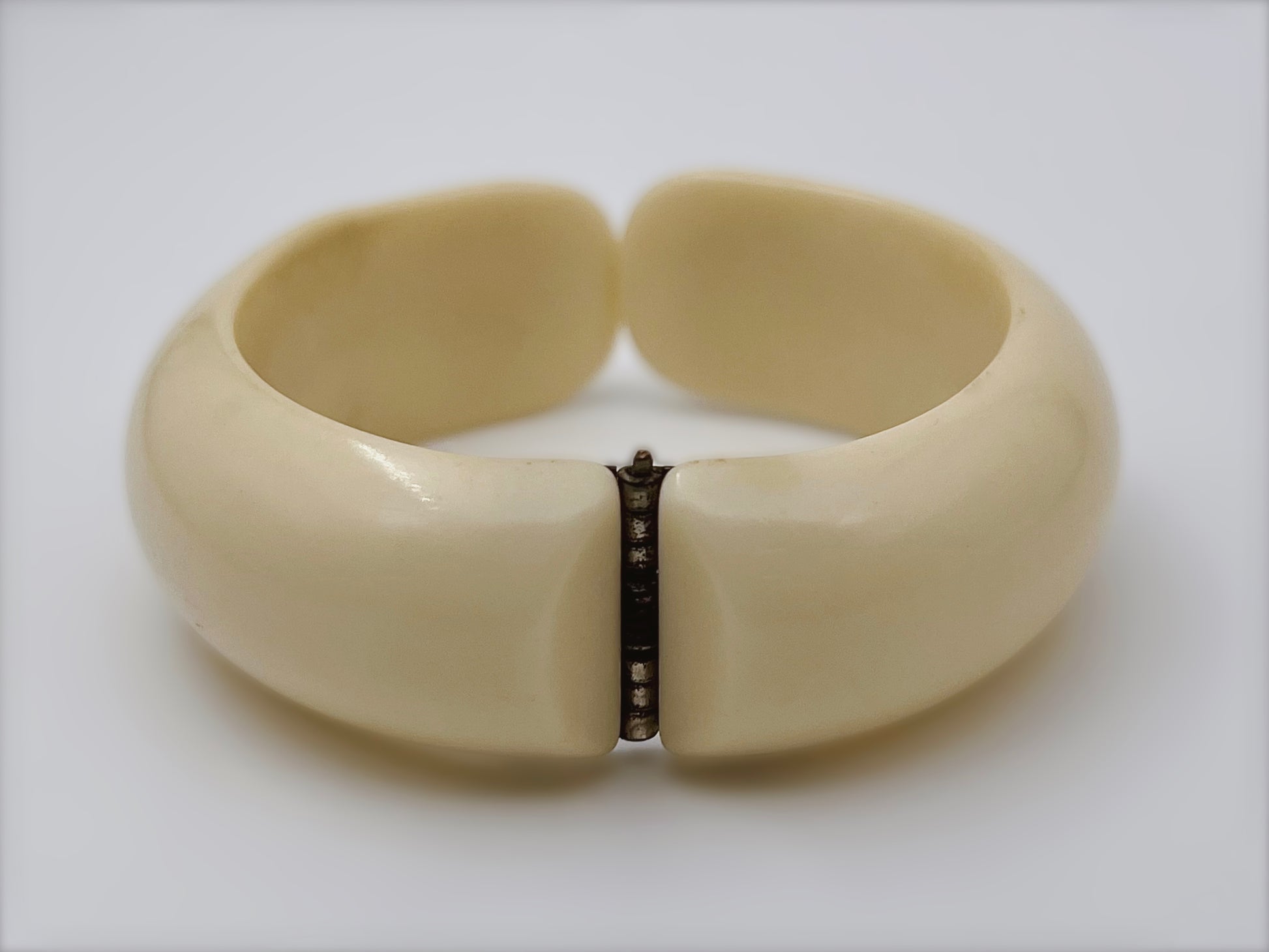 Ši apyrankė, pagaminta 1930–1940 m., vadinamuoju Art Deco laikotarpiu. Matosi gana sudėtingas, keturių kniedžių metalinis vyris, kuris yra klasikinis „piano hinge“ stiliaus. Būklė ir metalo oksidacija rodo autentišką seną gamybą. Apyrankė yra plati ir apvali – tai būdinga 1930–1940 m. apyrankėms. Masė ir stambumas rodo, kad tai ne šiuolaikinis reprodukcinis papuošalas. Atviro tipo apyrankė gerai išsilaikiusi, metalas oksiduotas - tai patvirtina autentiškumą. Kolekcionieriai ypač vertina šviesios spalvos (ivory, cream) ir geros būklės apyrankes su originaliais vyriais.