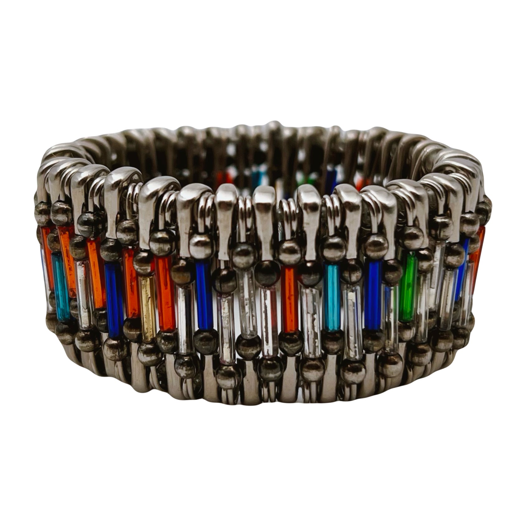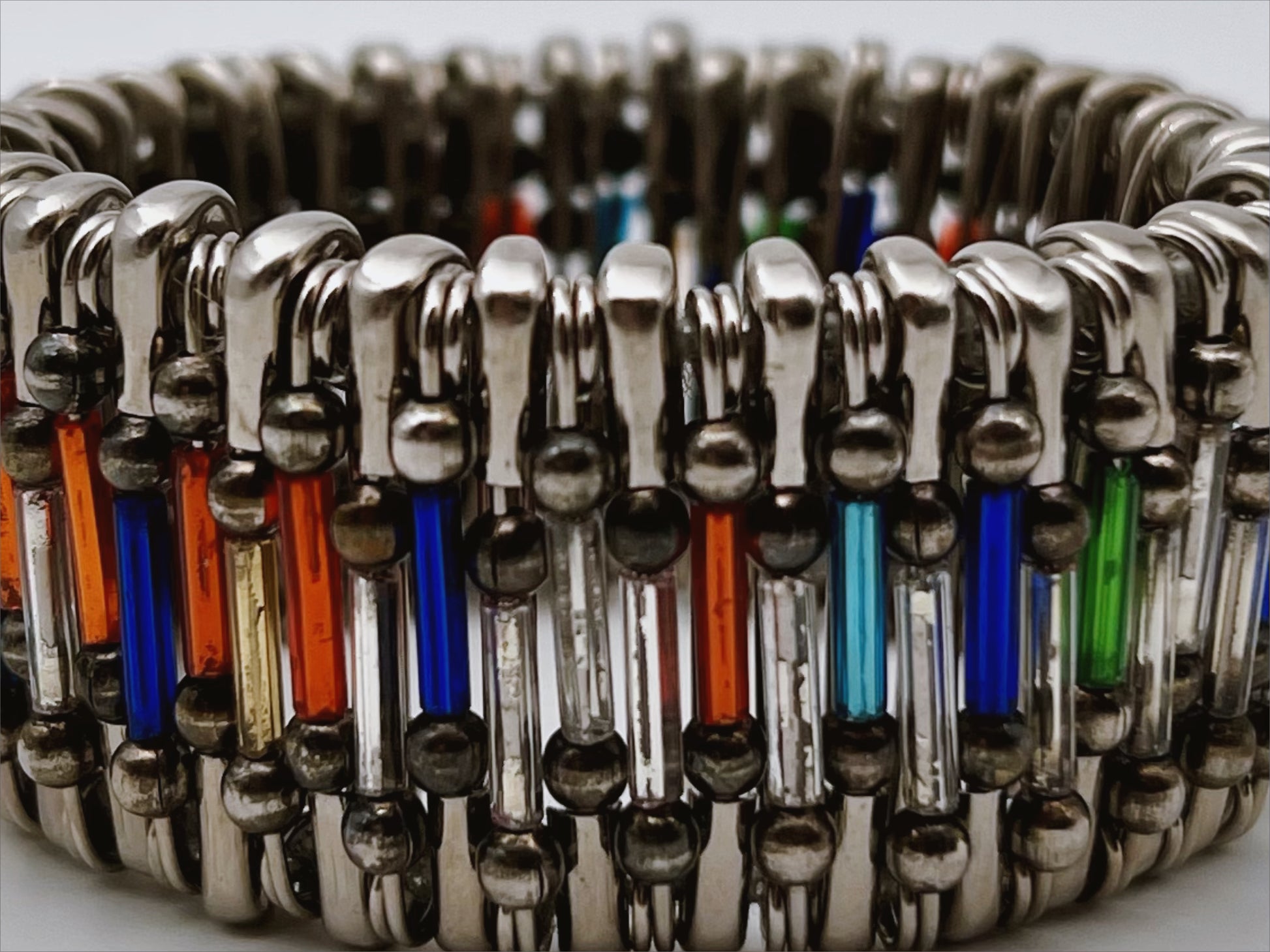 Tai rankų darbo dizaino pavyzdys, sukurtas iš žiogelio (safety pin) tipo elementų ir spalvotų cilindrinių stiklo karoliukų. Tokios apyrankės dažnai laikomos vintažinio stiliaus ar net folk art / boho papuošalais, kurių populiarumas išaugo XX a. pabaigoje. Kiekviename segtuke įvertas spalvotas stiklo vamzdelio formos karoliukas. Spalvos – oranžinė, mėlyna, žalia, bespalvė, žydra ir pan., išdėstytos pakaitomis, sudarant vizualinį ritmą. Apyrankė tampri, sujungta su elastine virvele, leidžiančia ją lengvai užsidėti. Konstrukcija tanki, sunki, solidžiai laikanti formą.