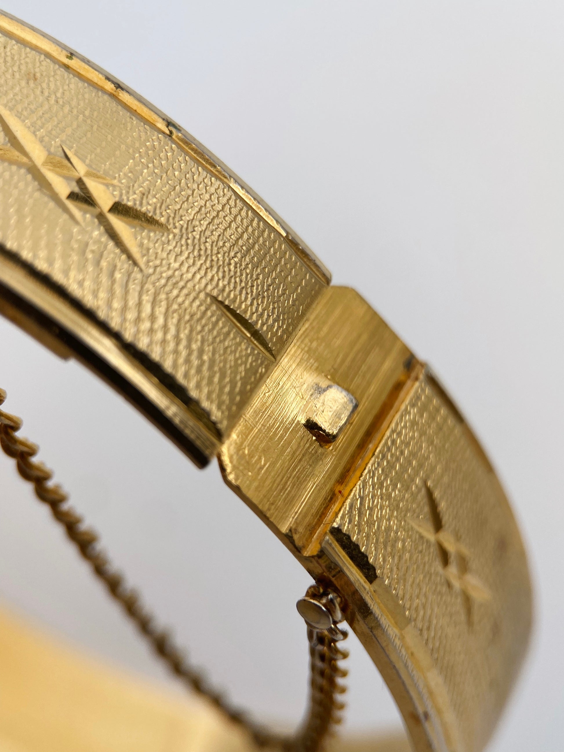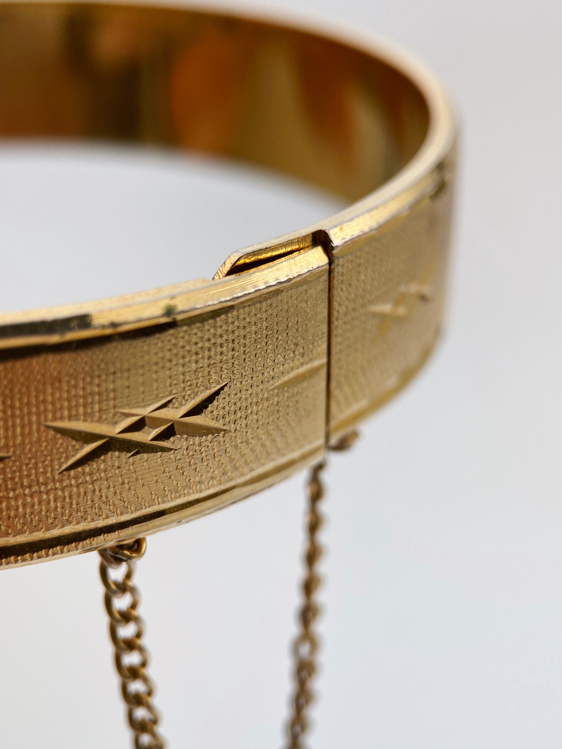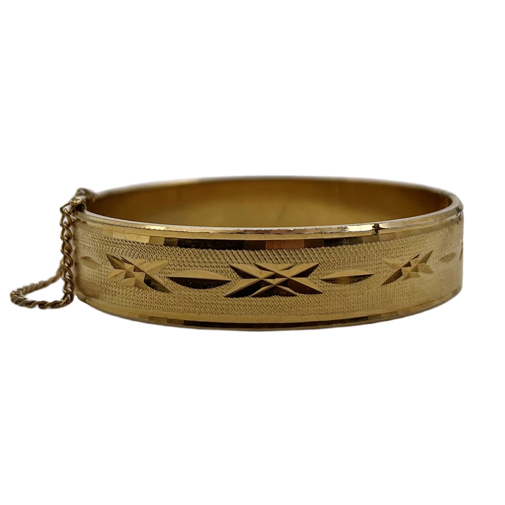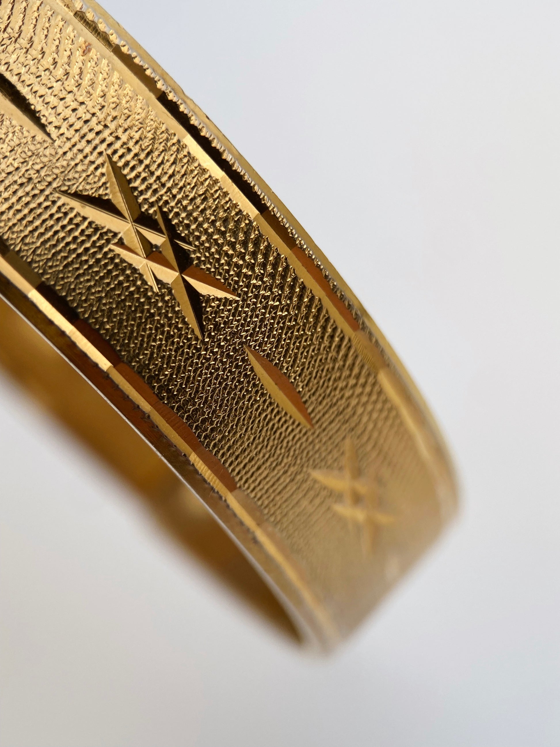 Vintažinė britiška paauksuota apyrankė su vyriniu užsegimu ir saugos grandinėle. Paviršius dekoruotas klasikinio „žvaigždžių spindesio“ (starburst) raštu ant subtiliai tekstūrinio aukso fono. Tai tipiškas 1950–1970 m. Jungtinėje Karalystėje gamintų vakarinių papuošalų stilius, išsiskiriantis elegantiška konstrukcija ir šiltu, sodriu aukso atspalviu. Apyrankė be gamintojo žymėjimo, tačiau meistrystė ir graviruotas paviršius rodo aukštos kokybės gold-plated / rolled gold darbą, būdingą britiškai mados juvelyrikai (pvz., Exquisite, Miracle, Stratton laikotarpio).