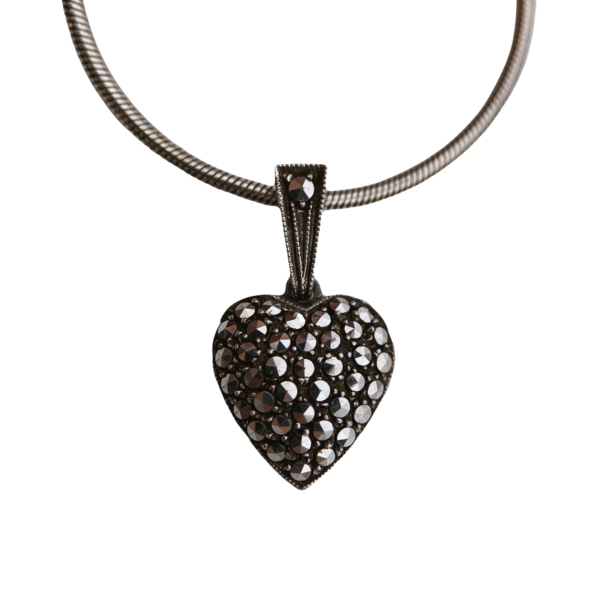 Sudėtis: sidabras, markazitas Būklė: labai gera Išmatavimai (pakabukas): 1,3 x 1,1 cm Išmatavimai (grandinėlė): 46 cm Spalva: sidabro Žymėjimas (grandinėlė): “Argento 925” Žymėjimas (pakabukas): "Silver sterling" Šalis: Italija / JK Laikotarpis: 1970-1990 metai Rinkos vertė: 50-70 EUR