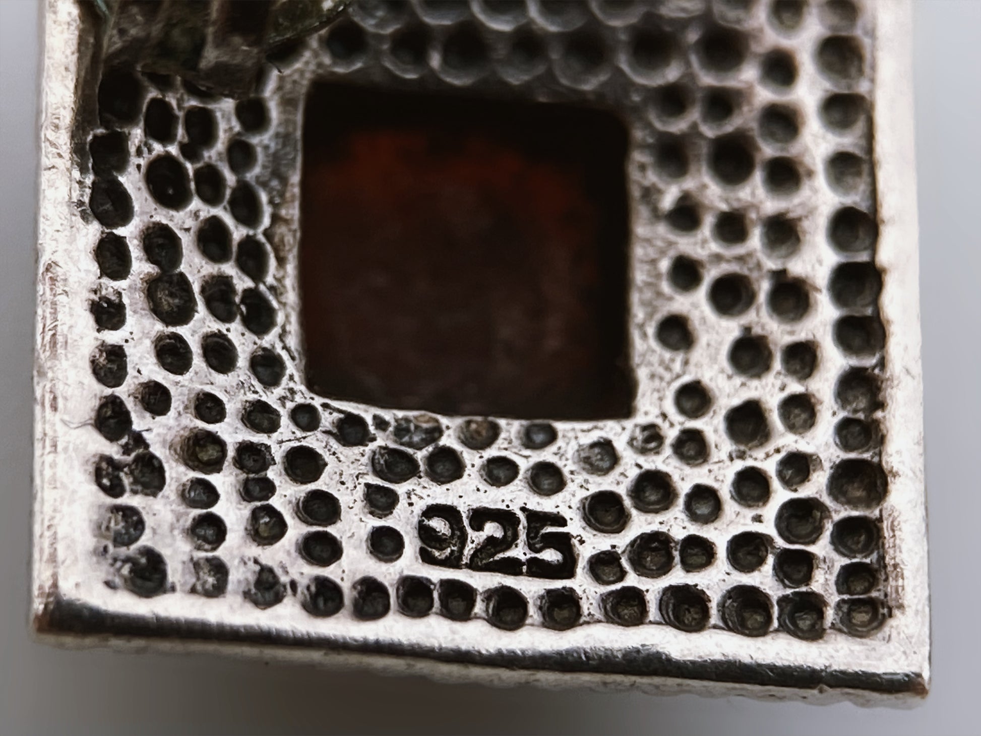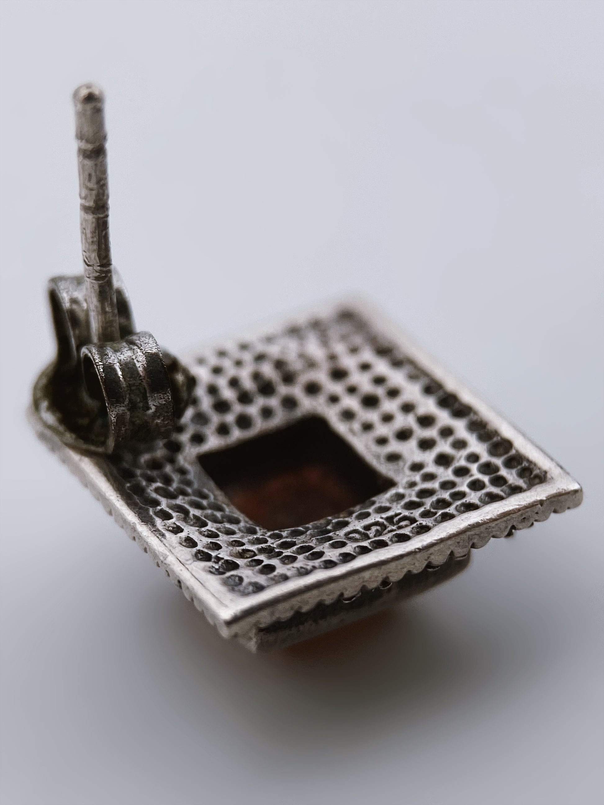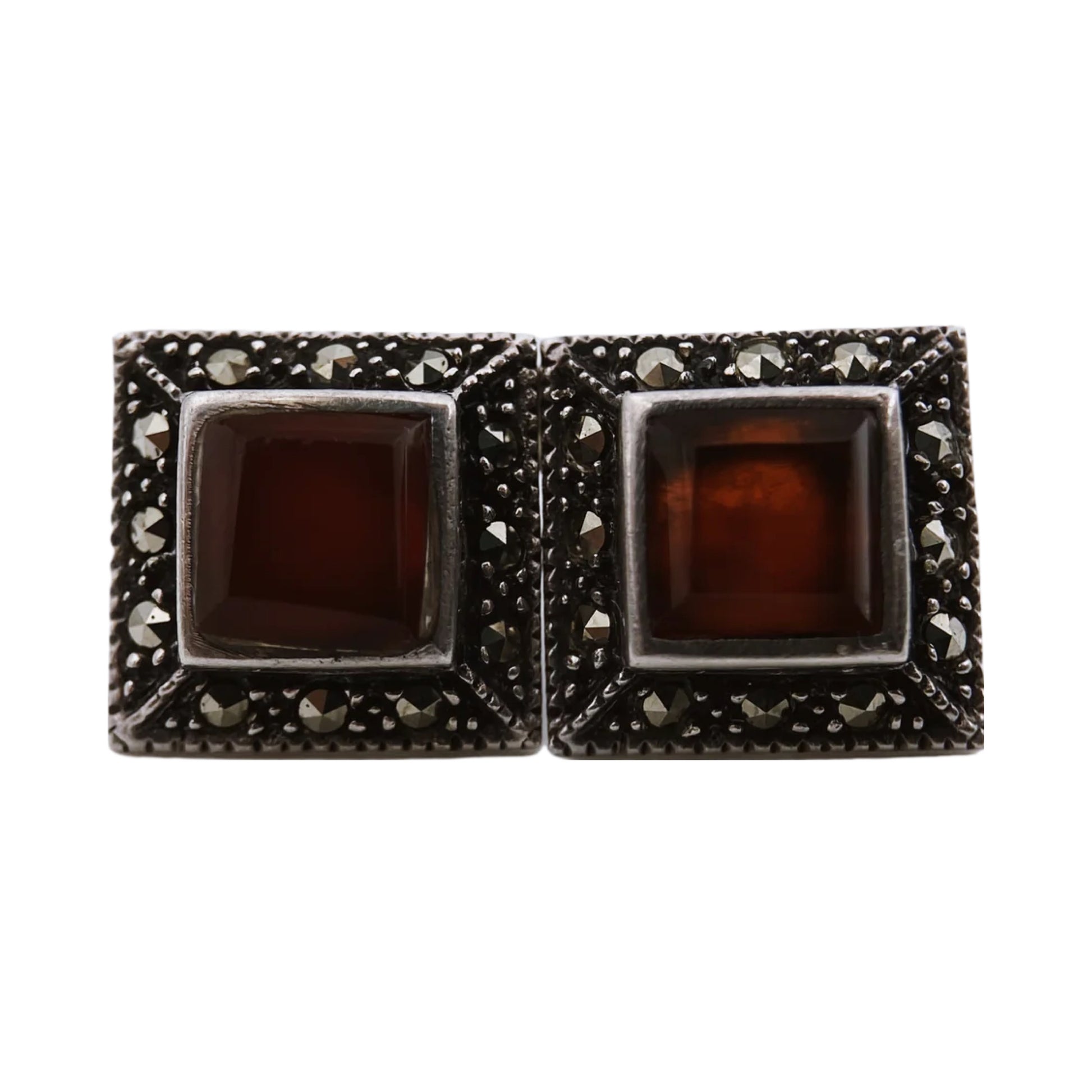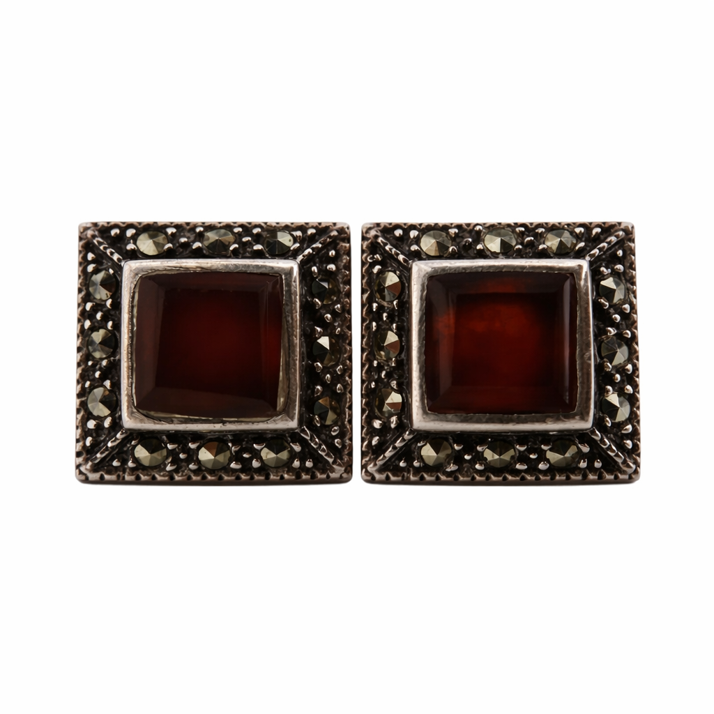 Elegantiški kvadratiniai auskarai, pagaminti iš sidabro (925), dekoruoti sodrios tamsiai raudonos spalvos granatais. Aplink centrinius akmenis išdėstyti smulkūs markazitai, suteikiantys papuošalui išskirtinio žvilgesio ir Art Deco stiliaus įspūdį.