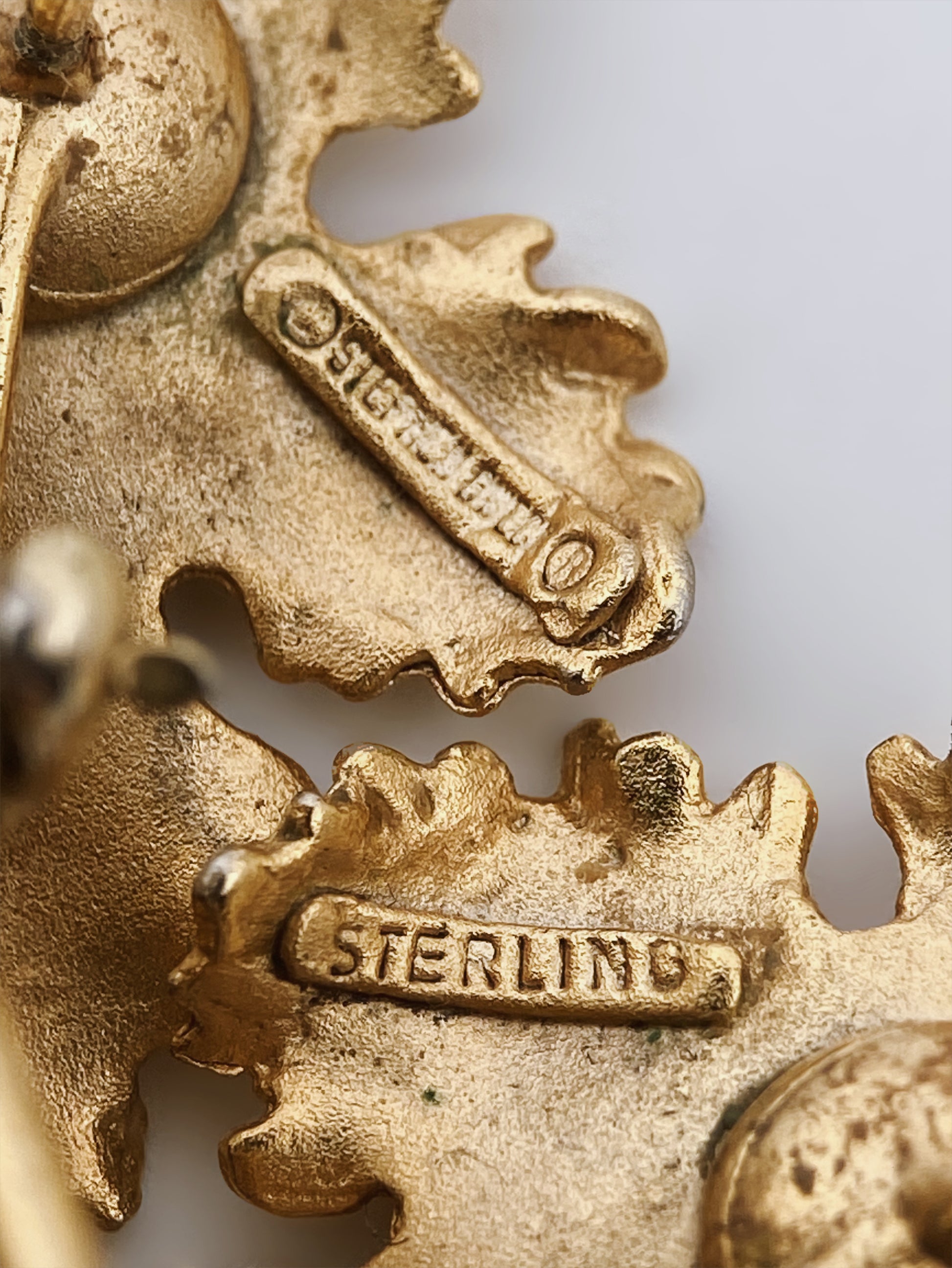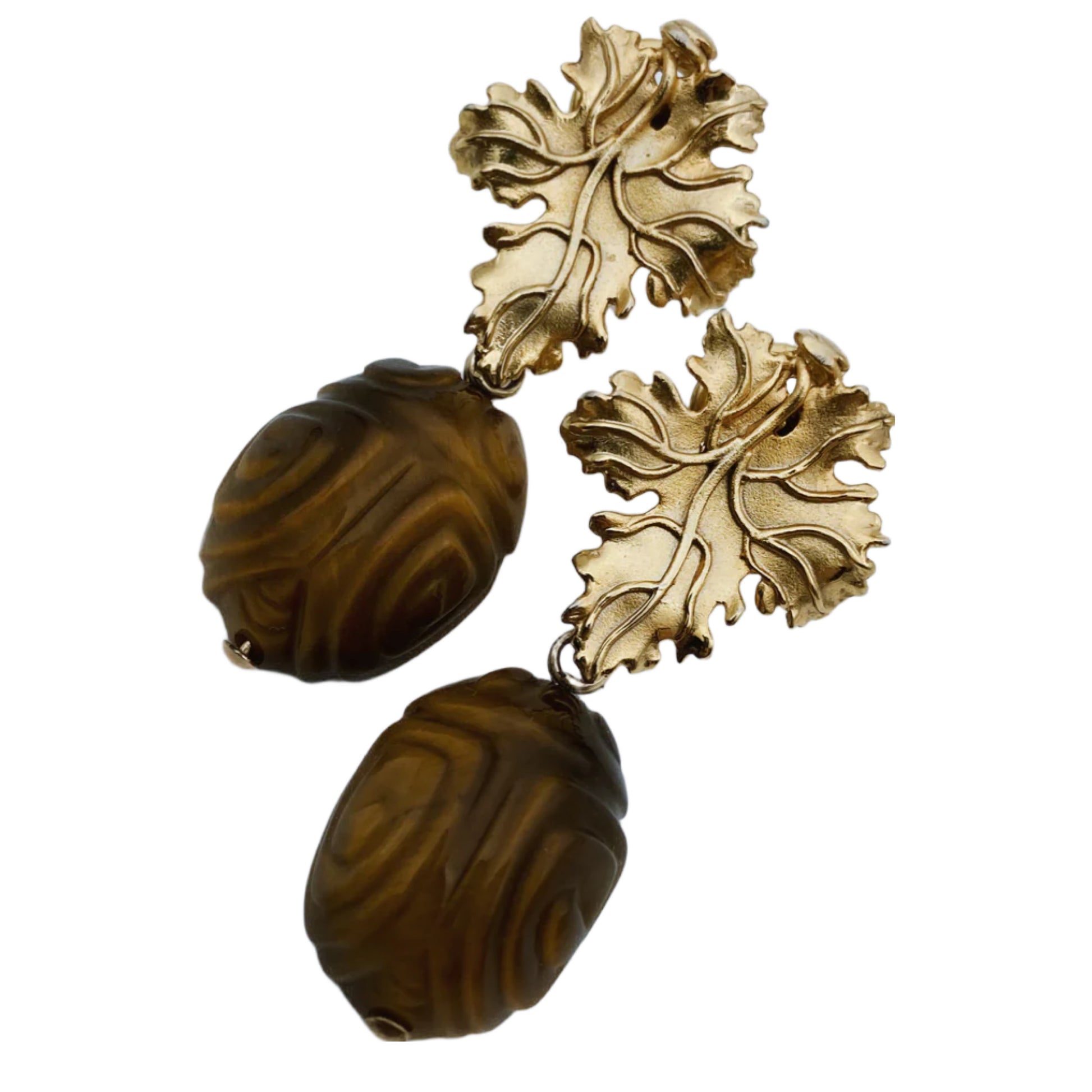 Išraiškingi „Stephen Dweck“ auskarai, pagaminti iš paauksuoto sidabro su ąžuolo lapų motyvu ir raižytais ornamentuotais akmenimis. Raižyti natūralūs rudo agato akmenys suteikia auskarams žemišką prabangą ir organišką tekstūrą. Tai ne šiaip papuošalas – tai dėmesį prikaustantis stiliaus pareiškimas (statement piece), sukurtas išsiskirti ir papildyti drąsią asmenybę. Ąžuolo lapų motyvas – ne tik išraiškingas, bet ir būdingas ankstyvam Dweck stiliui. Tai ne serijinė masinė gamyba, o kolekcinis, meninis kūrinys.