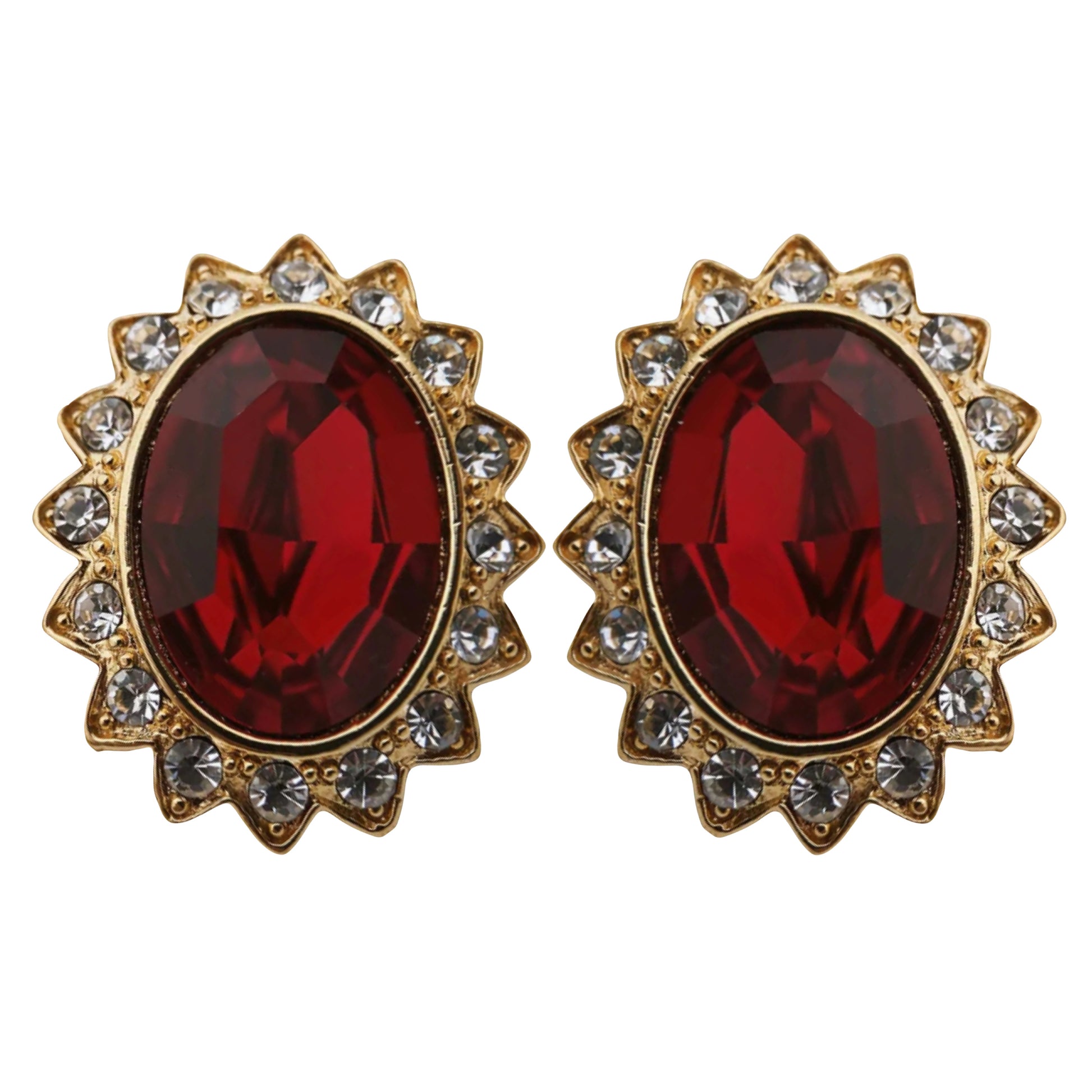 Šie auskarai su raudonais stiklo akmenimis ir skaidriais kristalais yra pažymėti ©KJL – tai Kenneth Jay Lane (KJL) papuošalai. Pagal ženklinimą ir dizainą (masyvūs, dekoratyvūs, su ryškiais stiklo akmenimis), šie auskarai datuojami 1980–1990 m. laikotarpiu. Tai būdingas KJL vėlyvesnių kolekcijų stilius – teatrališkas, prabangus, įkvėptas aukštosios juvelyrikos, bet skirtas mados rinkai.