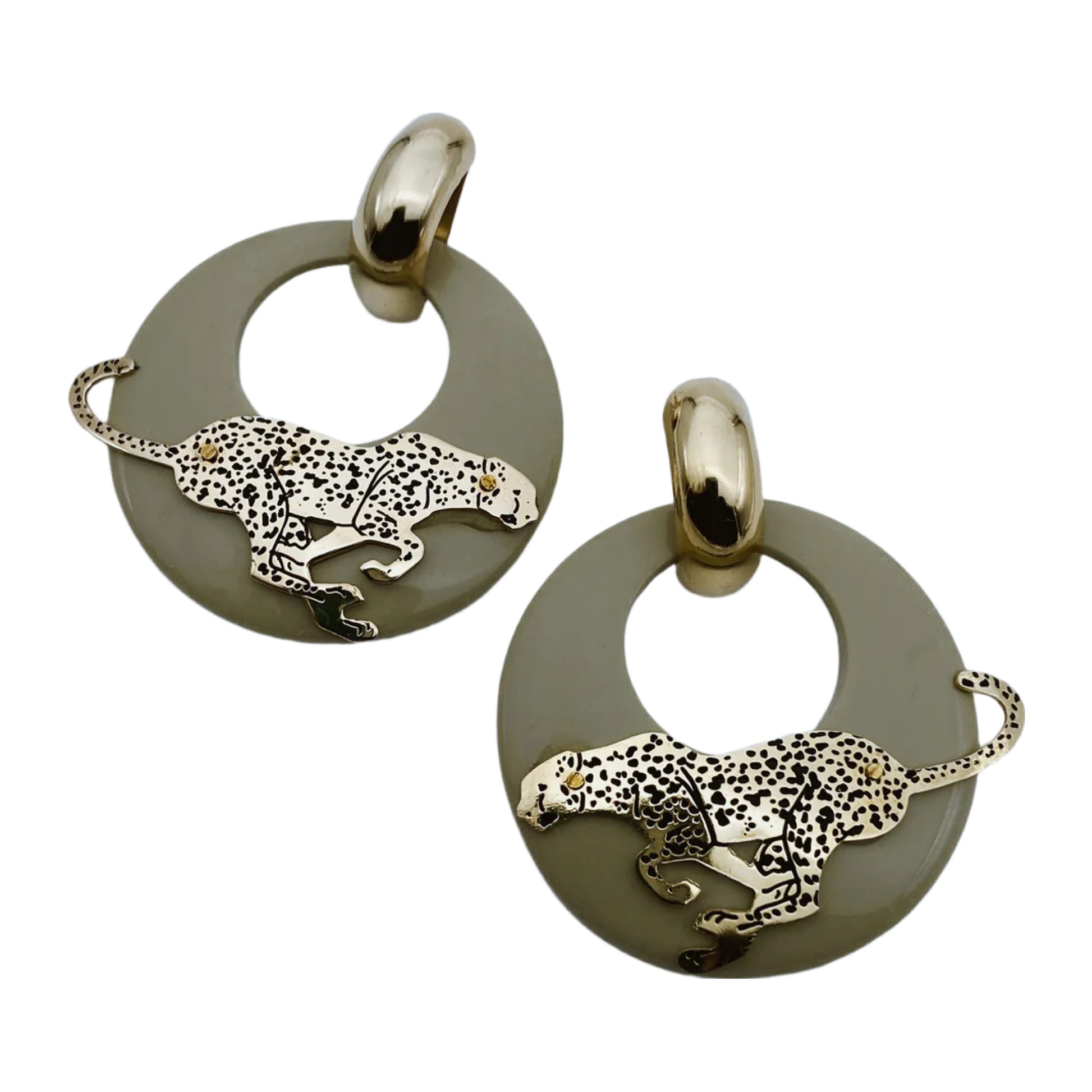 Šie auskarai išsiskiria ryškiu dizainu – apvalios šviesiai pilkos spalvos pagrindas ir stilizuota aukso spalvos leopardo figūra, bėganti per apskritimo vidurį. Tai drąsaus ir konceptualaus stiliaus aksesuaras, panašus į kai kuriuos „statement“ dizainus, naudotus 1980–1990 m., taip pat primena tam tikrus dizainerių, tokių kaip Jean-Charles de Castelbajac ar Moschino, stiliaus bruožus. Daugiau: www.etsy.com/listing/1449562914/vintage-80s-tiger-statement-earrings