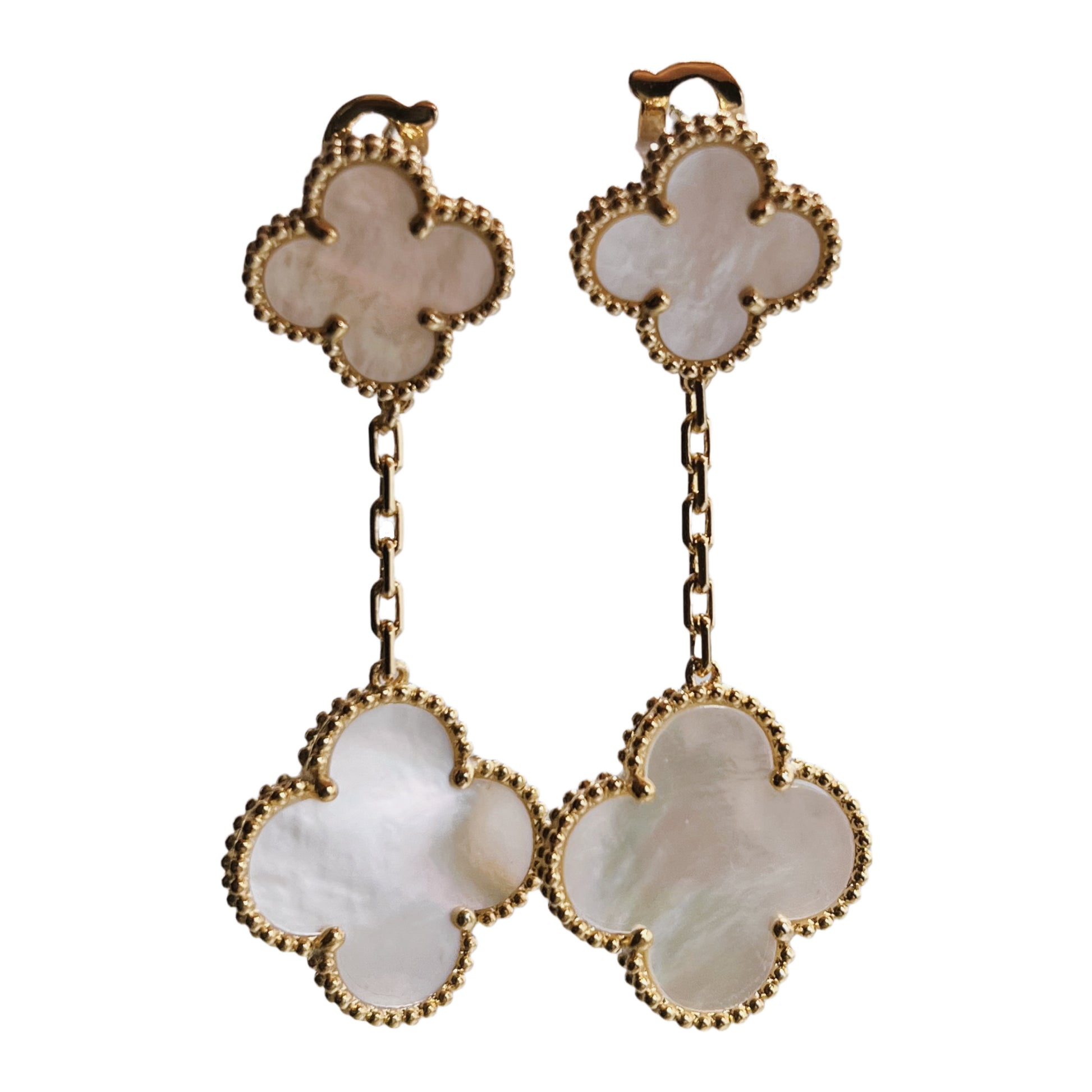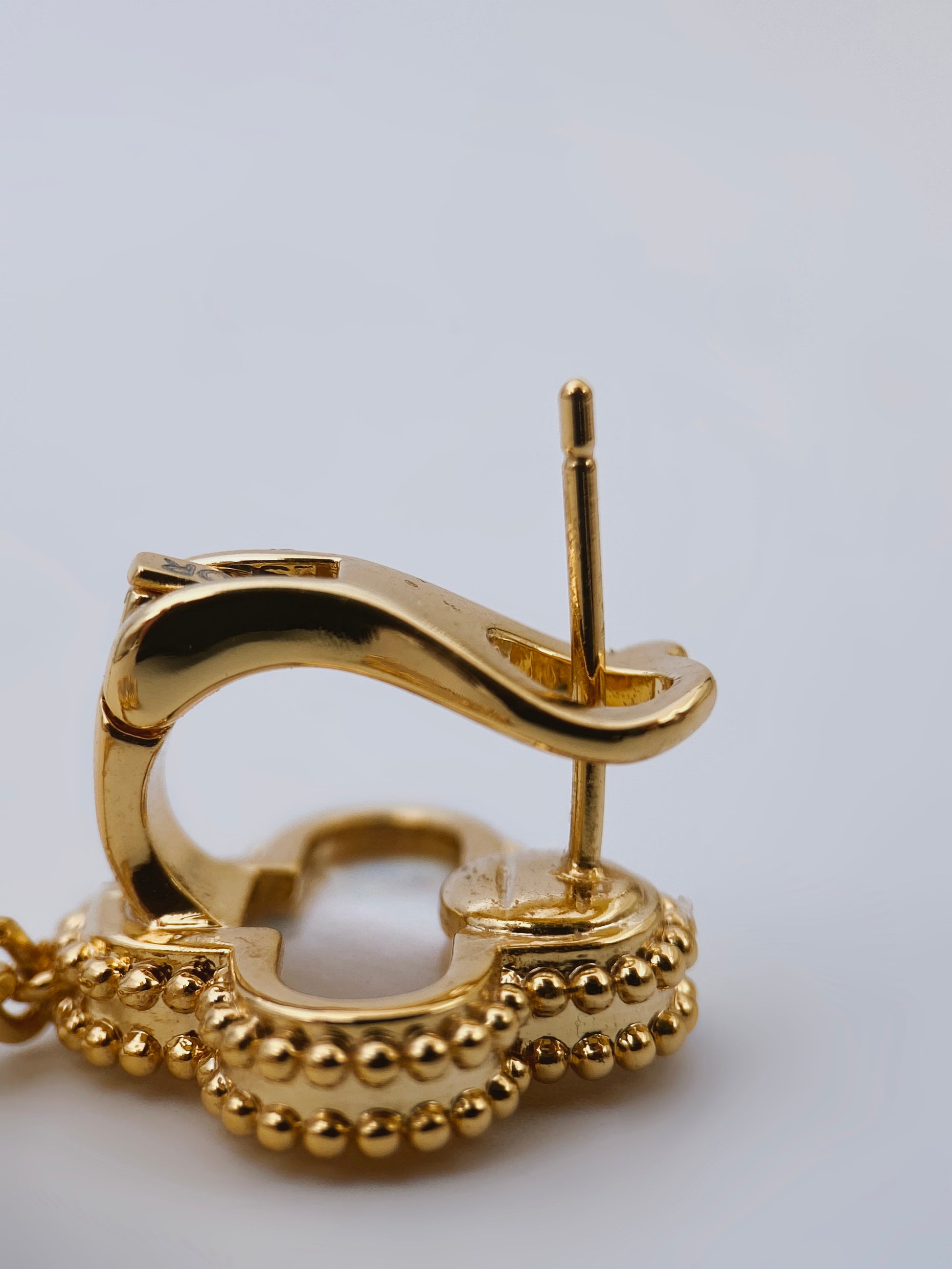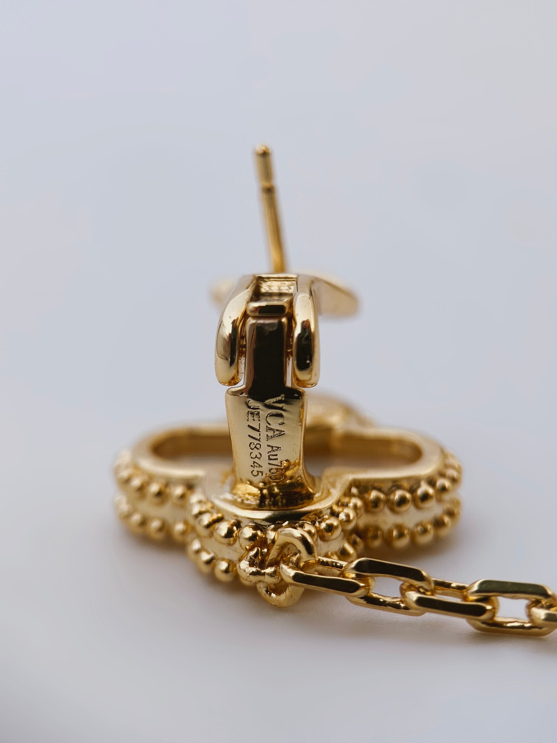 Sudėtis: paauksuotas sidabras, perlaiBūklė: labai geraIšmatavimai: 2 x 5,5 cmSpalva: aukso, rusvaŽymėjimas: “VCA 750 Au”, “JE 778132”Šalis: JAVLaikotarpis: XXI a. pr.