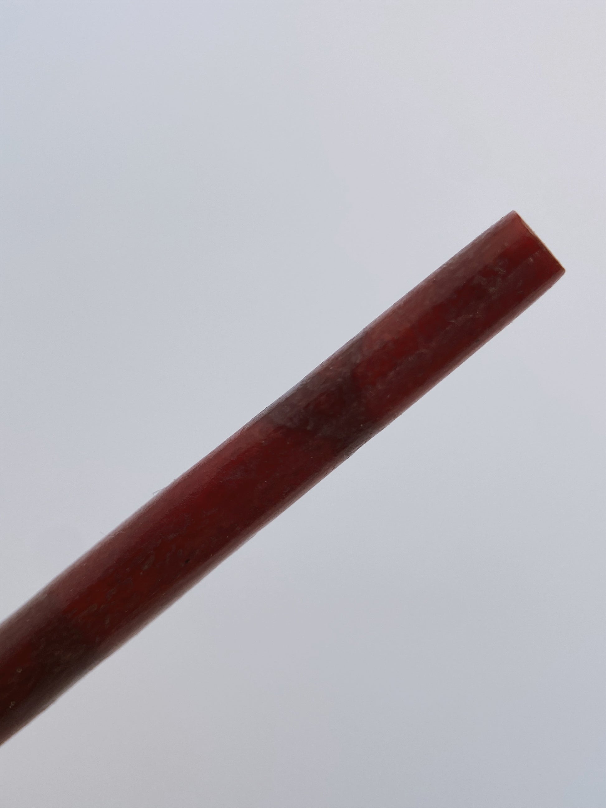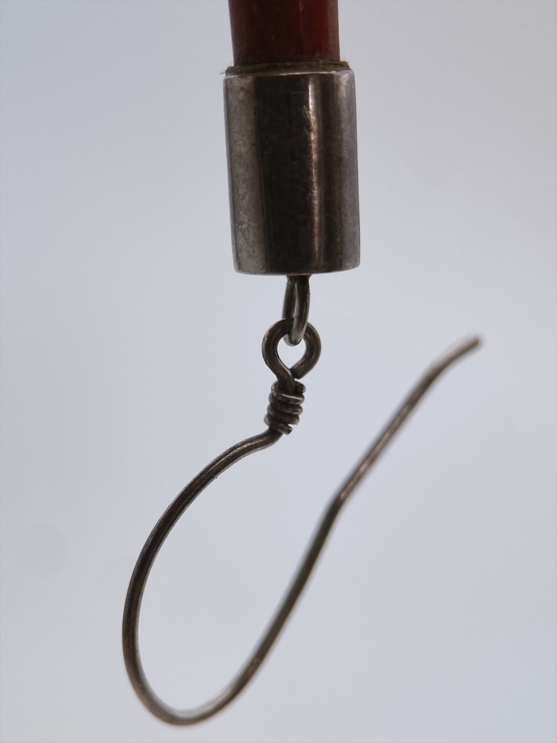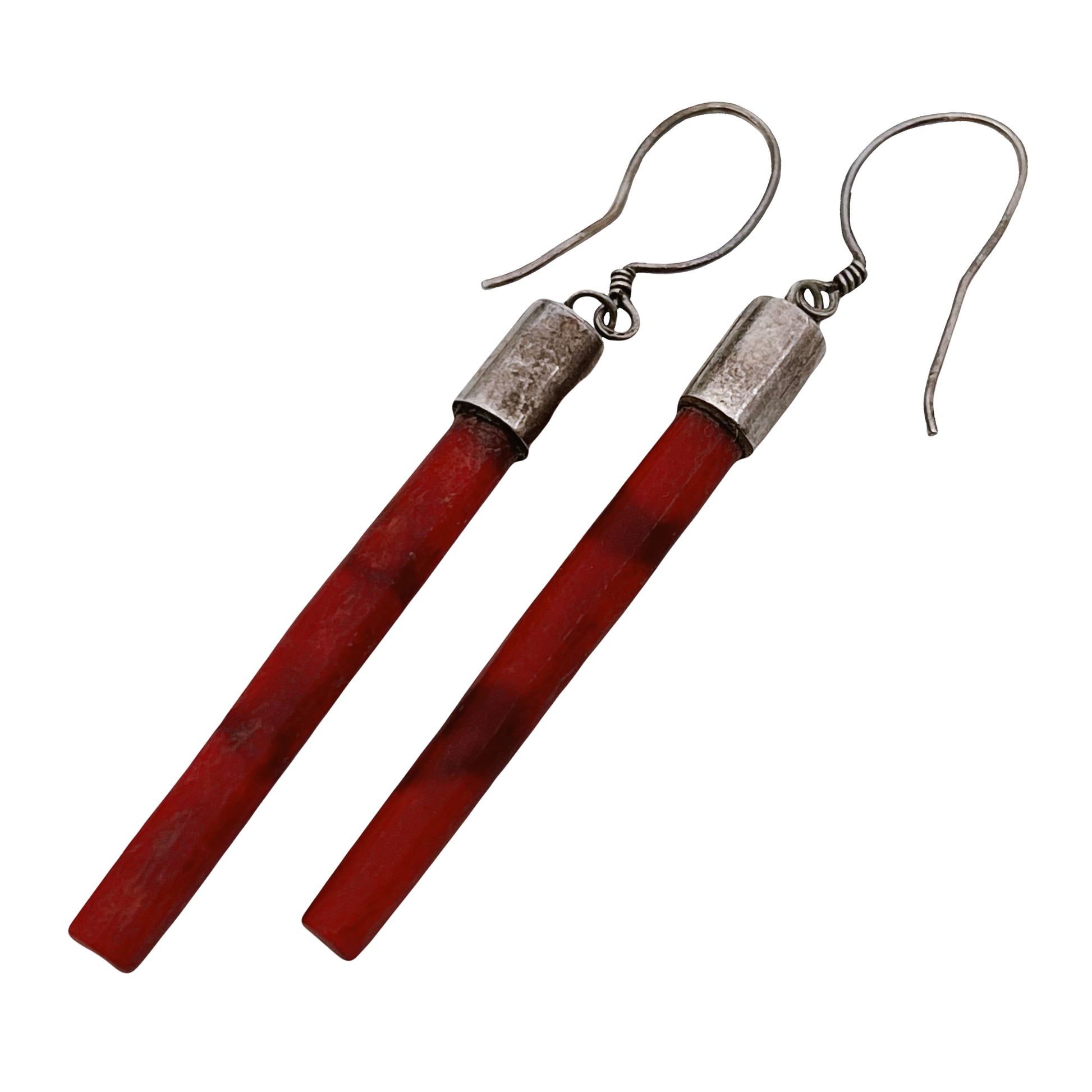 Raudonos spalvos ilgi vamzdeliai iš natūralaus koralo, viršutinės detalės – sidabras. Kabliuko tipo užsegimas – dažnas rankų darbo ar etninio stiliaus papuošalams. Etninis / minimalistinis dizainas, būdingas rankų darbo papuošalams iš Meksikos ar Šiaurės Afrikos.